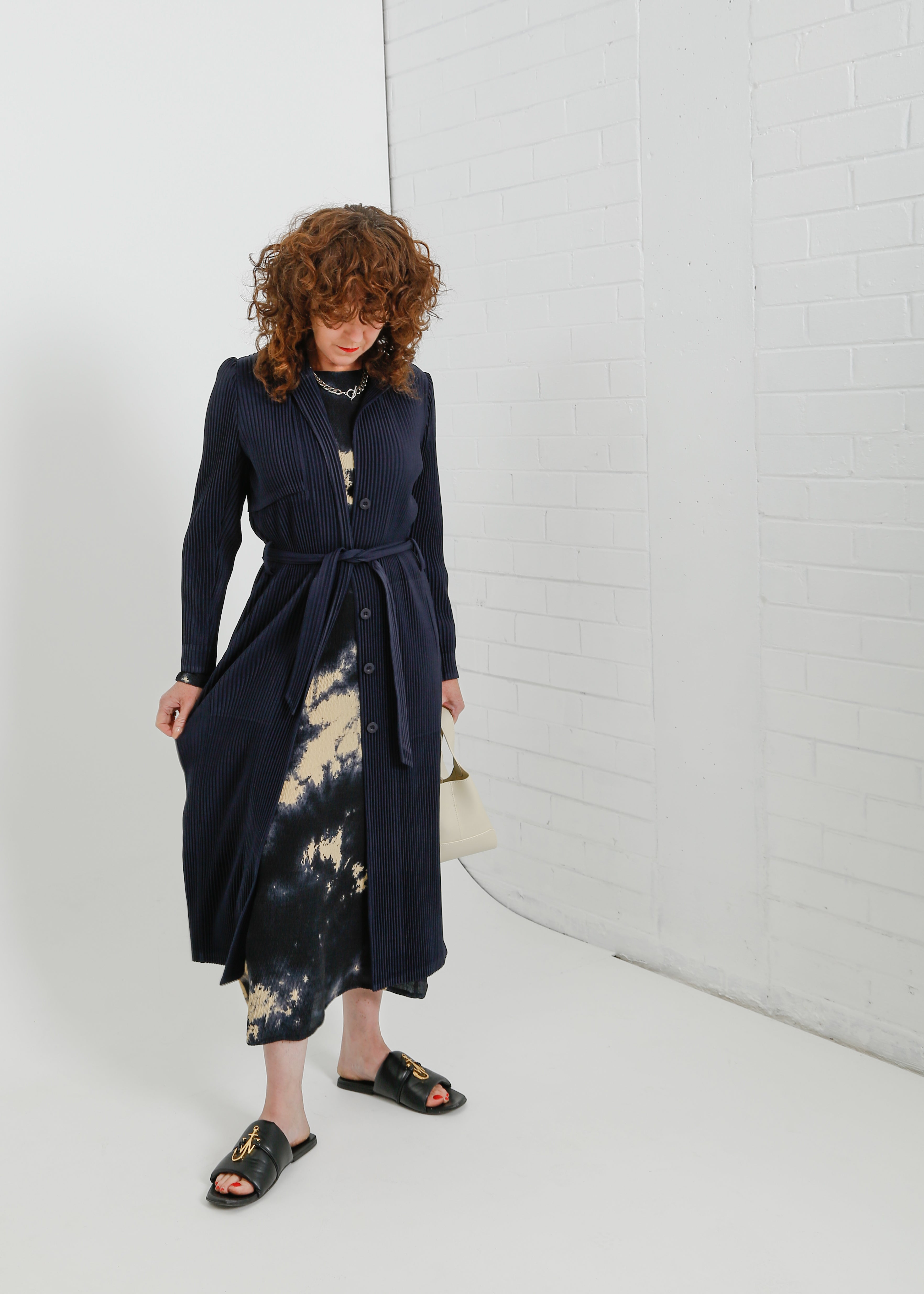 I’m absolutely in love with the ink-beige bamboo silk fabric—it has such a luxurious, smooth feel. It’s stunning in the Cleo long-sleeve dress, which features a unique bleach-wash effect that gives it a one-of-a-kind character. What really sets this dress apart, though, is the side lace-up tie detail. It offers versatility, letting you cinch the waist for a more defined silhouette or leave it loose for a relaxed, effortlessly chic look. It’s the perfect blend of elegance and ease. I’ve styled it here with an upcoming coat—stay tuned, it’s coming soon, so keep your eyes peeled!