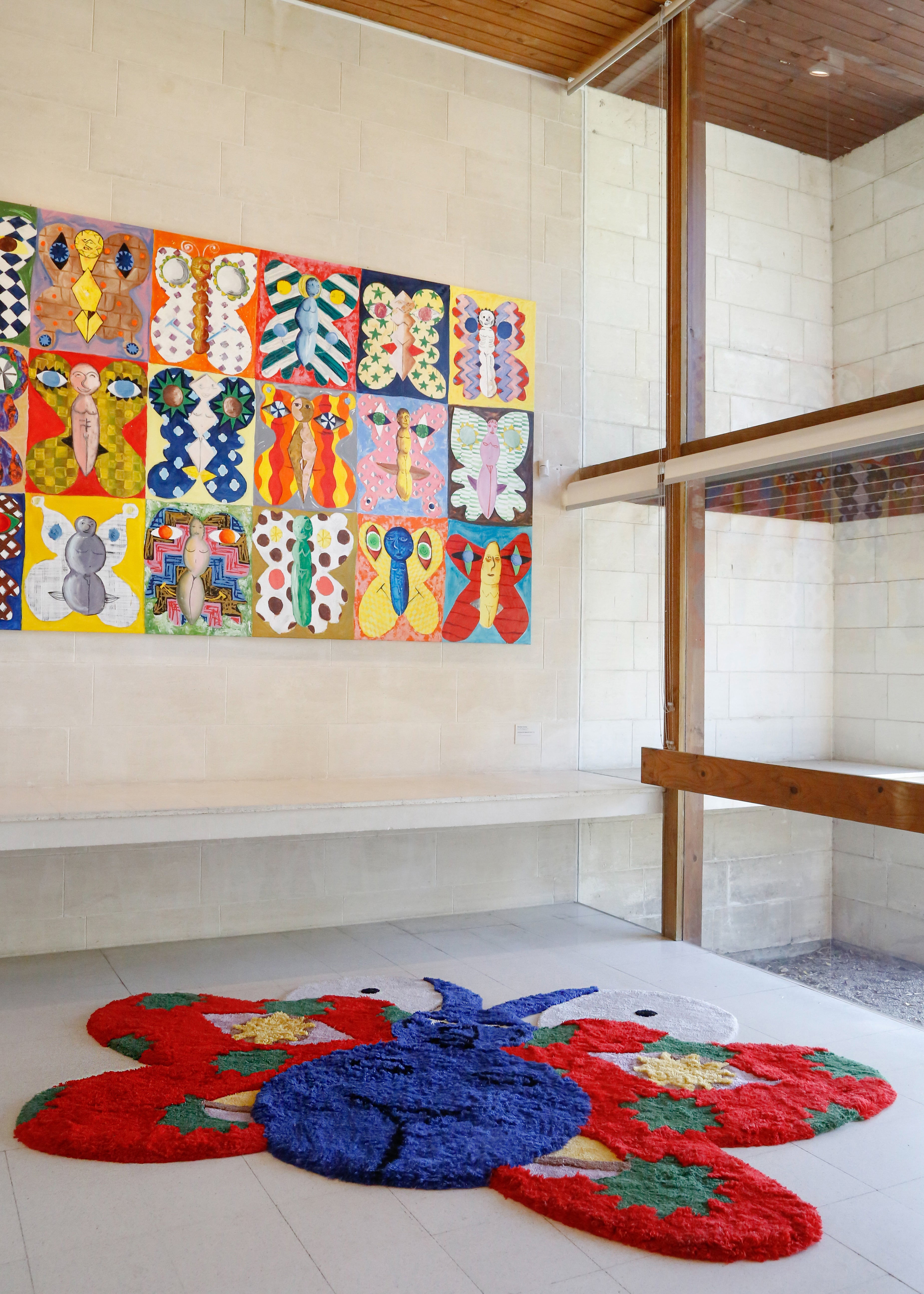 With expertise in fabric and textile design and construction, Alpha60 have brought the works of Brendan Huntley to life — in object form. The rugs feature an array of Huntley’s bright and characteristic motifs including faces, celestial beings, clocks, butterflies and eyes. They speak to the artist’s musings on the often temporary nature of personal transformation; how the landscape of individual growth moves in random patterns; and the way that euphoric moments of understanding can be fleeting.