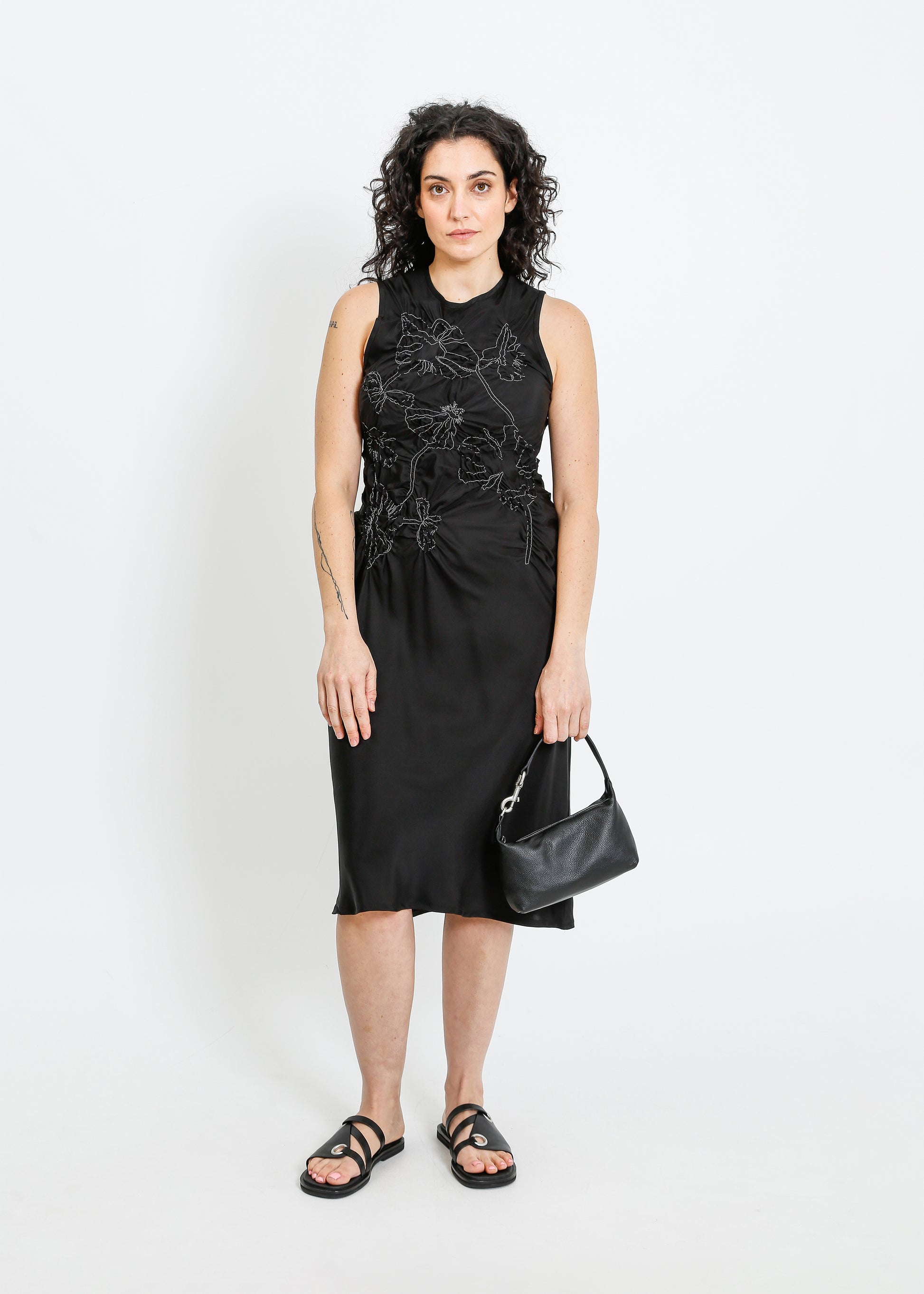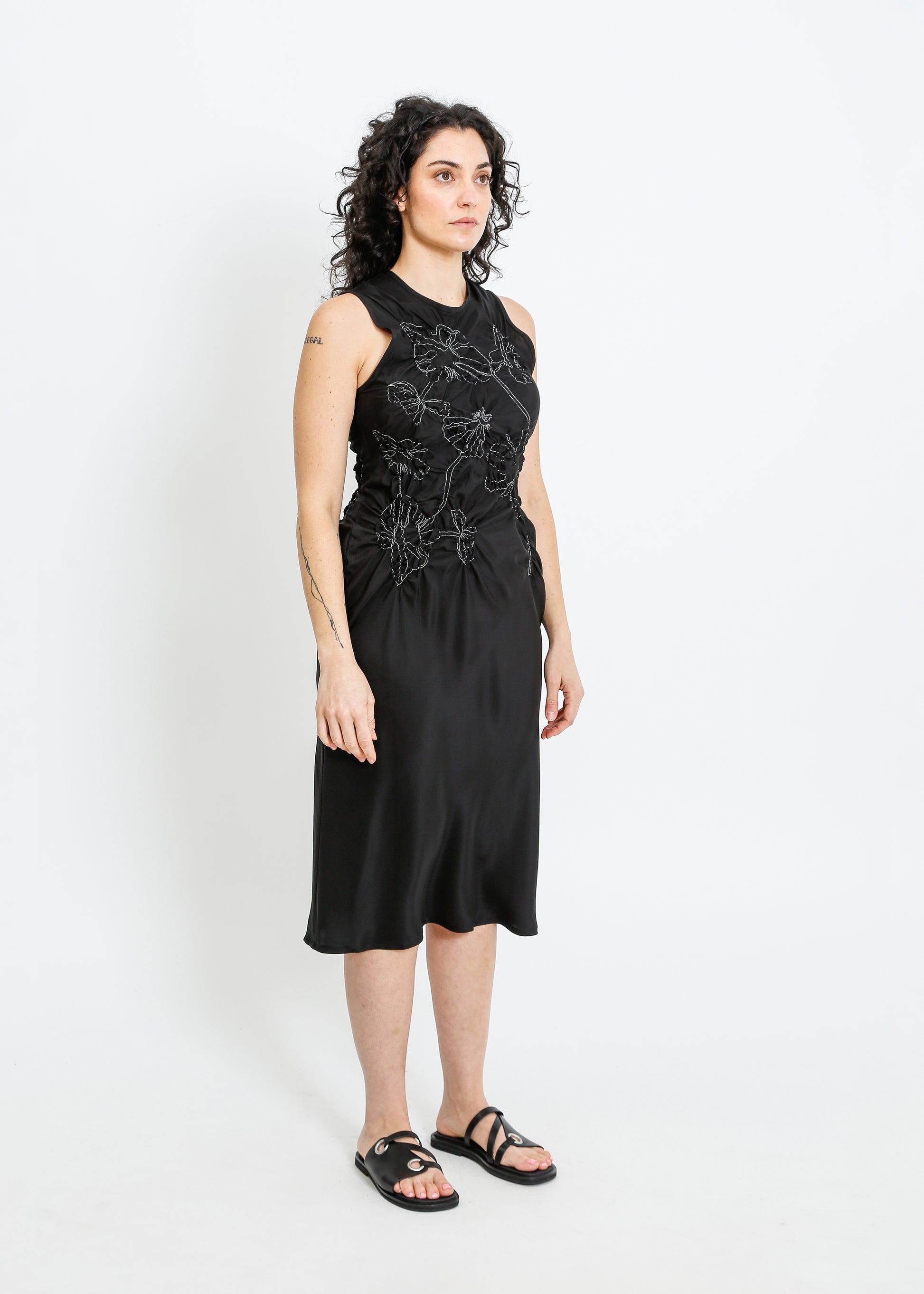 The ALPHA60 Cavalli Dress is a striking party dress crafted from luxurious silk, featuring a beautiful floral shirring design on the bodice. The bias cut flatters the silhouette, while the sleeveless crew neck style and midi length make it perfect for special occasions. This dress combines elegance and modern design, ensuring you stand out at any event.