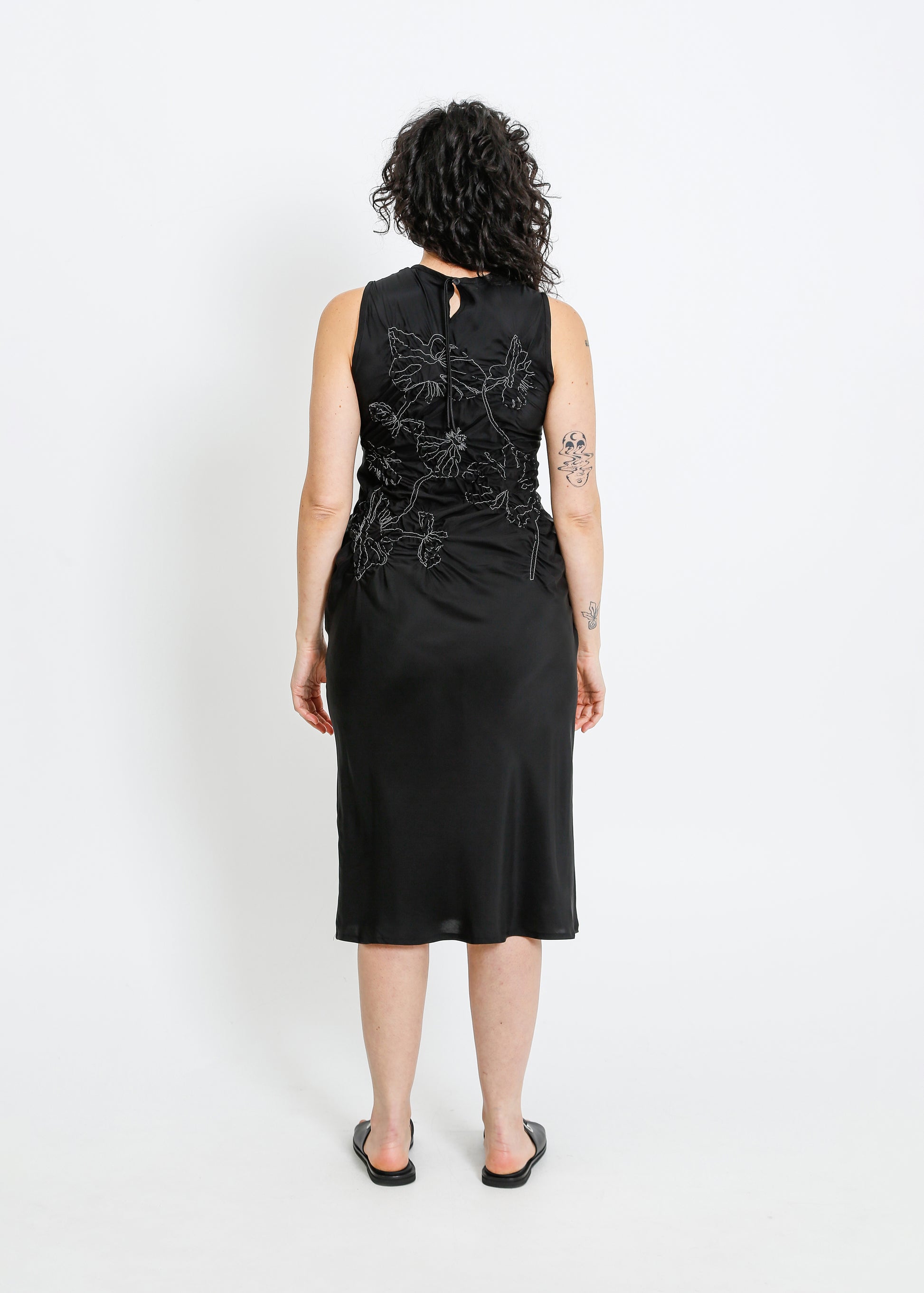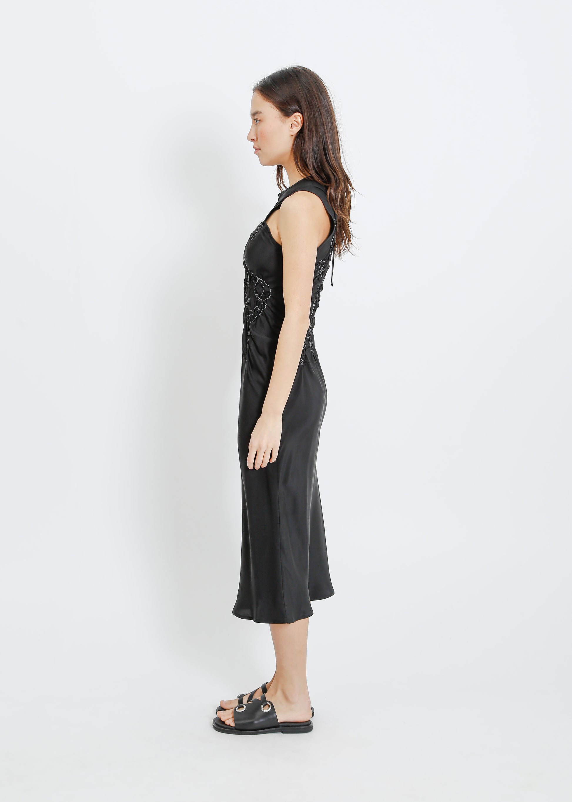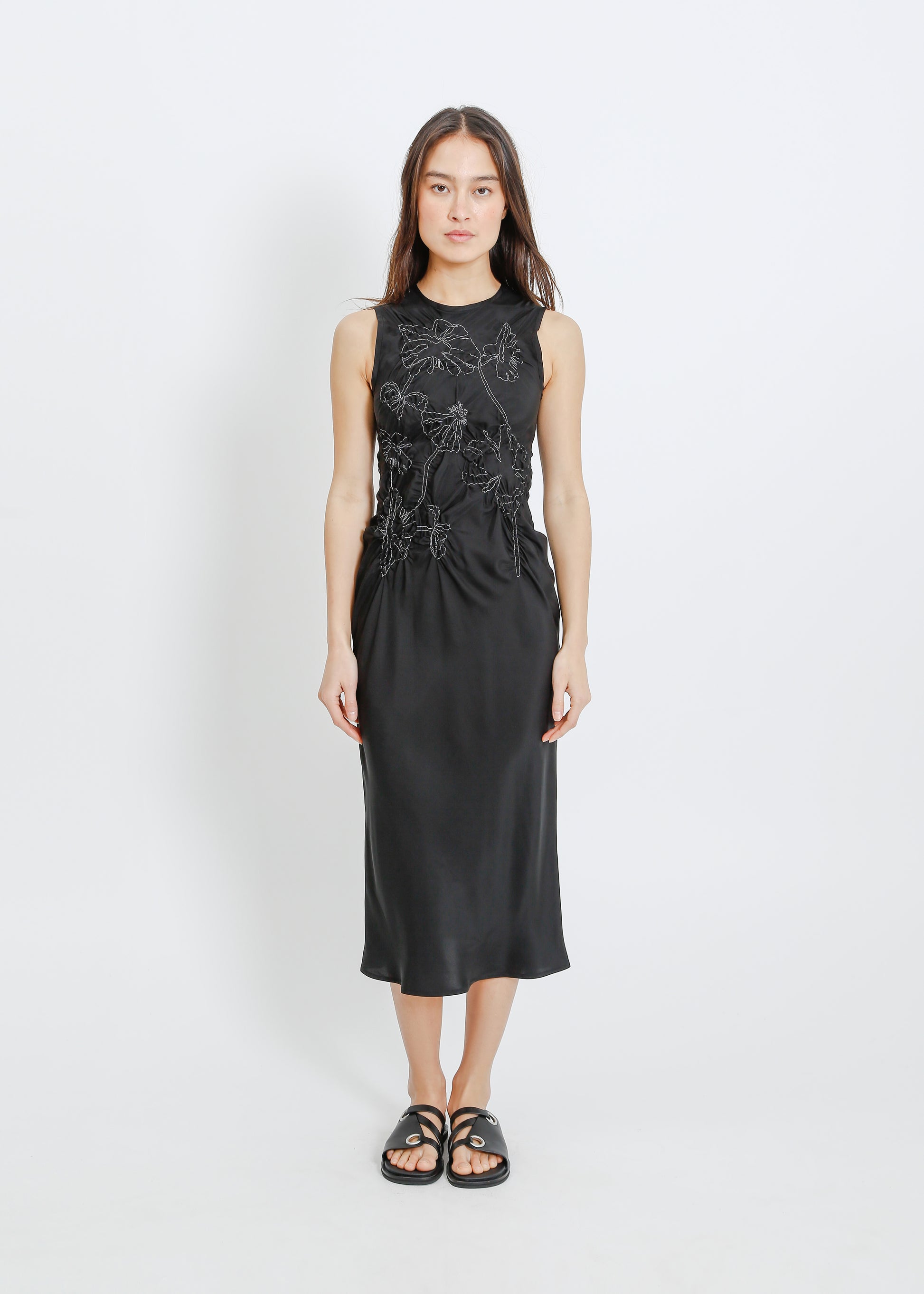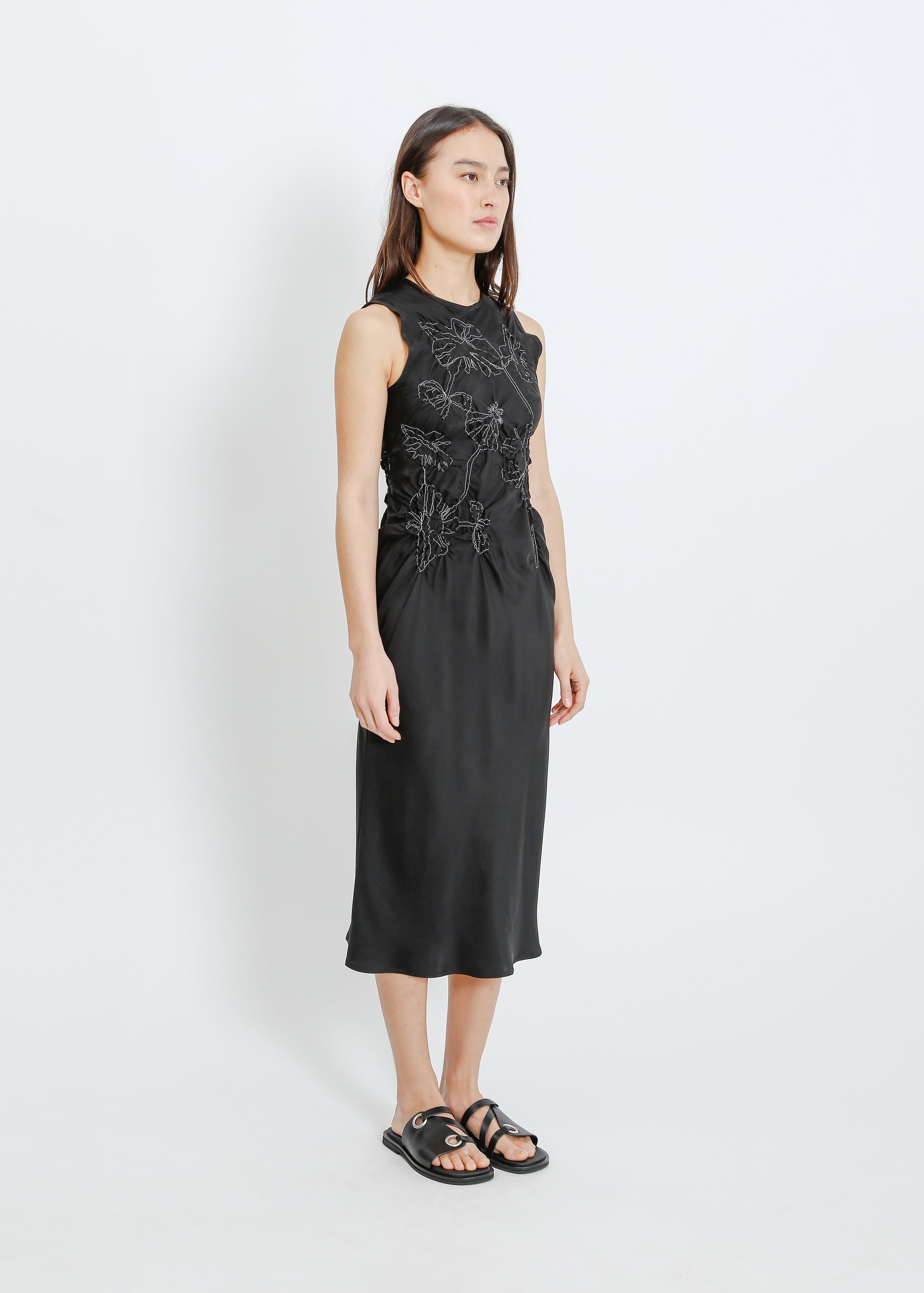 - Floral shirring design on bodice