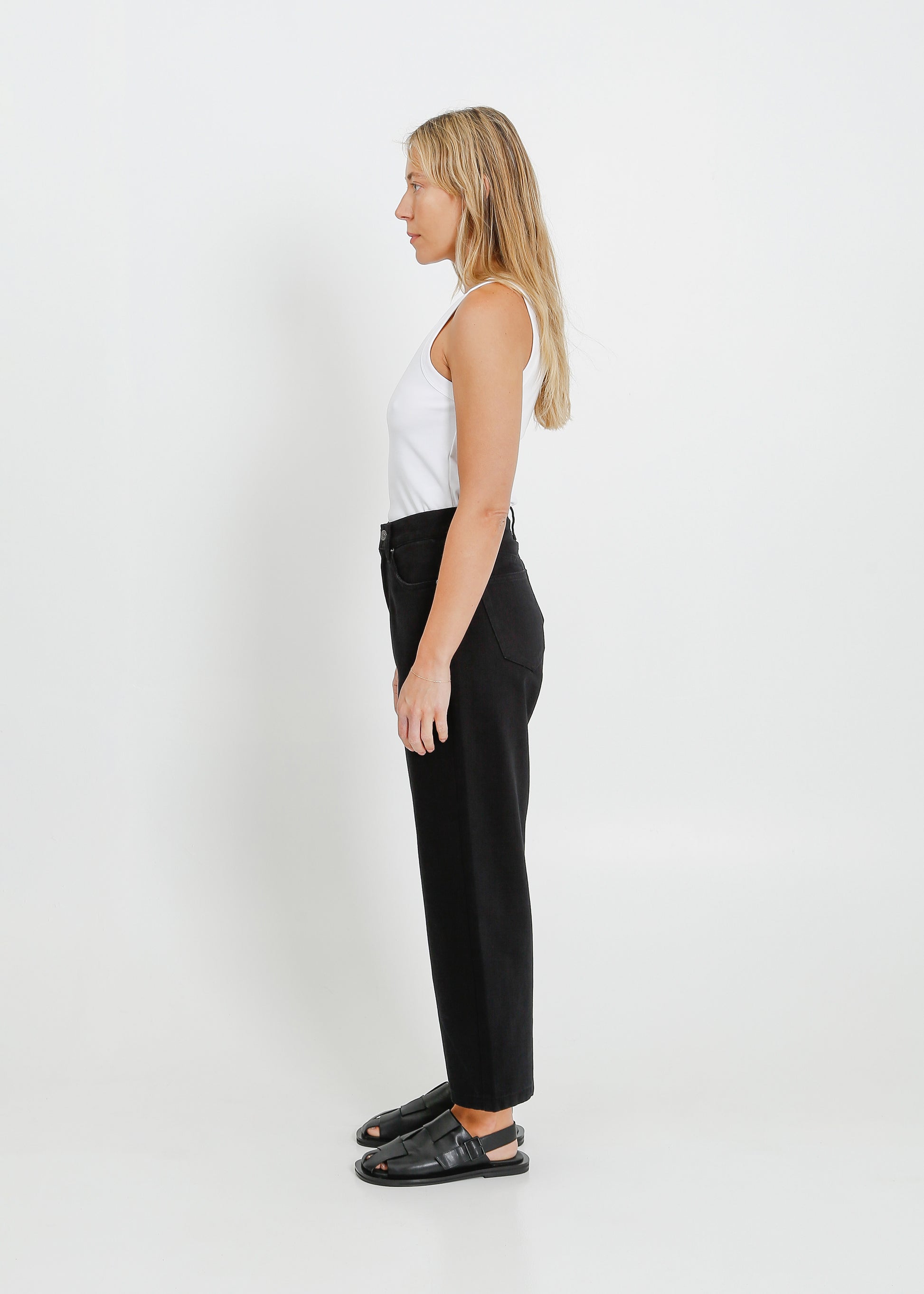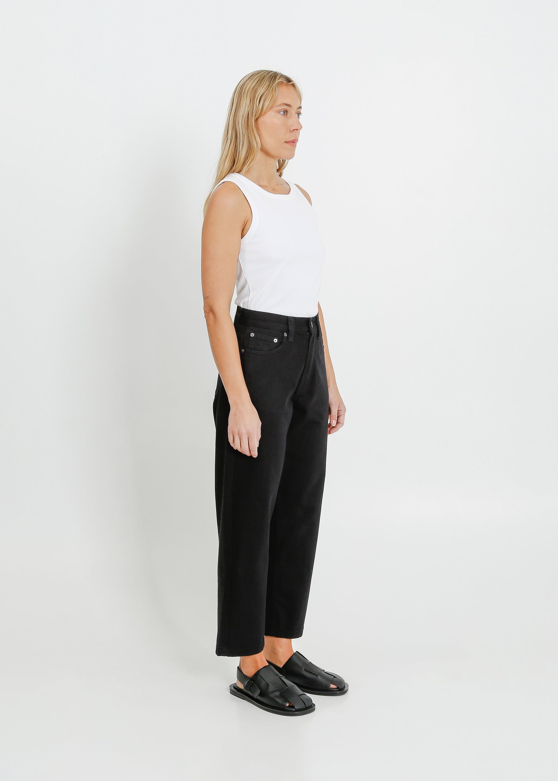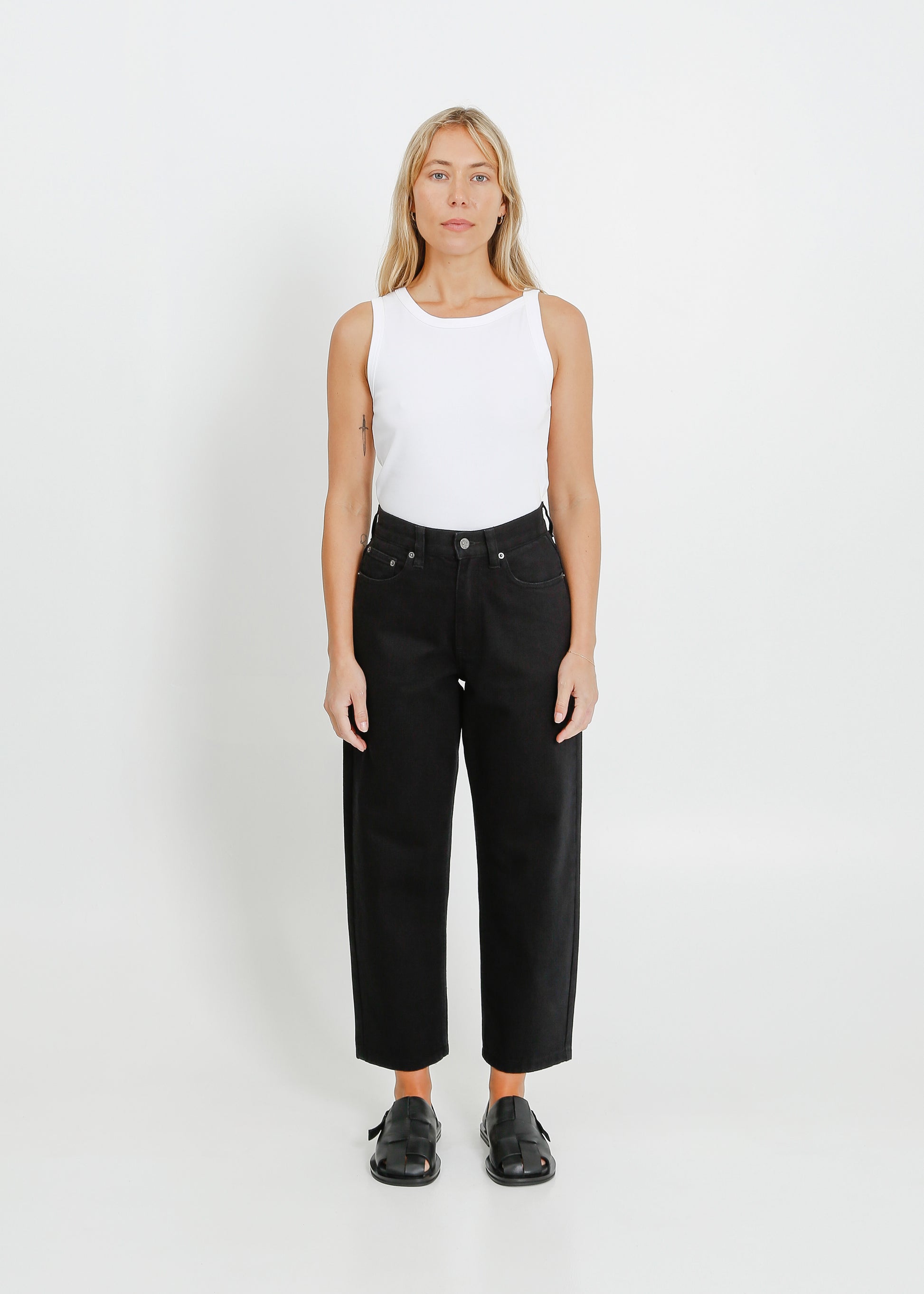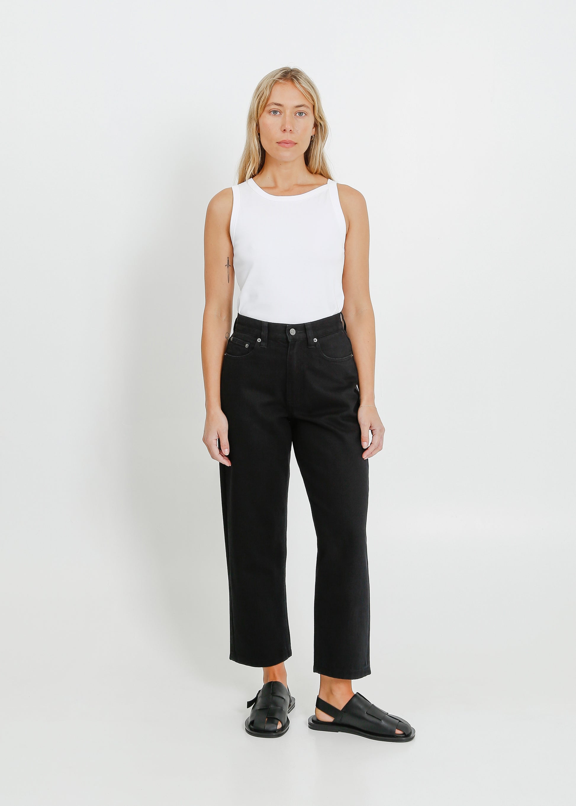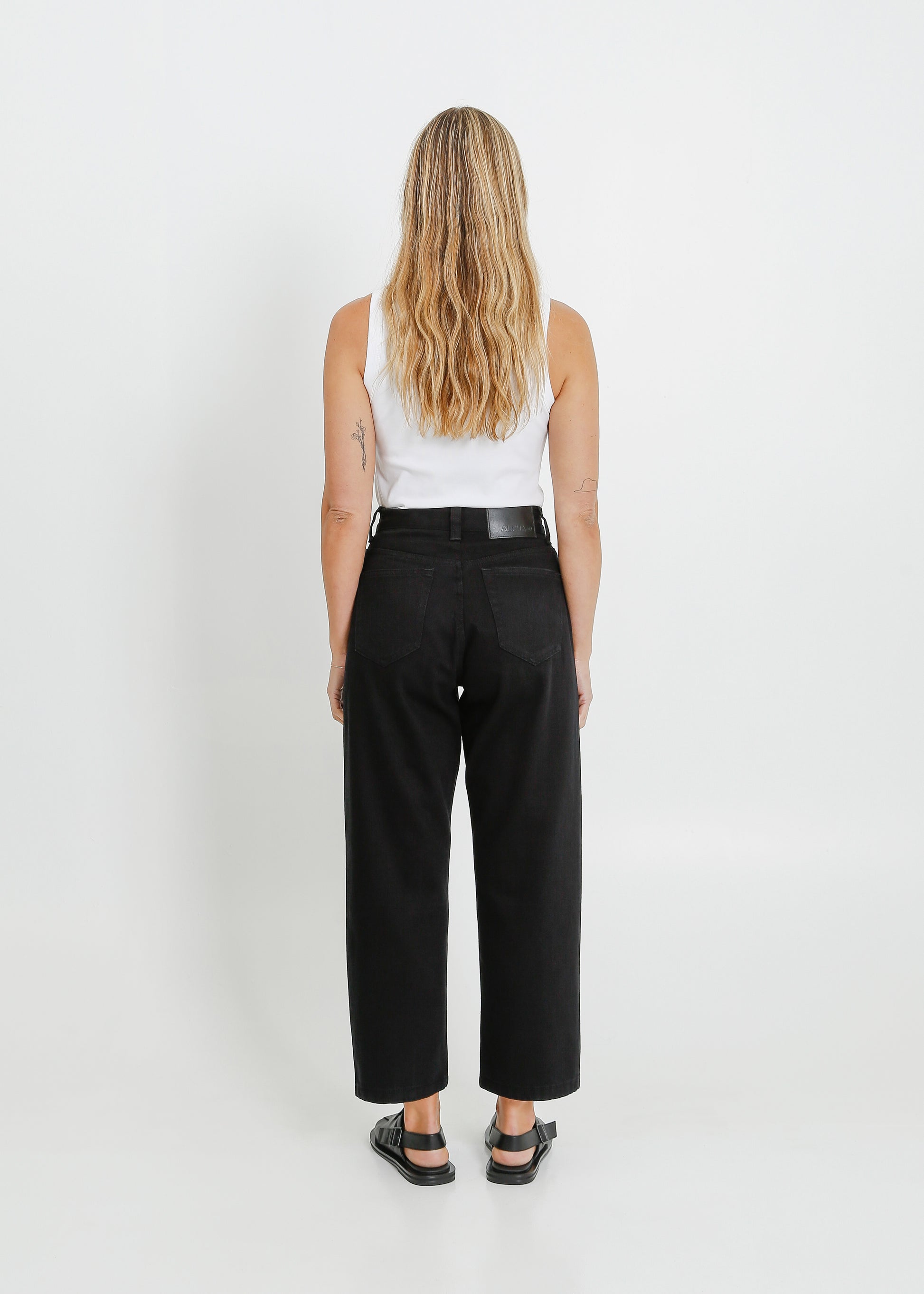 The ALPHA60 Goldie Jeans are cut from a classic washed denim. The high waisted cut has a relaxed, straight leg and a slightly cropped length. With the classic five pocket feature, they are finished with dark silver hardware.
