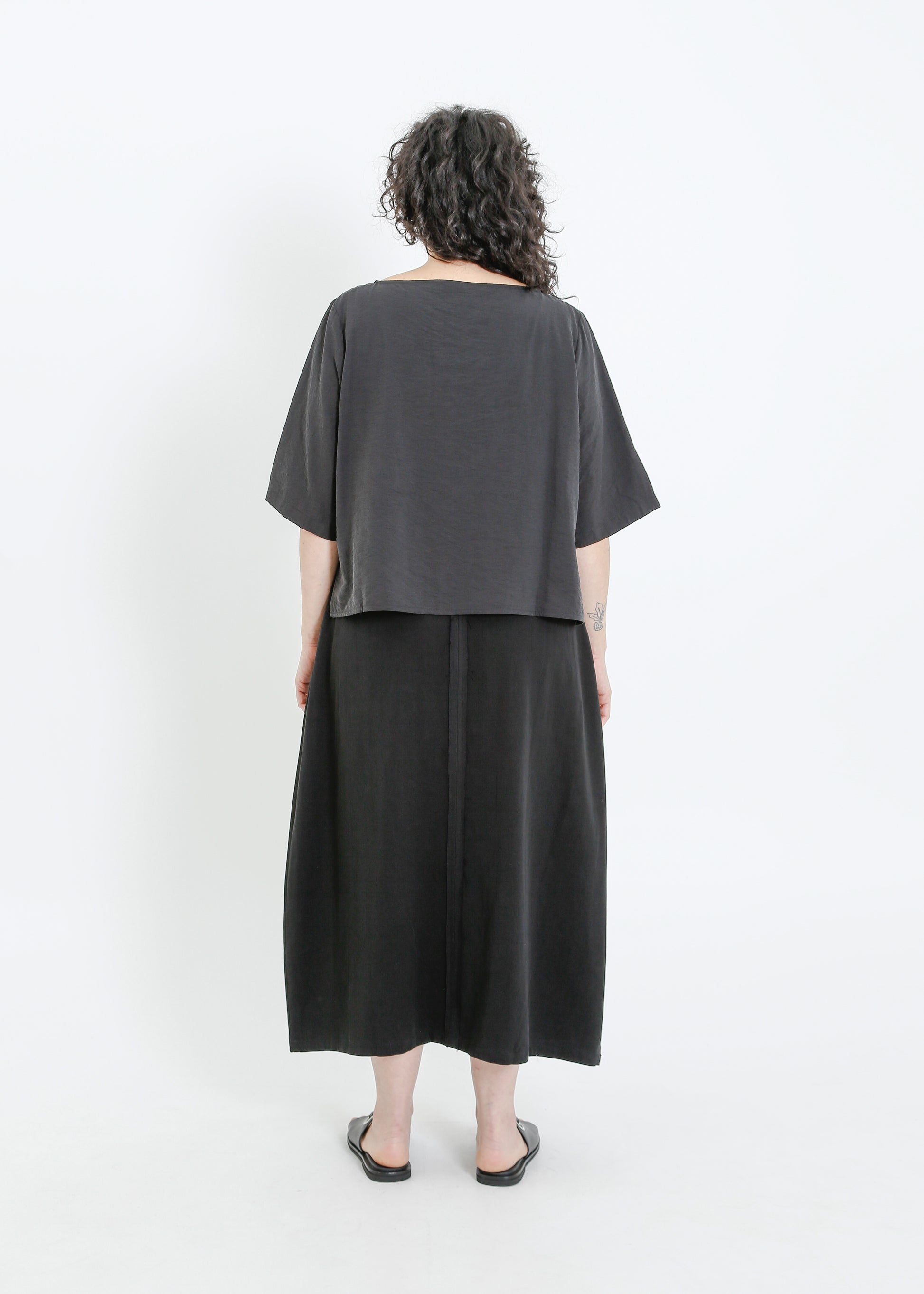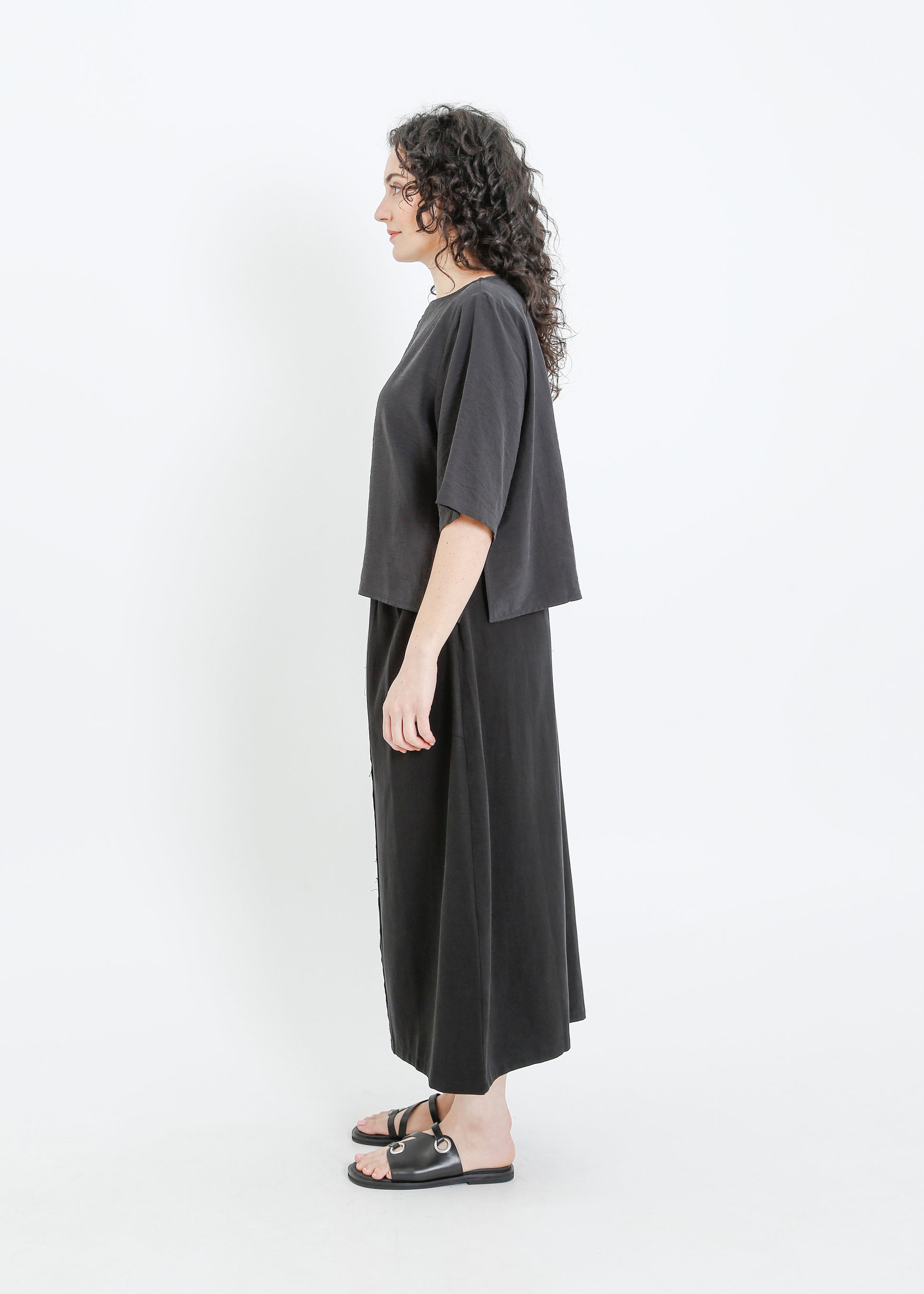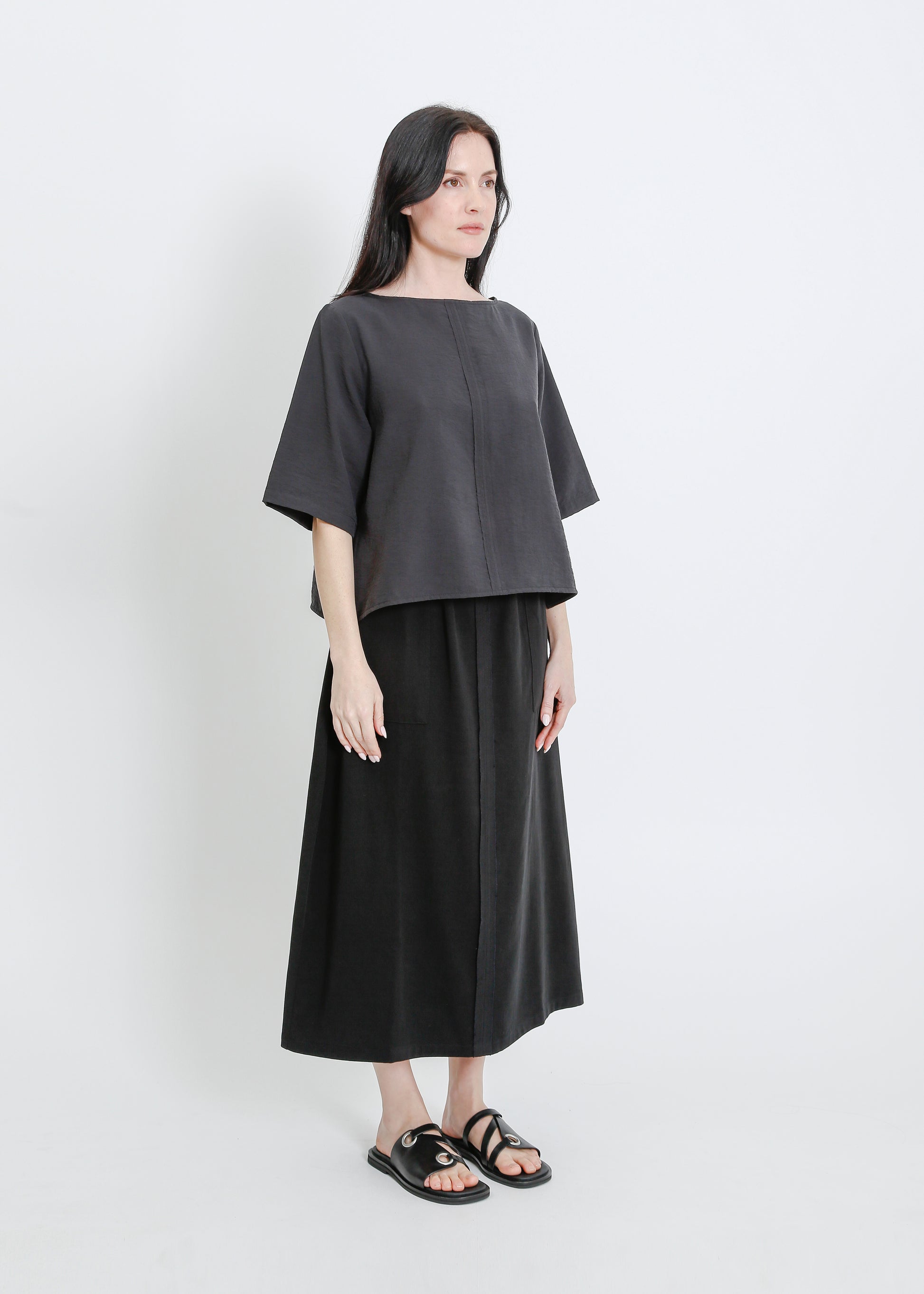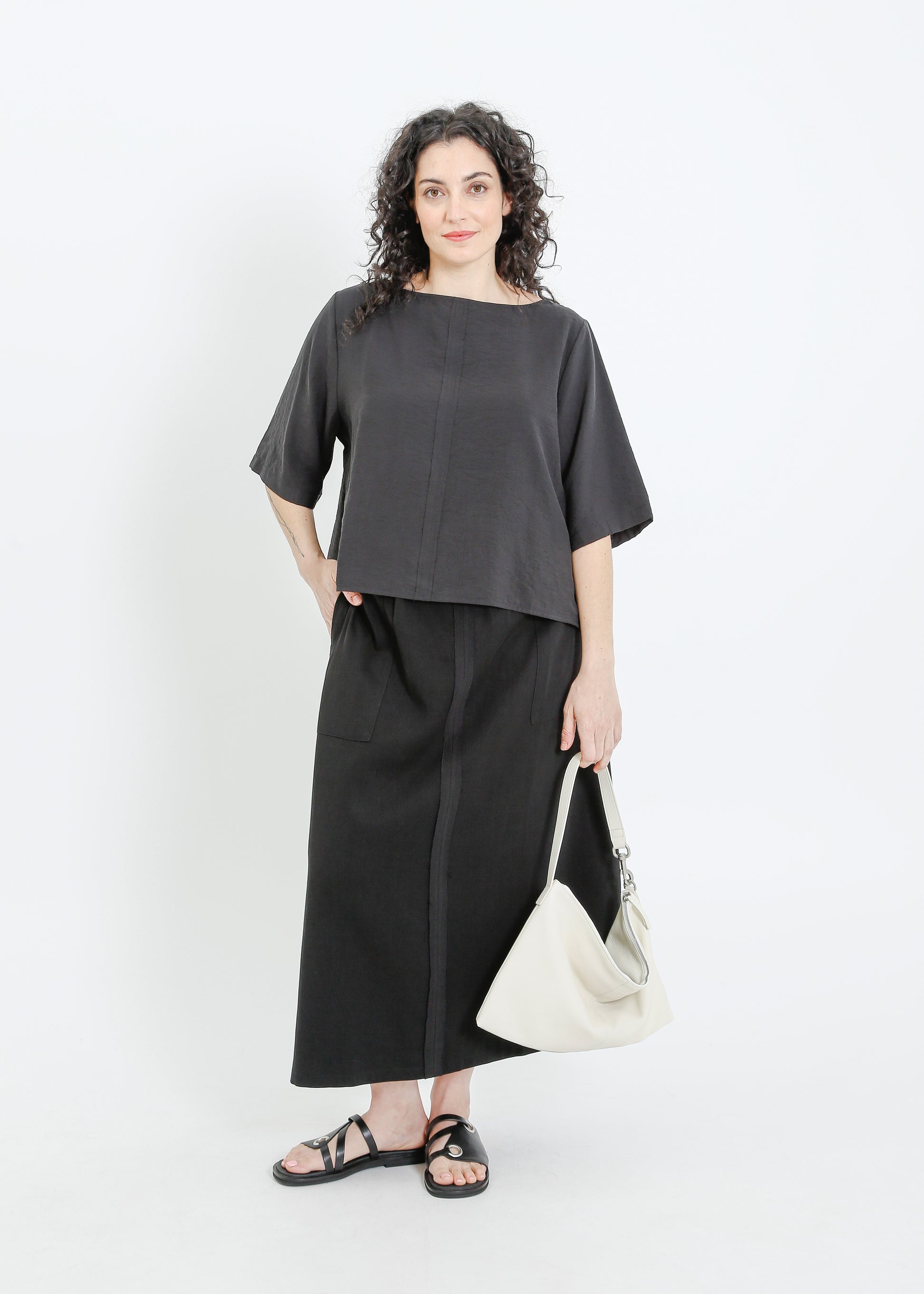 The ALPHA60 Lindsay Skirt is a modern take on a classic silhouette, featuring an elasticated waistband for comfort and a cocoon shape that flatters every figure. The midi length and mid rise make it a versatile piece for any wardrobe, while the intentionally frayed seams add a unique, lived-in look that will continue to evolve with wear. Crafted from a soft blend of Tencel and cotton, this skirt is both breathable and stylish—perfect for everyday wear or dressing up for special occasions.