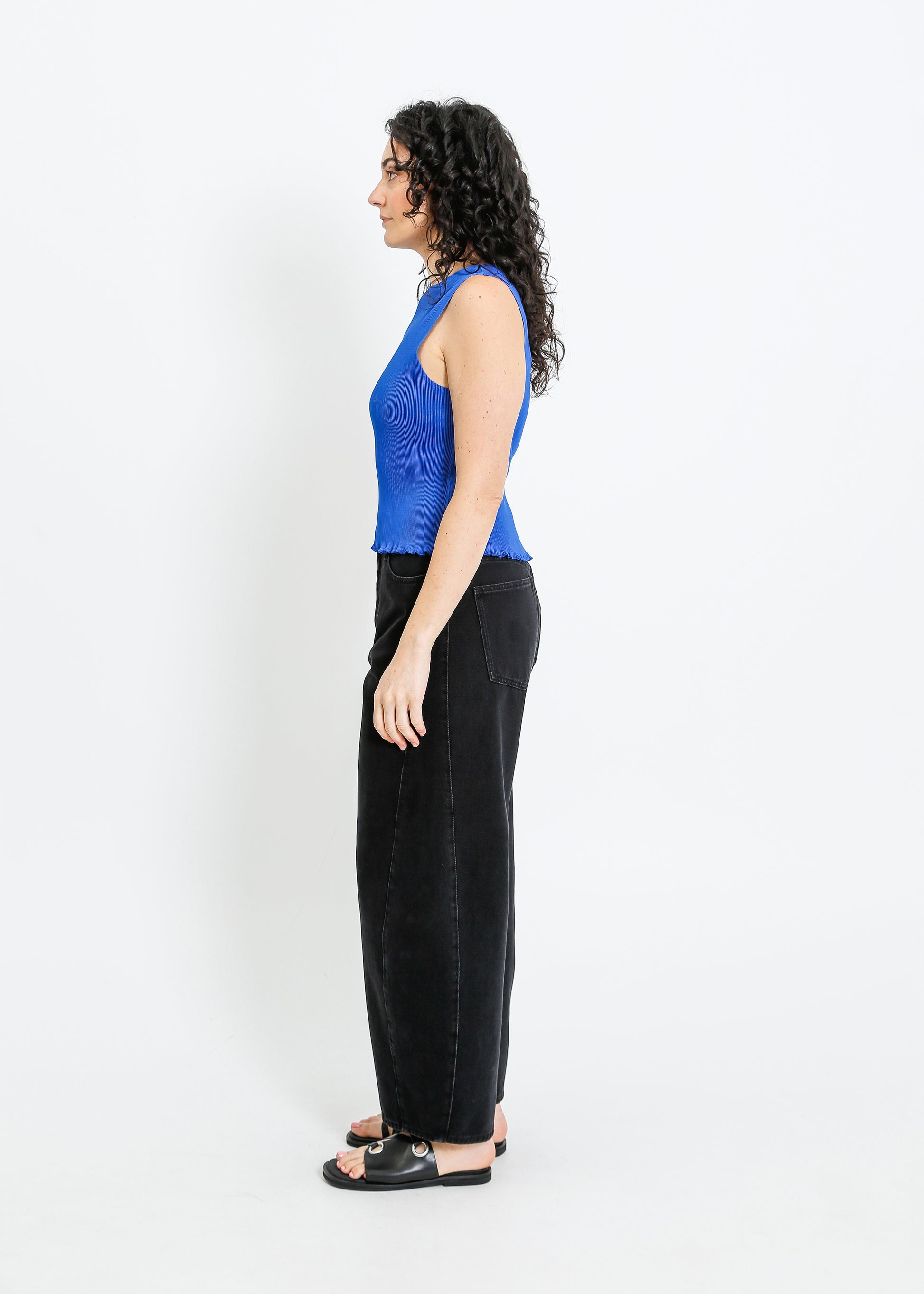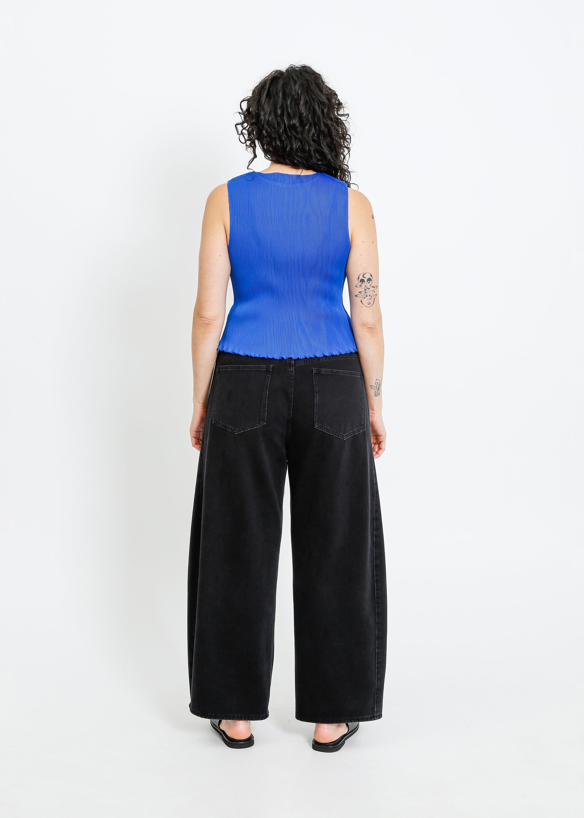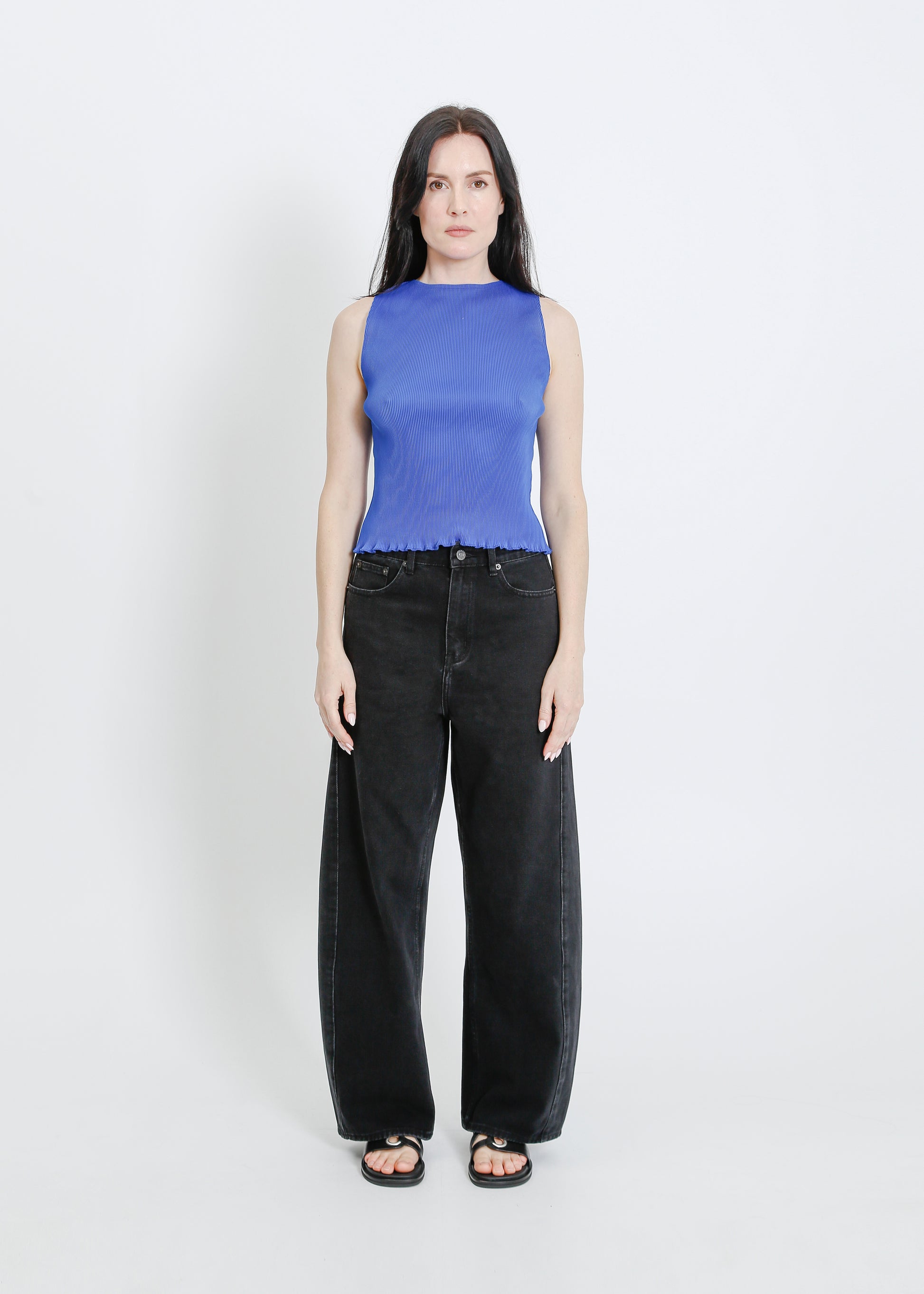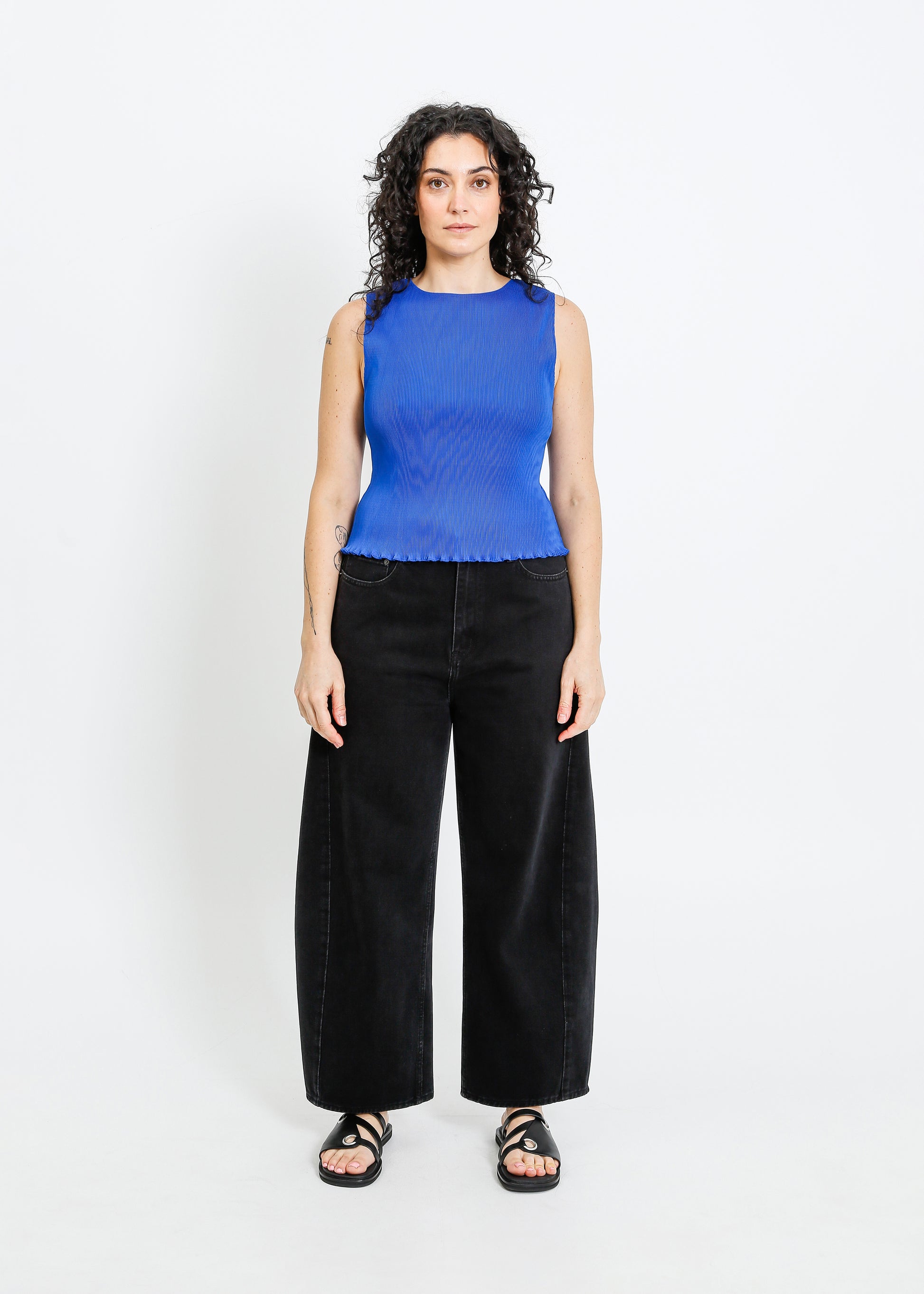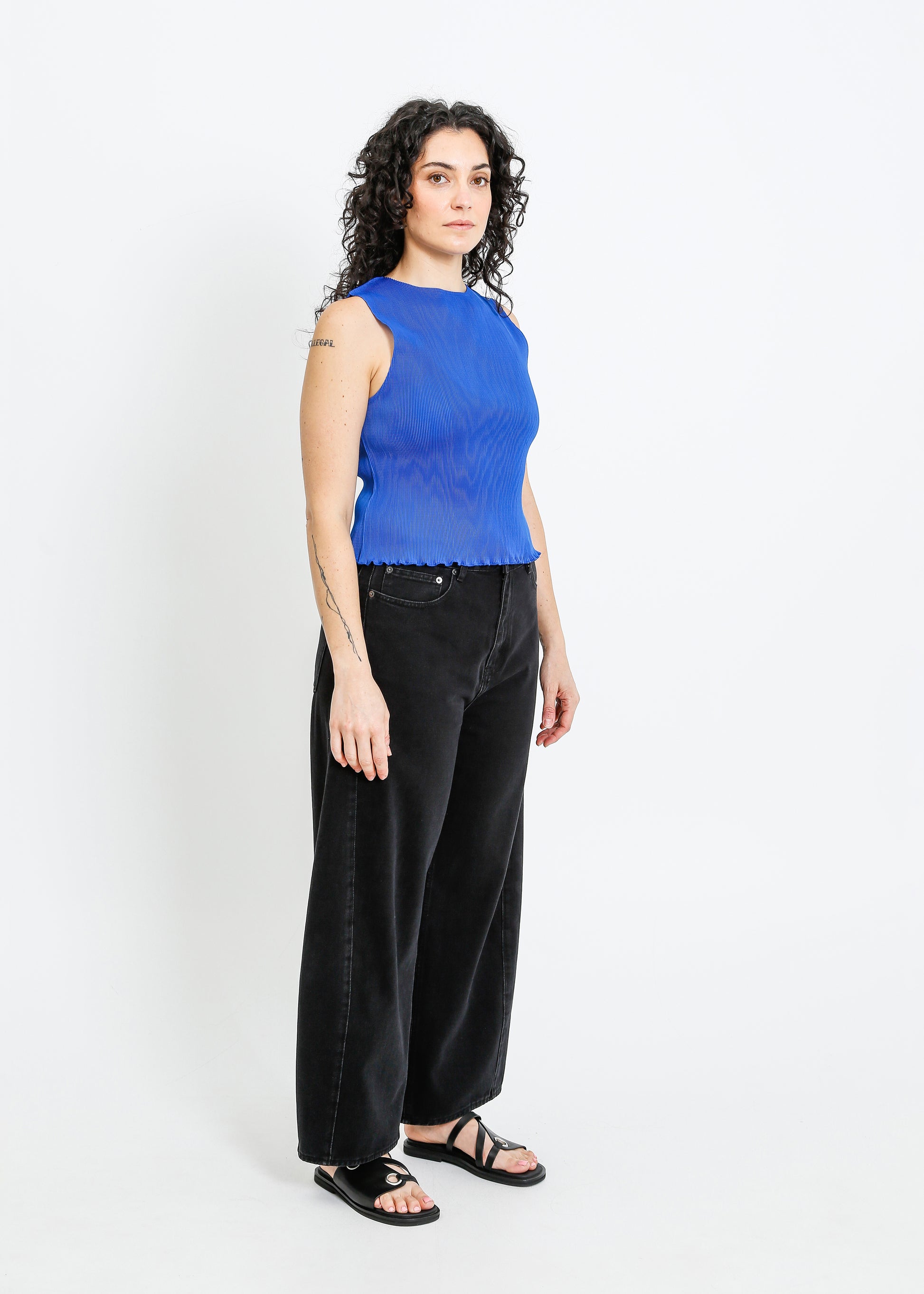 The ALPHA60 Emma Pleat Top is a modern essential, crafted in a vibrant bright blue with a unique crystal pleat texture. This sleeveless crew neck top features a form-fitting silhouette and a standard length, making it perfect for layering or wearing on its own. The pleated, non-stretch fabric adds dimension and a contemporary edge to your wardrobe.