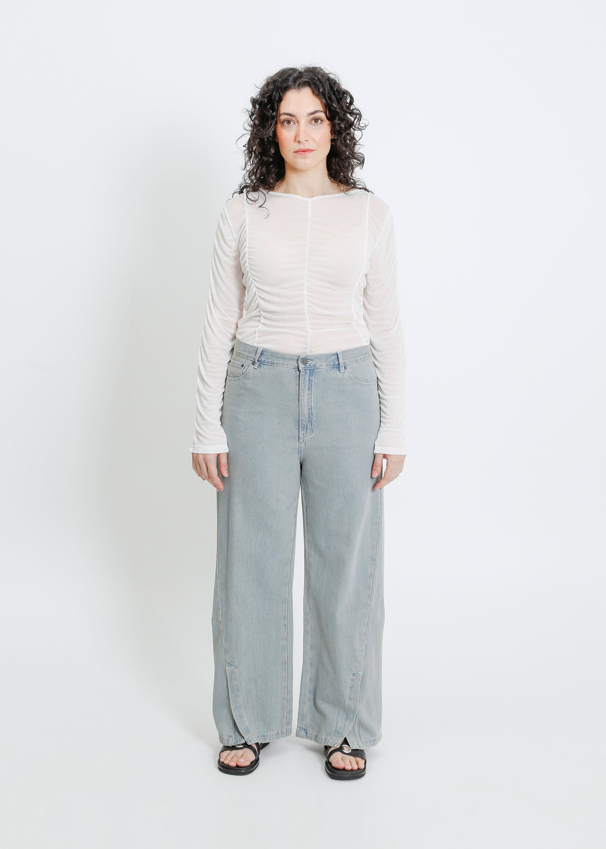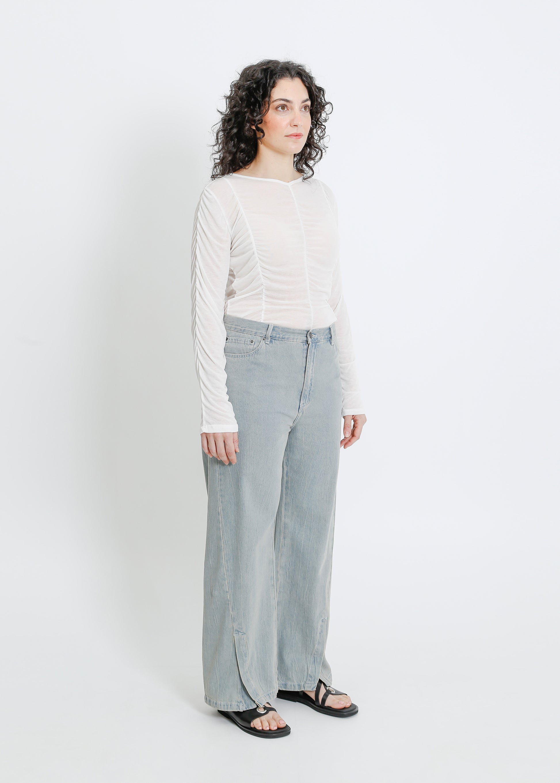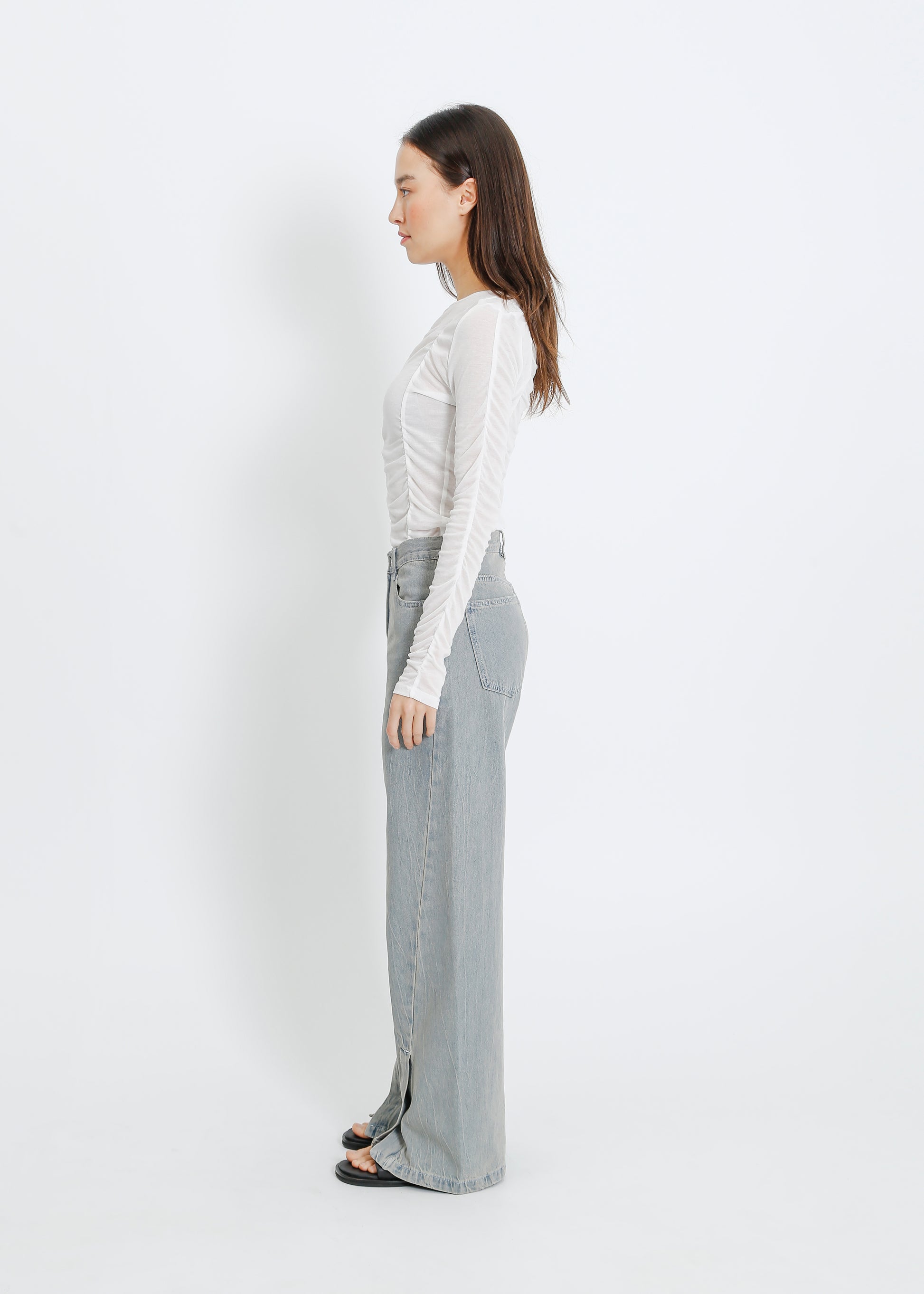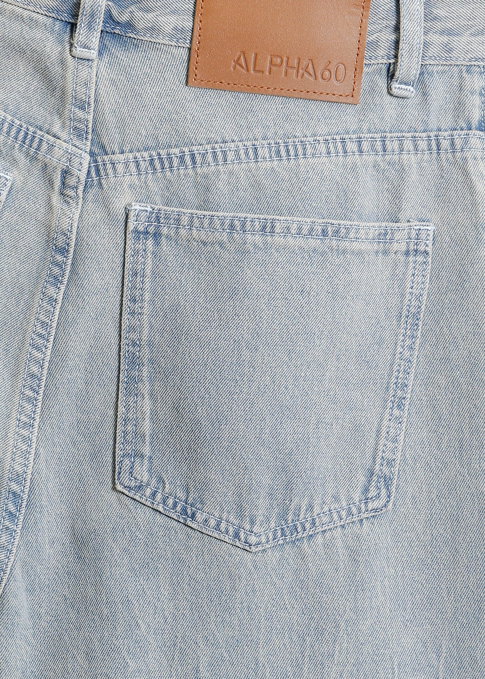 The ALPHA60 Baker Jean is a classic denim 5-pocket style, reimagined with a modern wide leg and centre front split on each leg, finished with two snap closures. Crafted from a heavily washed rigid denim, this full-length jean offers a structured silhouette and a timeless mid-rise fit, perfect for elevating your everyday wardrobe.