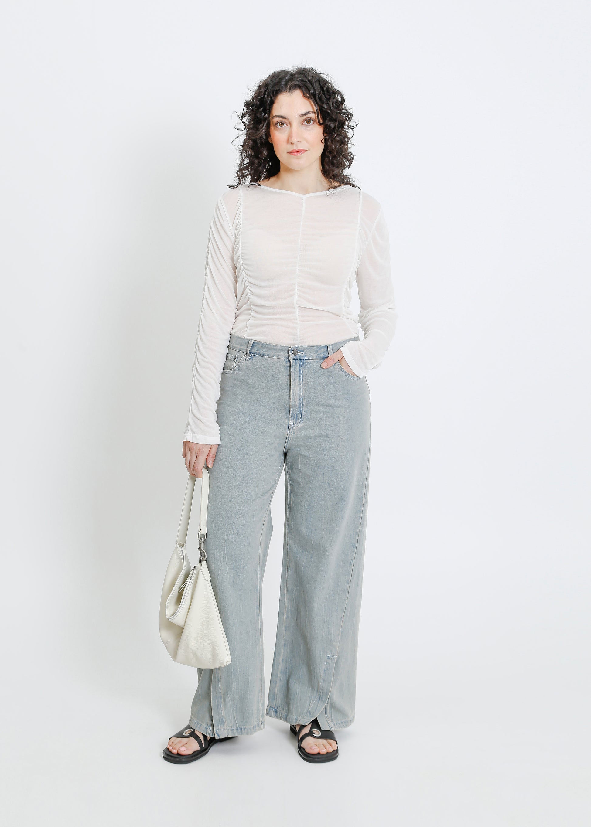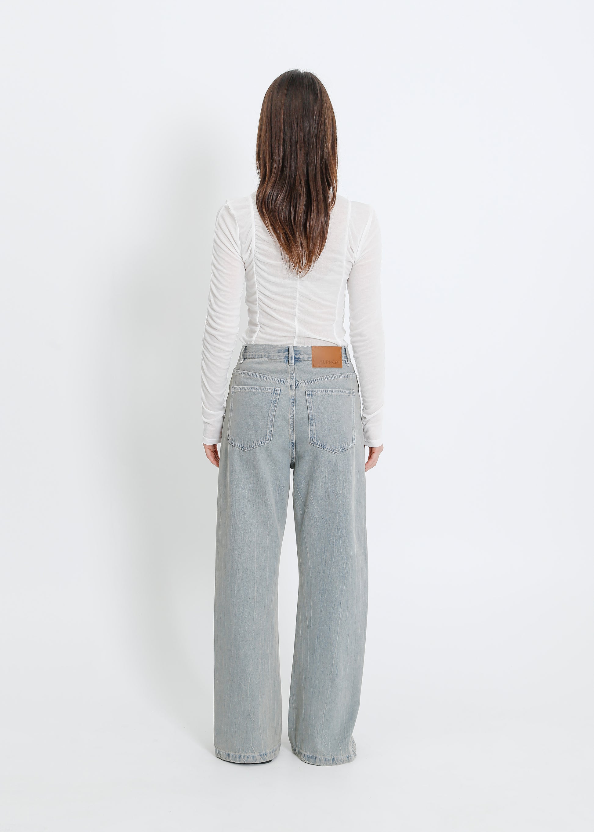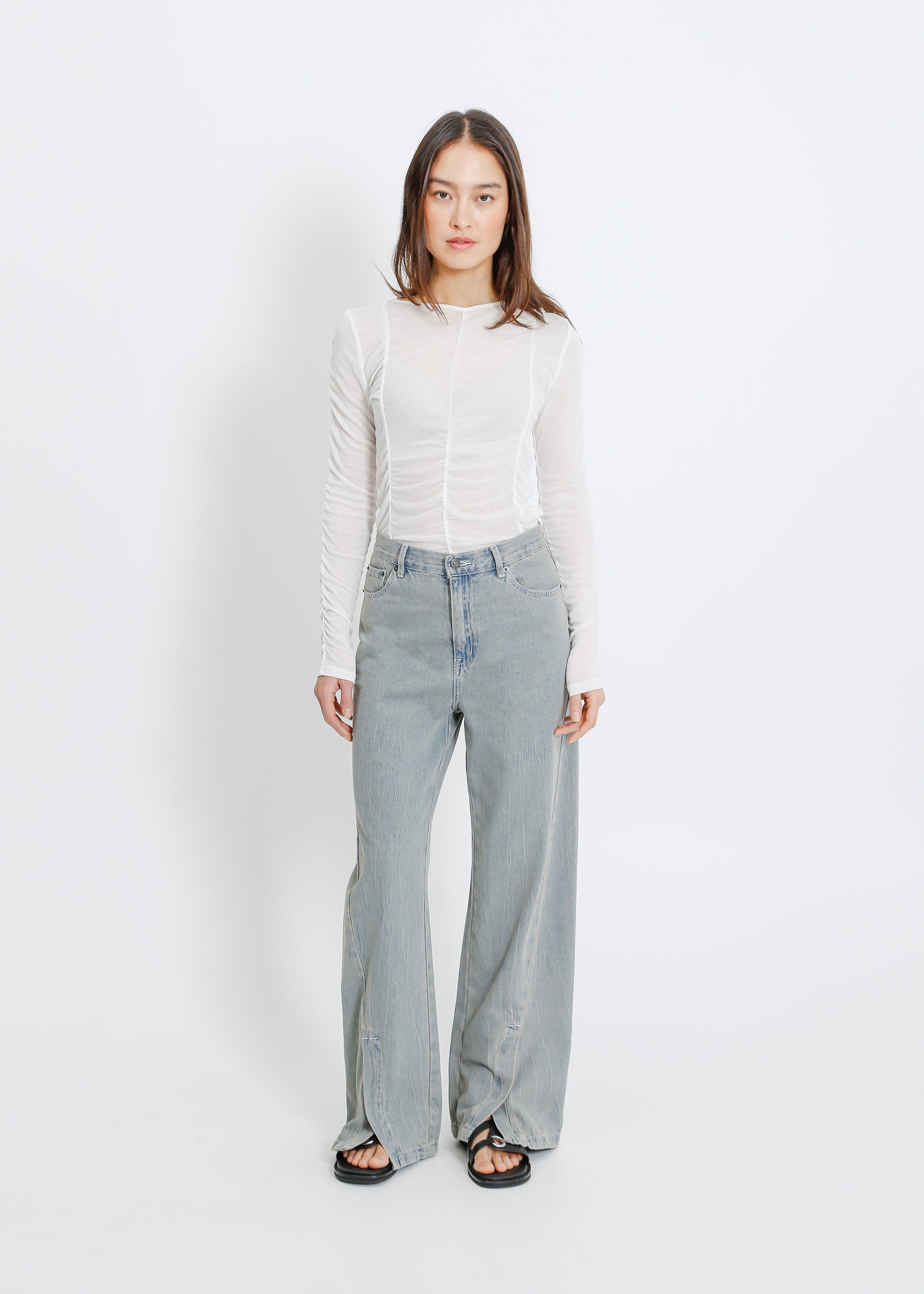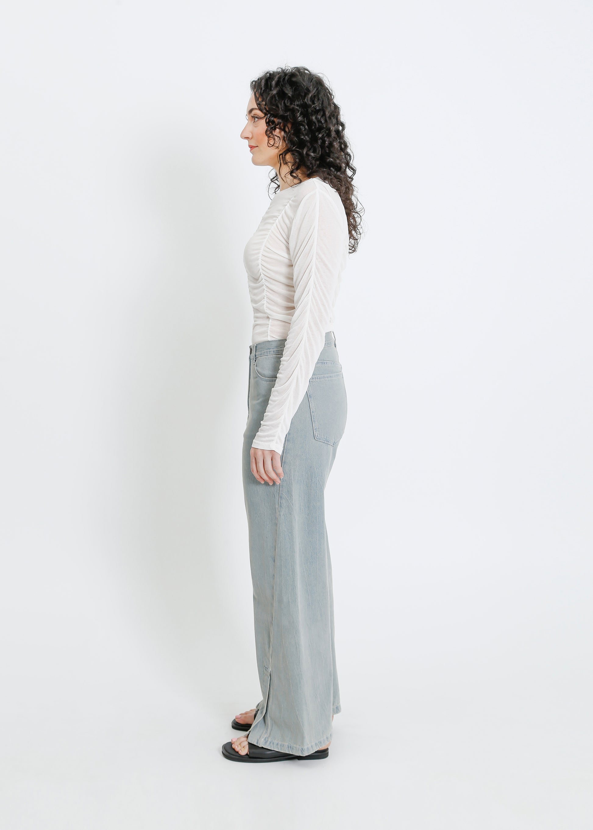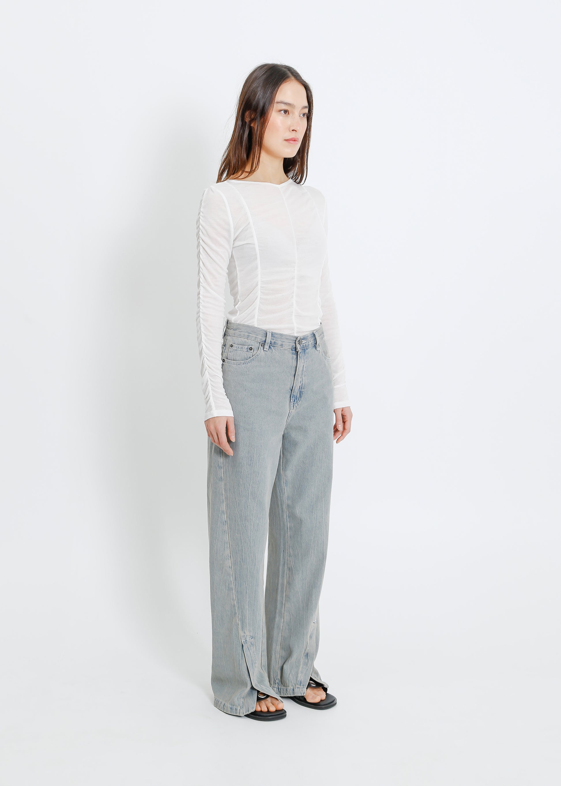 The ALPHA60 Baker Jean is a classic denim 5-pocket style, reimagined with a modern wide leg and centre front split on each leg, finished with two snap closures. Crafted from a heavily washed rigid denim, this full-length jean offers a structured silhouette and a timeless mid-rise fit, perfect for elevating your everyday wardrobe.