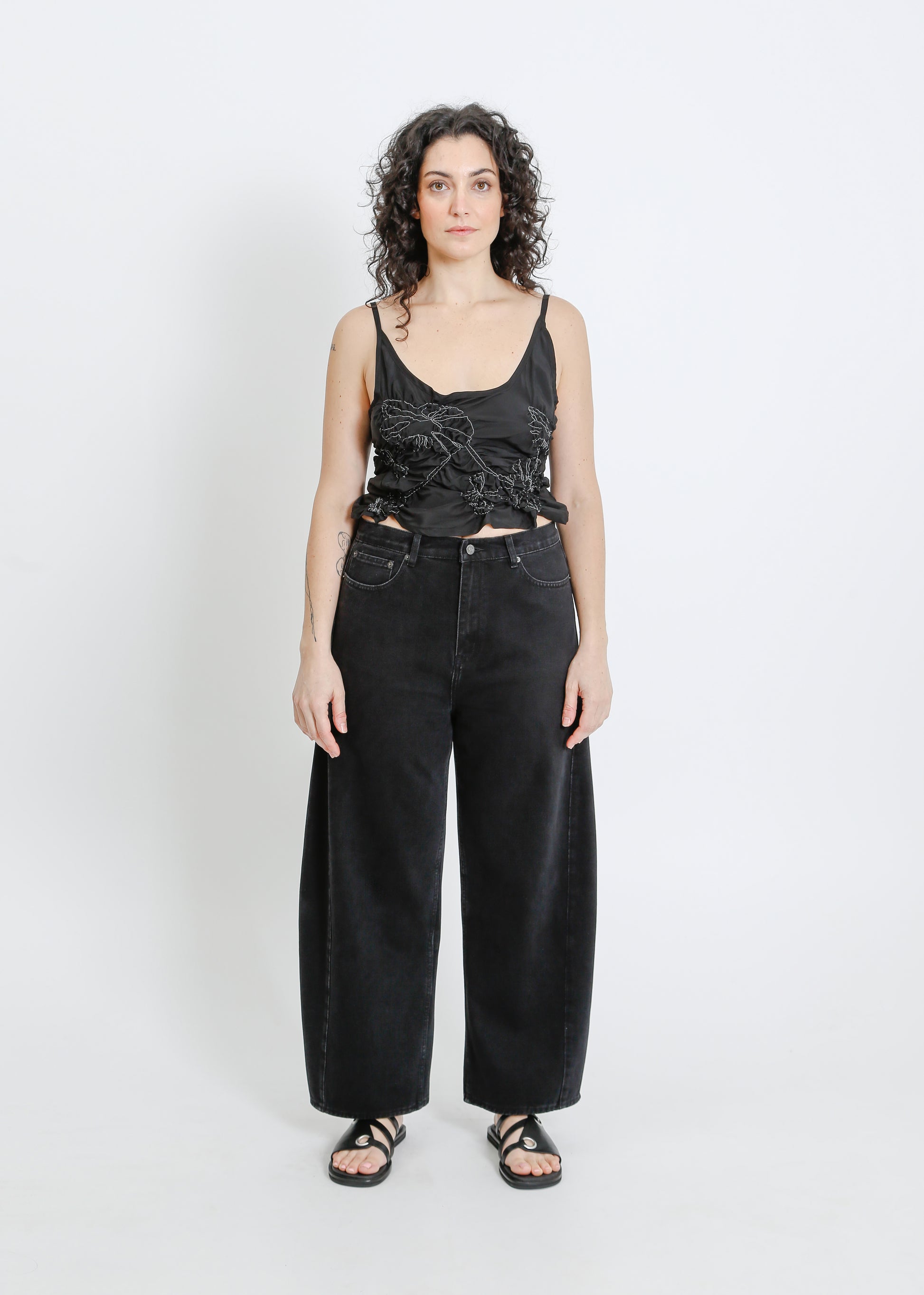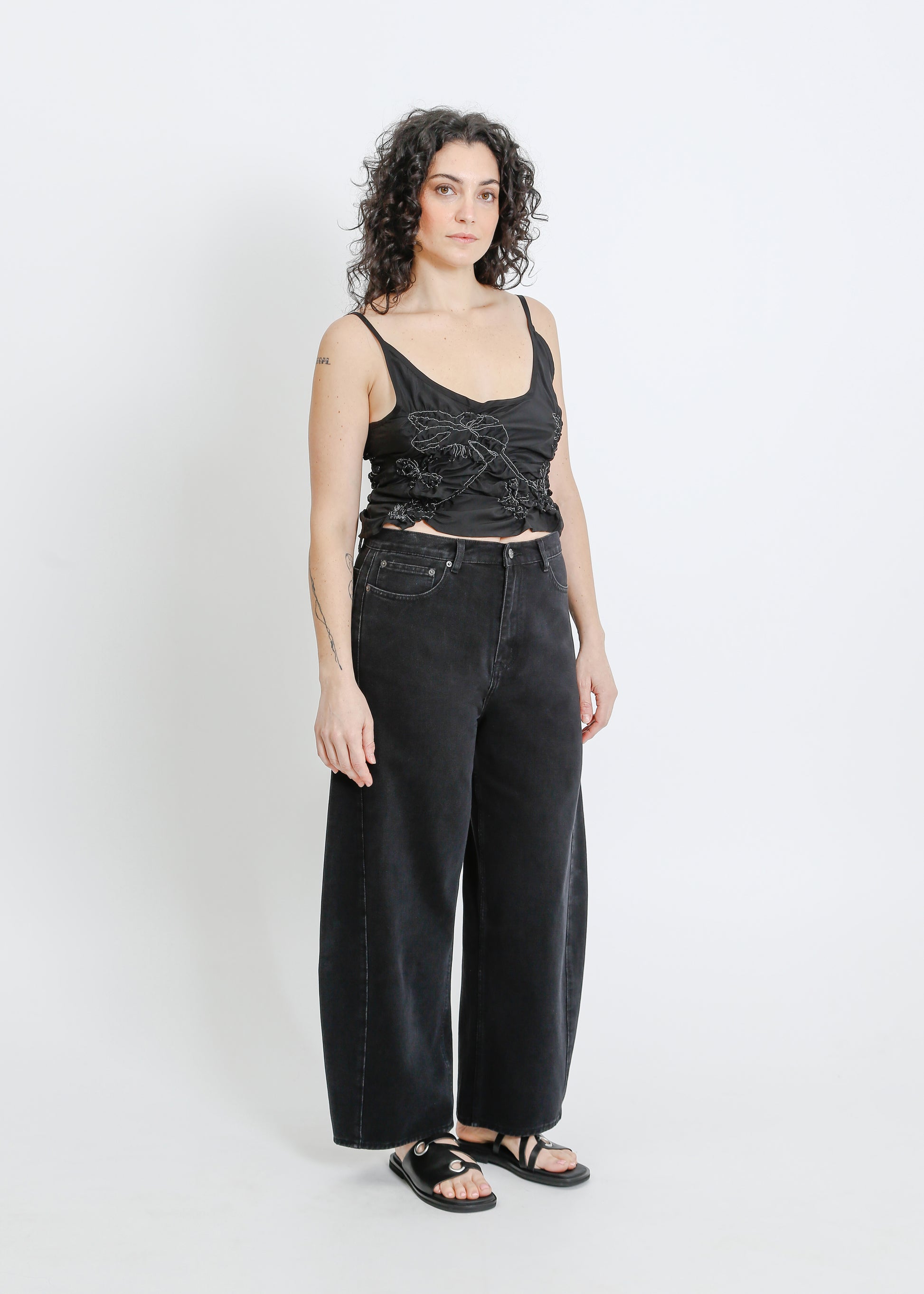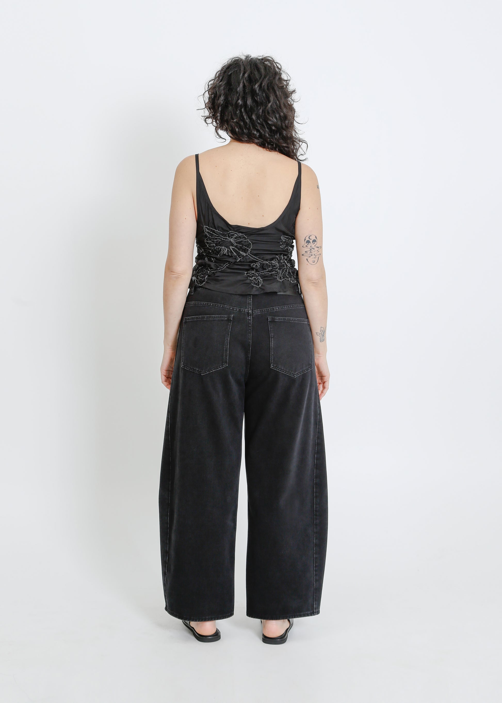 - Waist 40cm / Low hip is 53.5cm / Inner leg length is 72.5cm / Outleg length 99.5cm / Front rise is 29.5cm / Back rise is 39.5cm. Garment measures are taken flat on size S. Body width is graded 2.5cm between sizes.