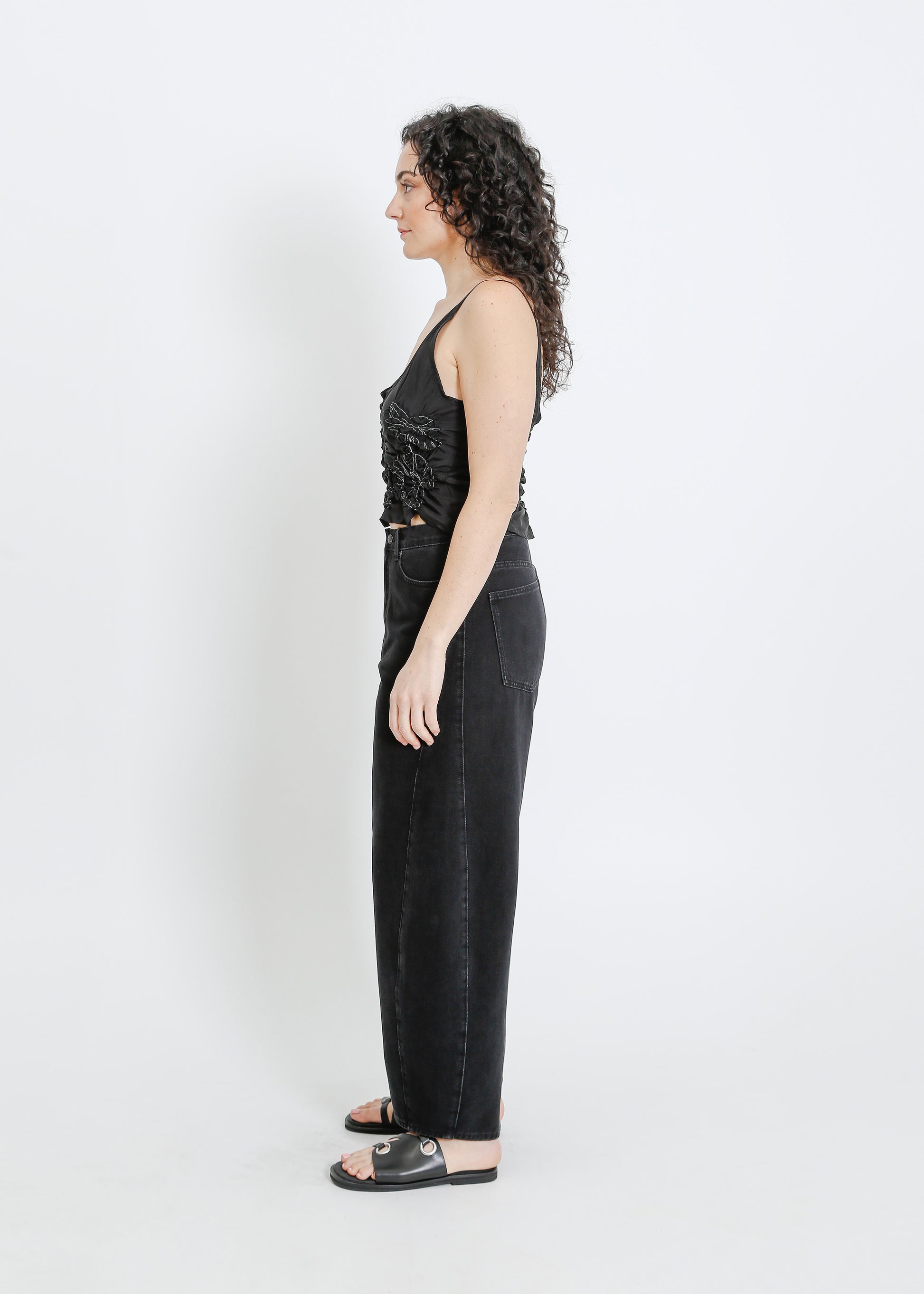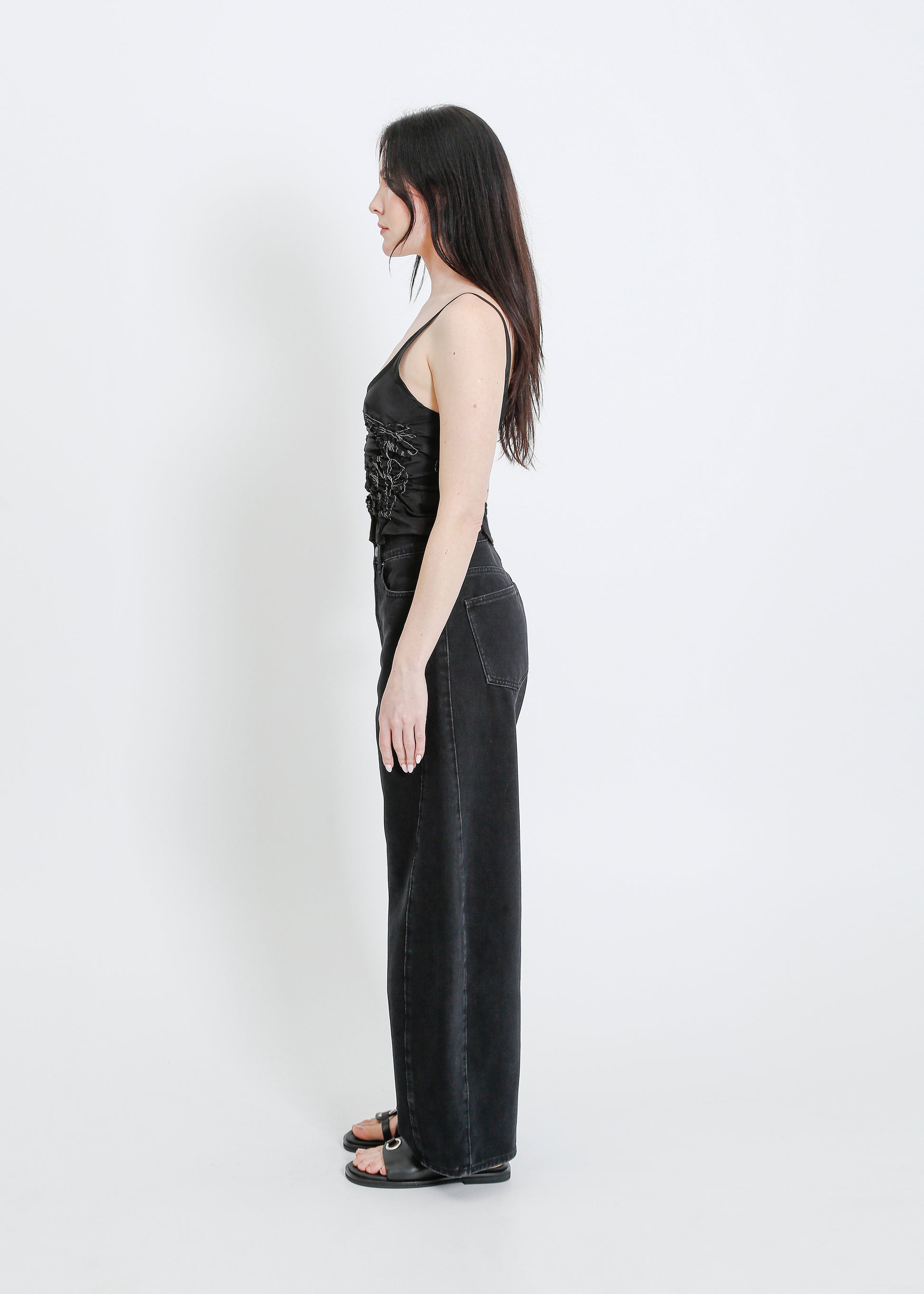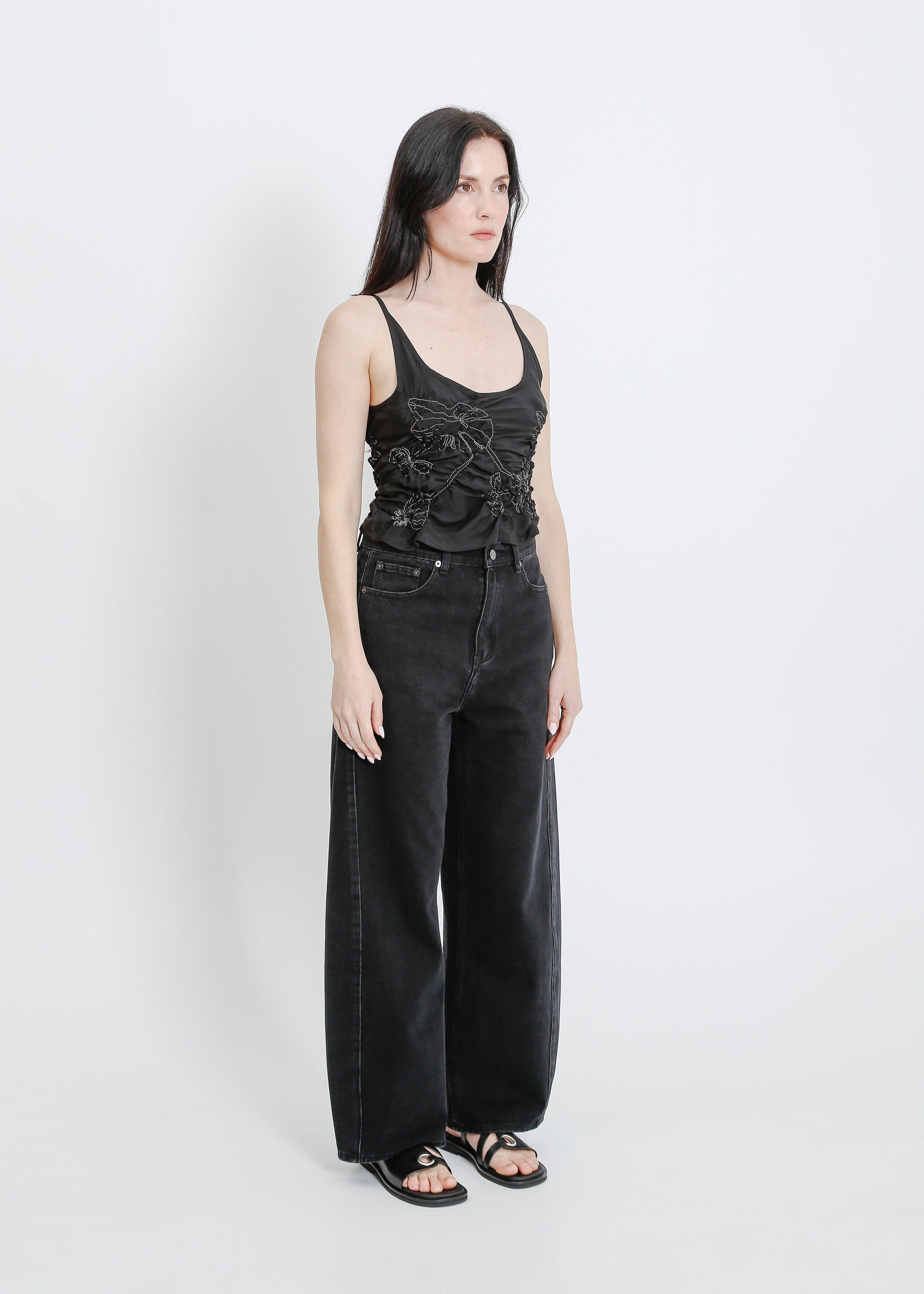 - Waist 40cm / Low hip is 53.5cm / Inner leg length is 72.5cm / Outleg length 99.5cm / Front rise is 29.5cm / Back rise is 39.5cm. Garment measures are taken flat on size S. Body width is graded 2.5cm between sizes.