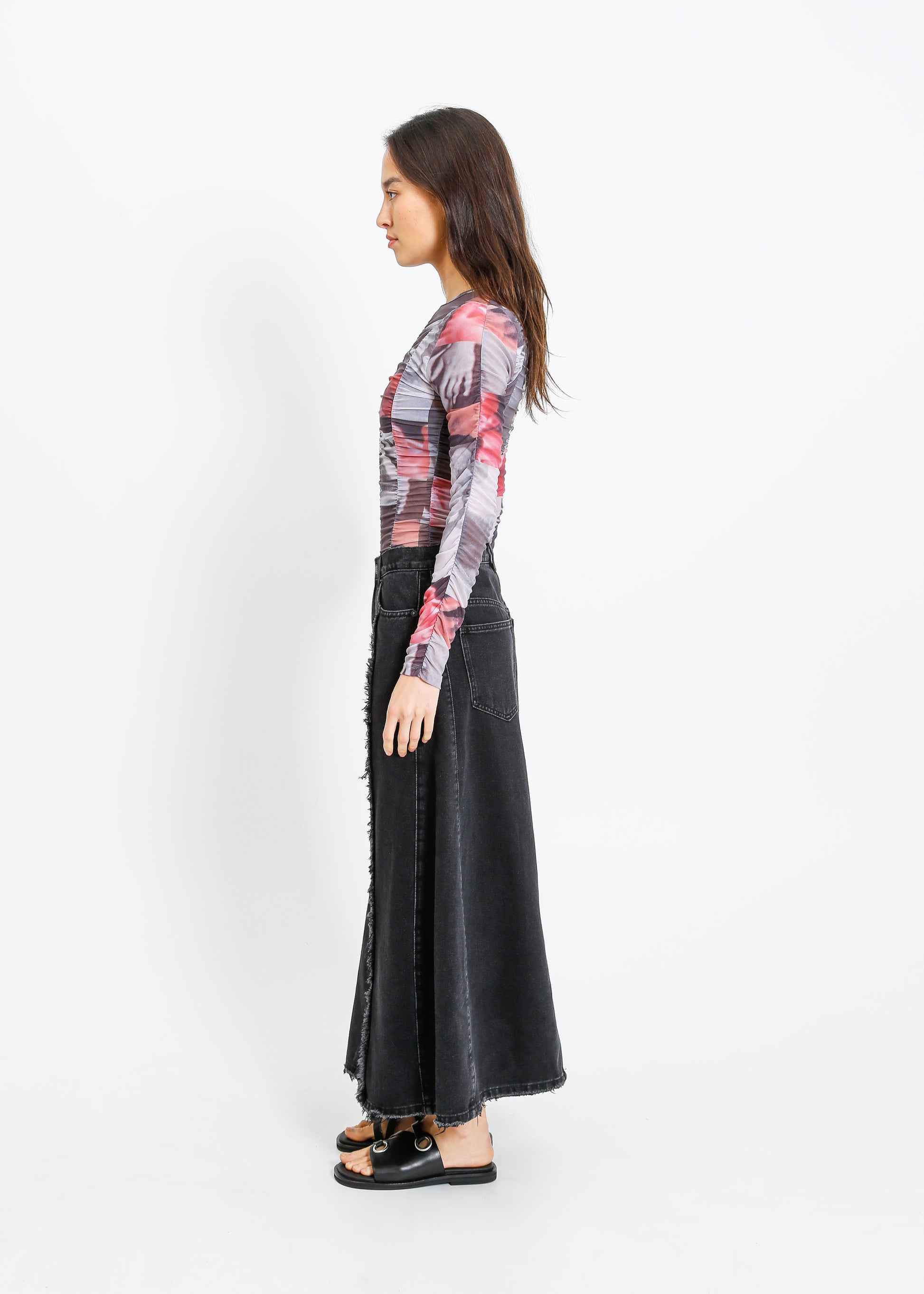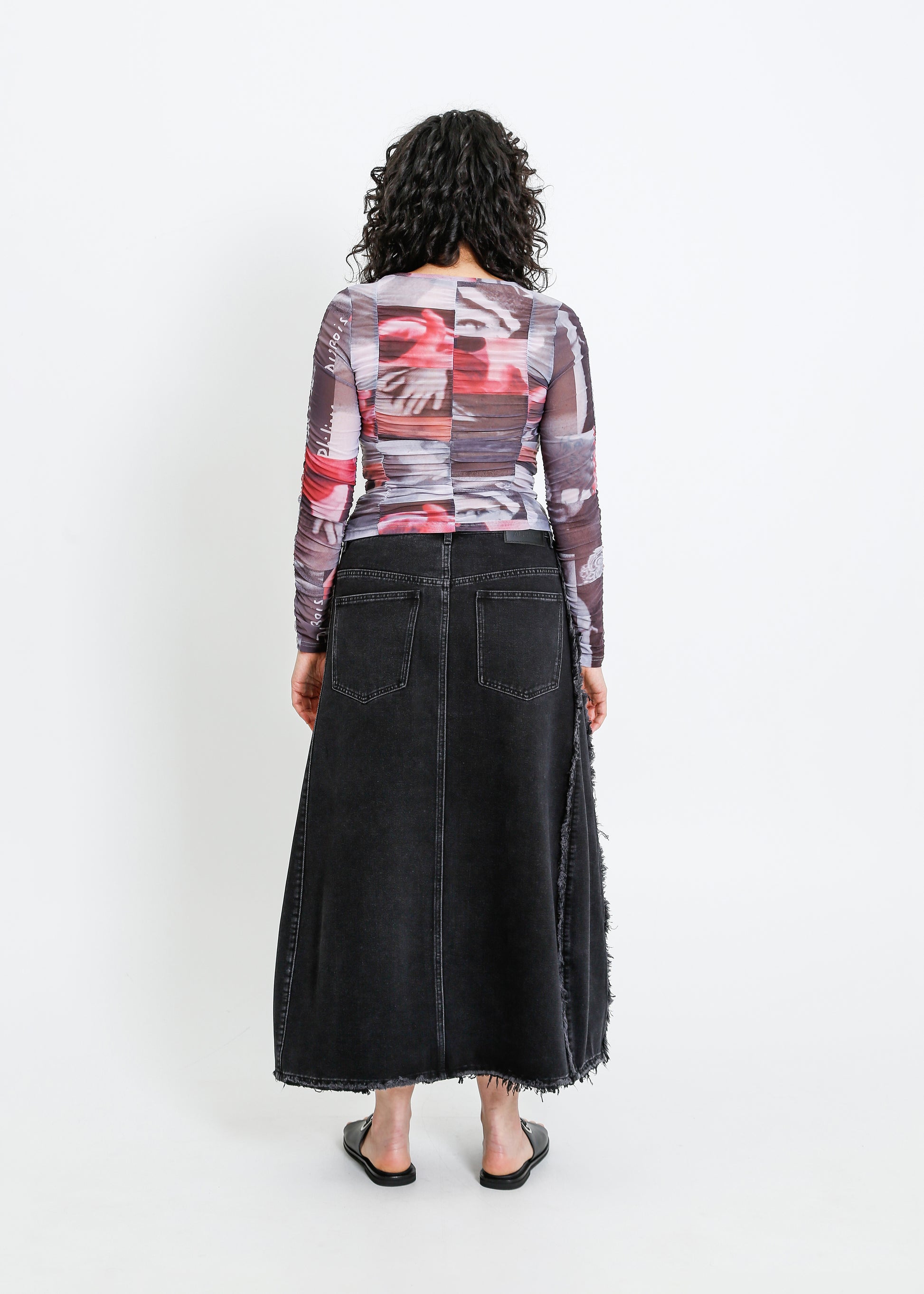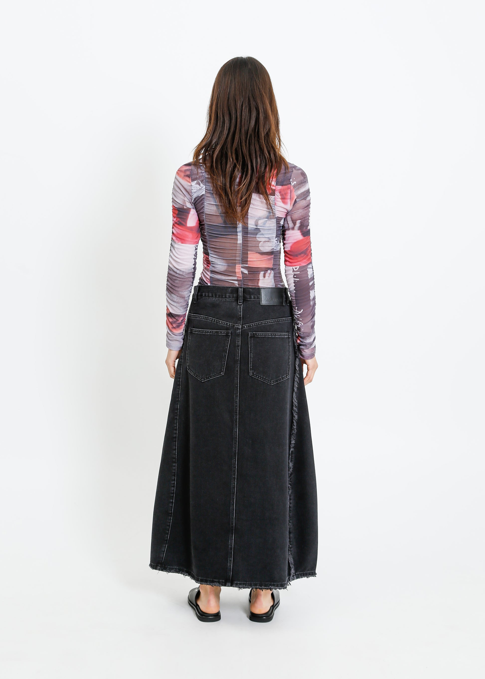 The ALPHA60 Jonah Denim Skirt is a modern take on a classic silhouette, featuring a cocoon fit and asymmetric raw seams for a unique edge. Crafted from rigid denim, this midi-length skirt of...