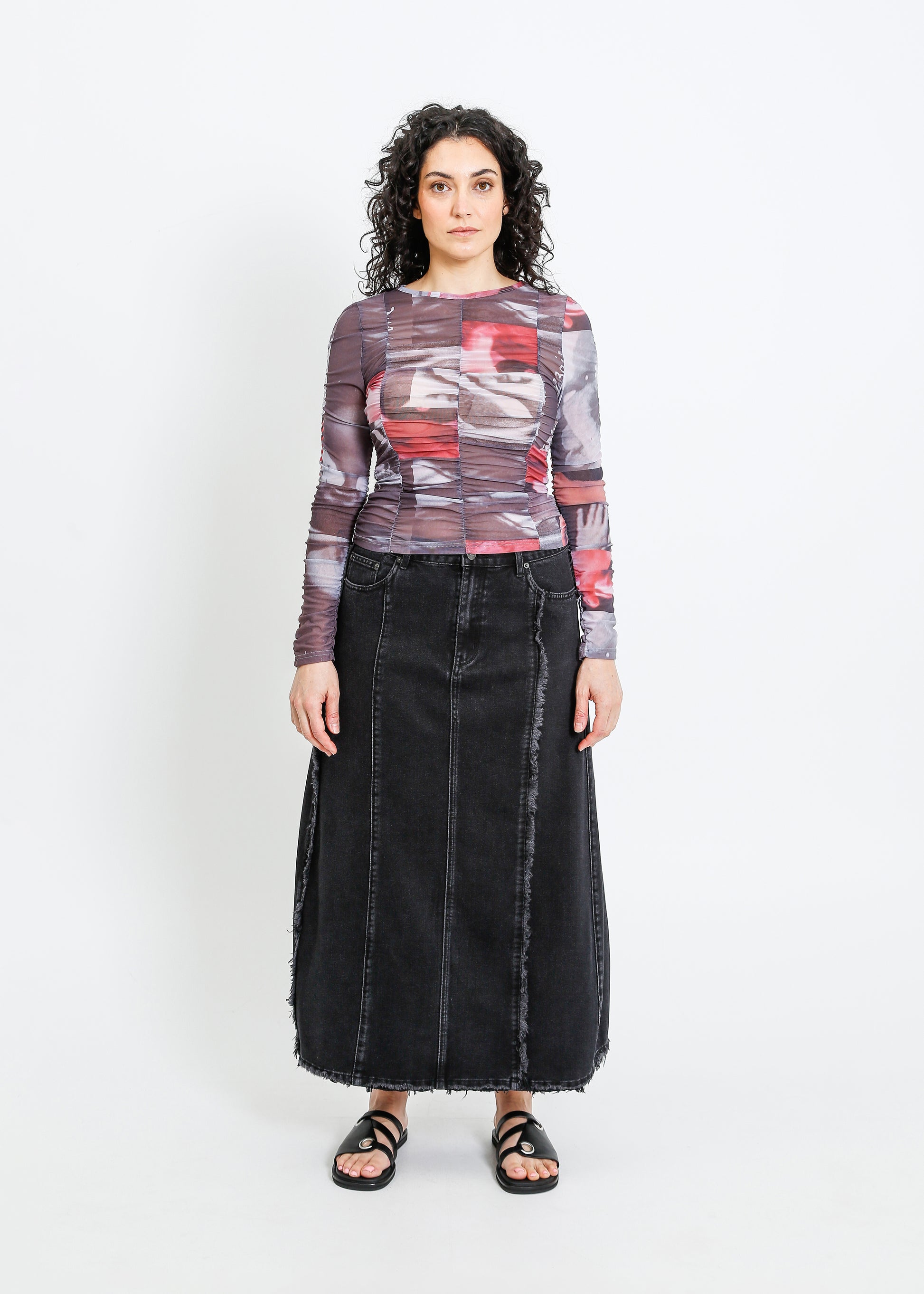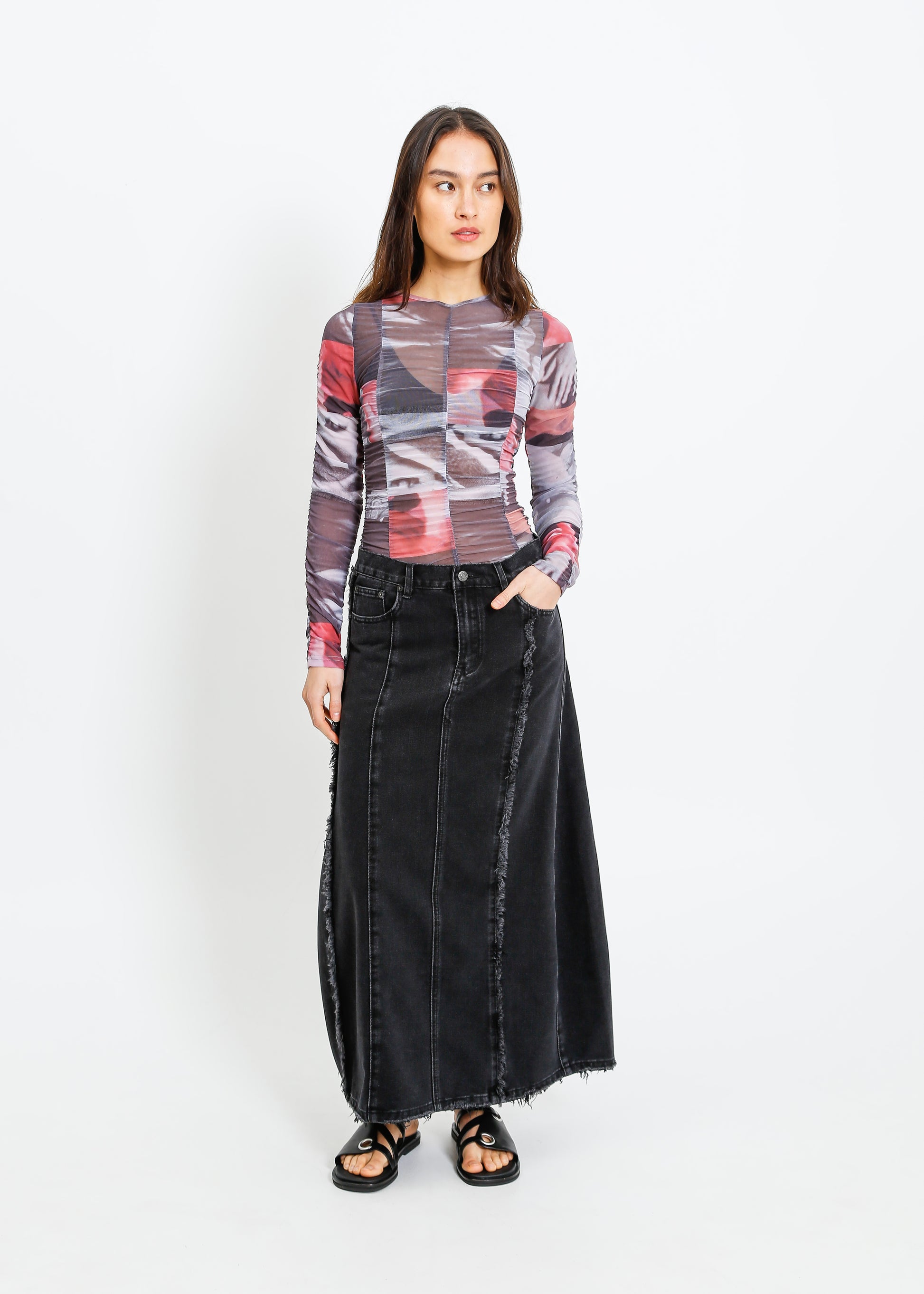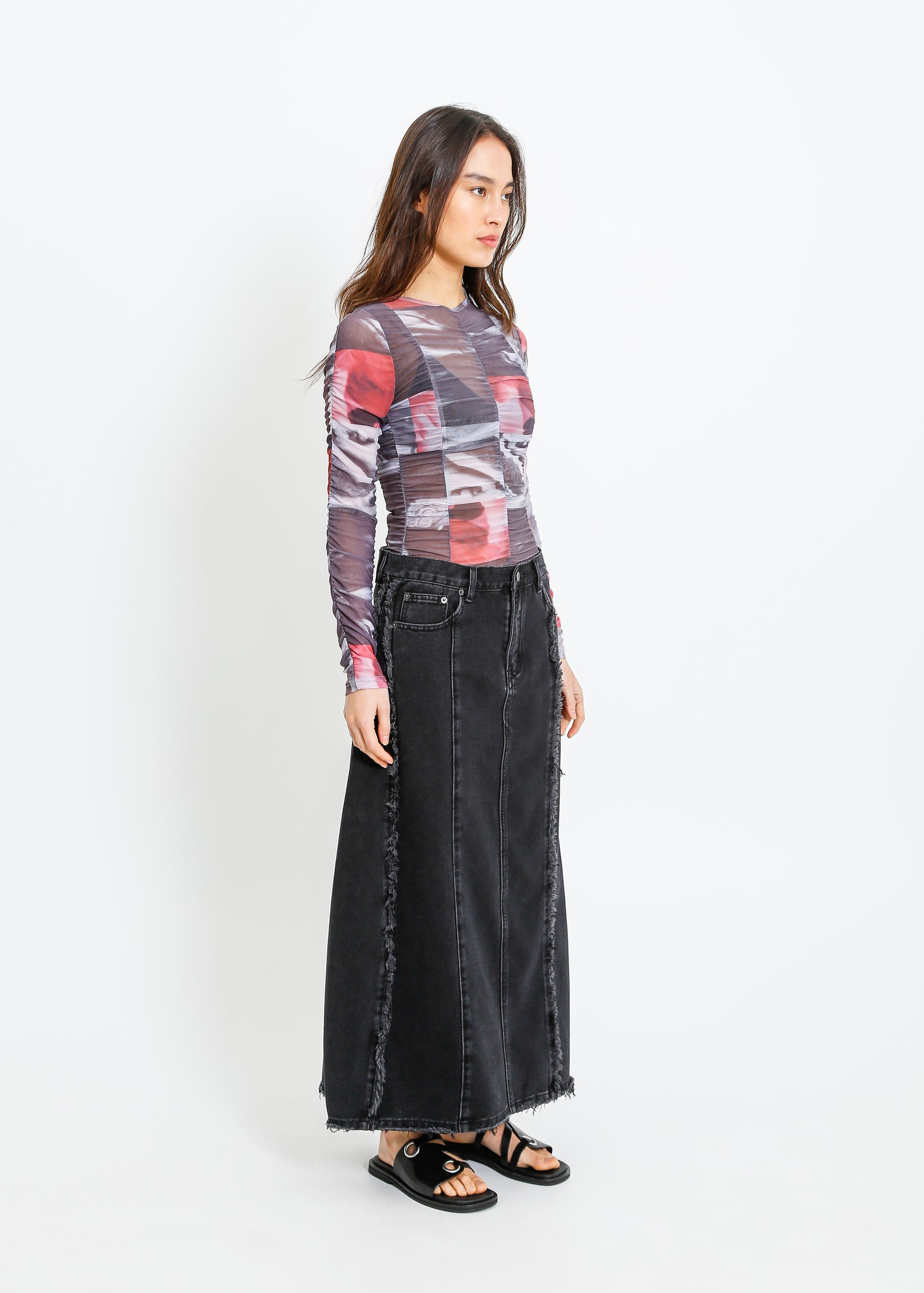 The ALPHA60 Jonah Denim Skirt is a modern take on a classic silhouette, featuring a cocoon fit and asymmetric raw seams for a unique edge. Crafted from rigid denim, this midi-length skirt of...