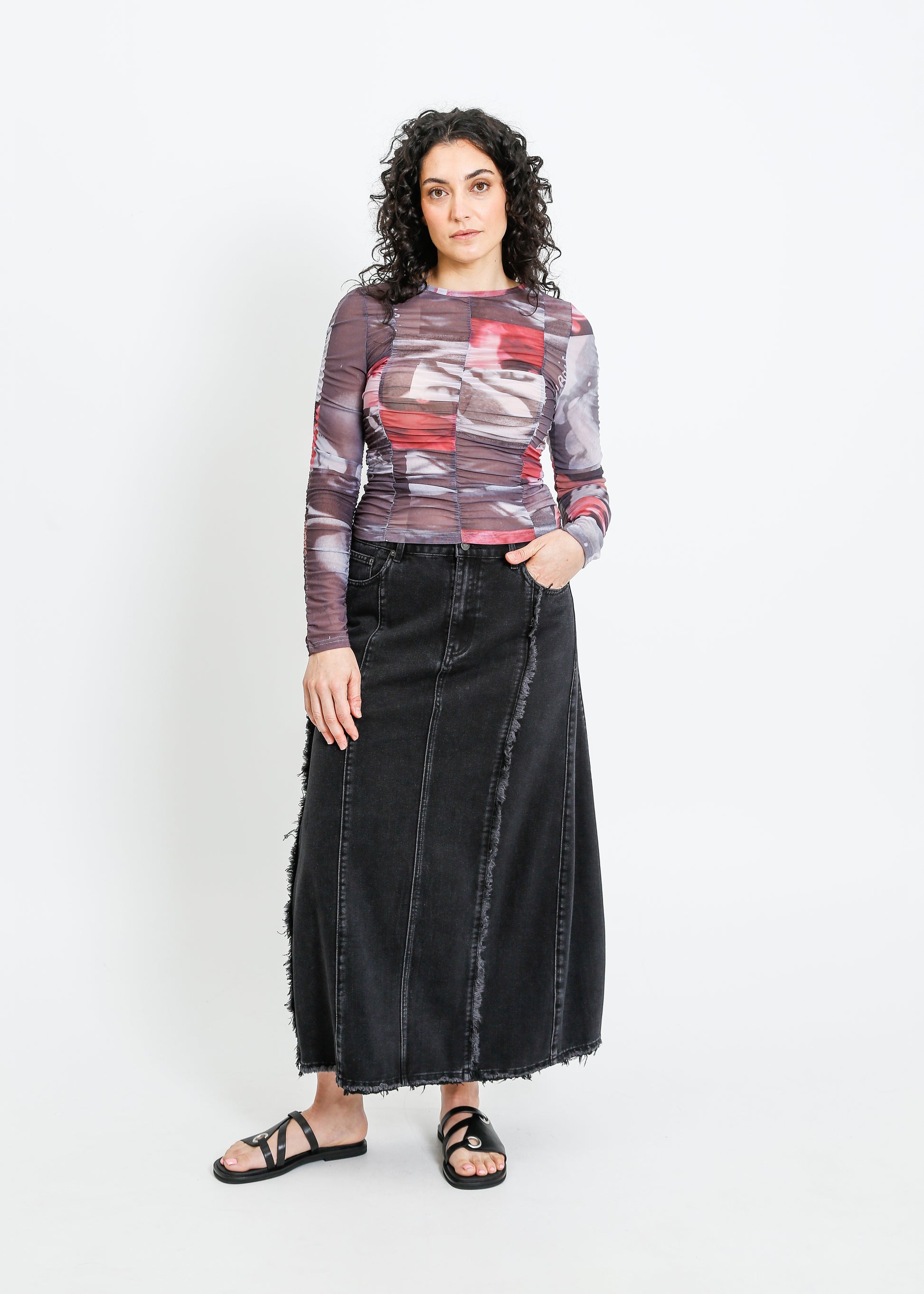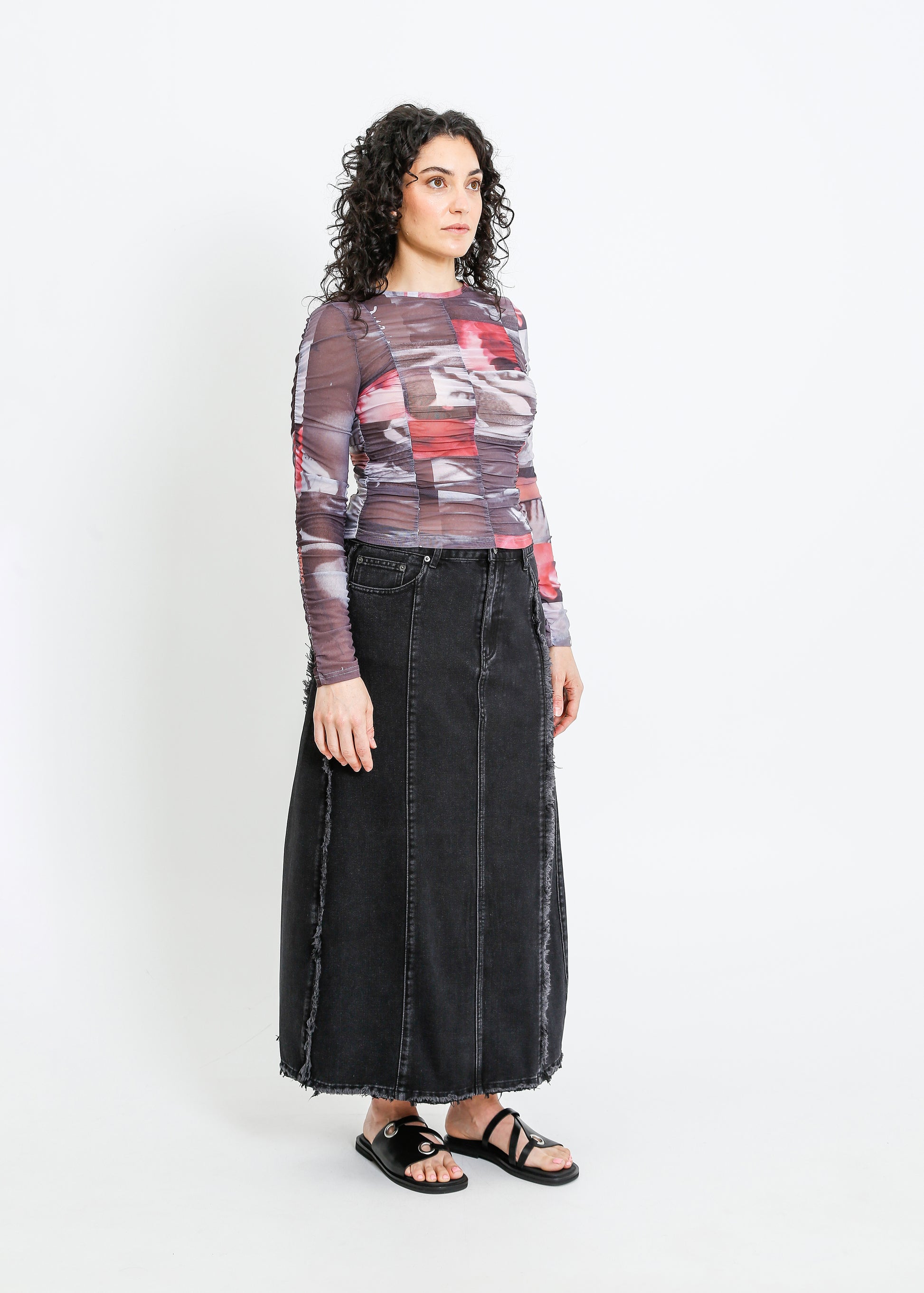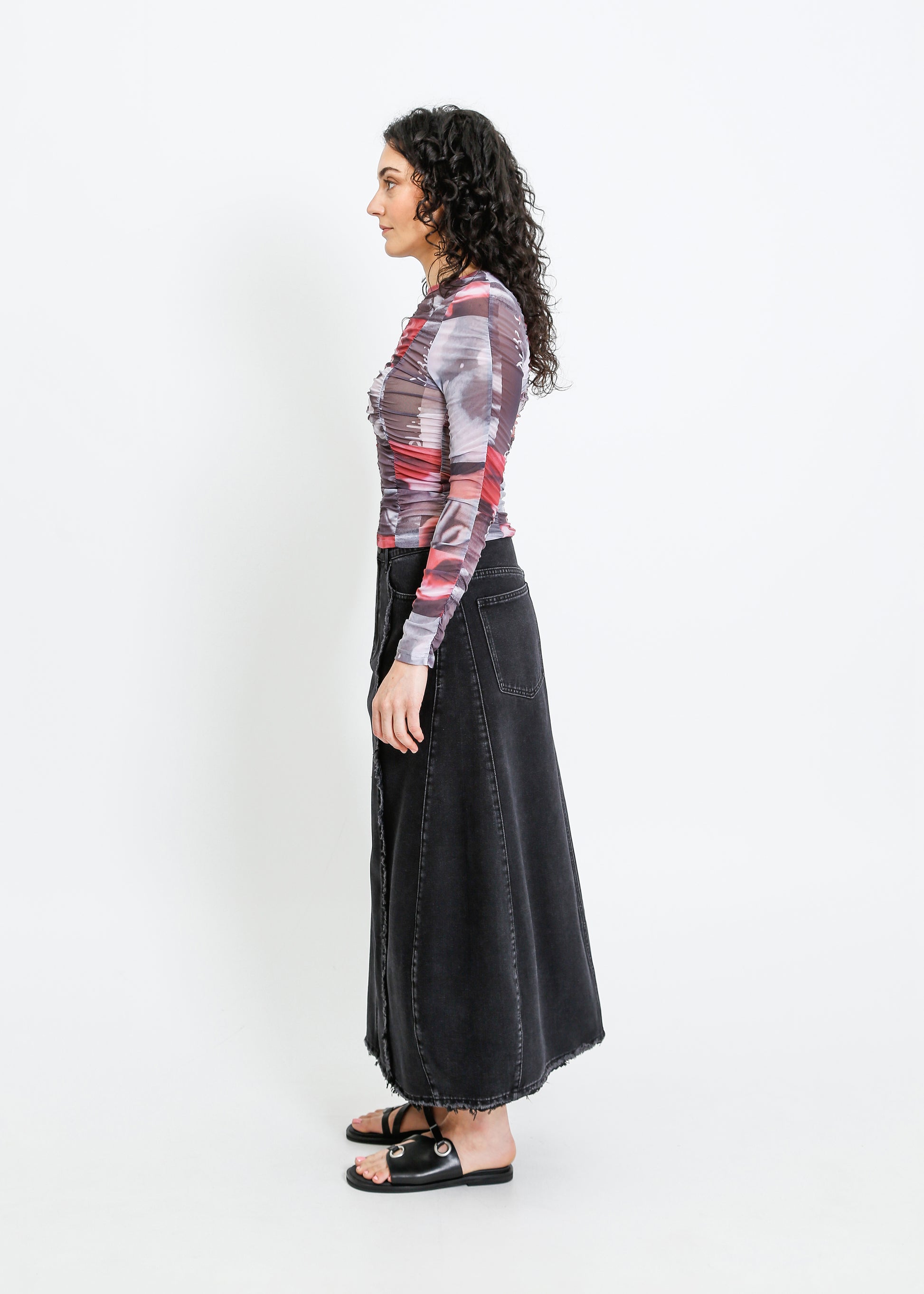 The ALPHA60 Jonah Denim Skirt is a modern take on a classic silhouette, featuring a cocoon fit and asymmetric raw seams for a unique edge. Crafted from rigid denim, this midi-length skirt offers timeless style with a contemporary twist, making it a versatile addition to any wardrobe. The classic 5-pocket design and mid-rise waist ensure both comfort and functionality, perfect for everyday wear.