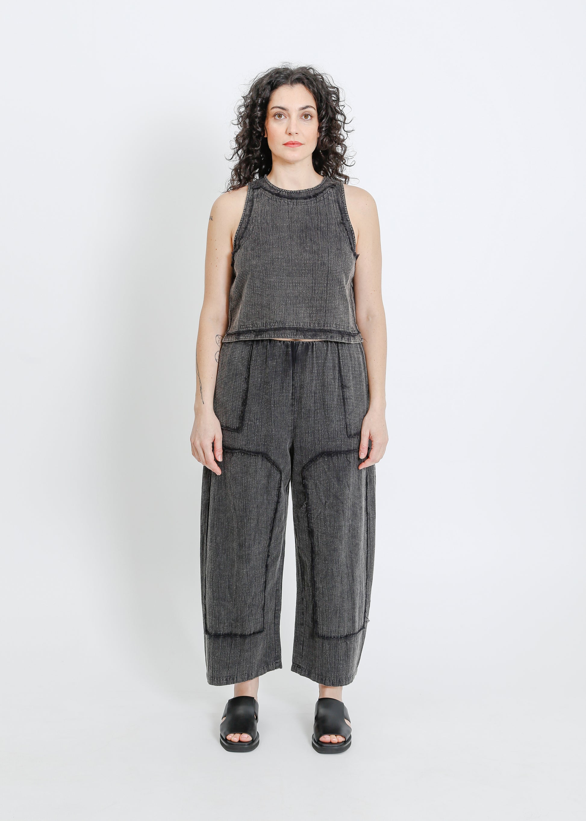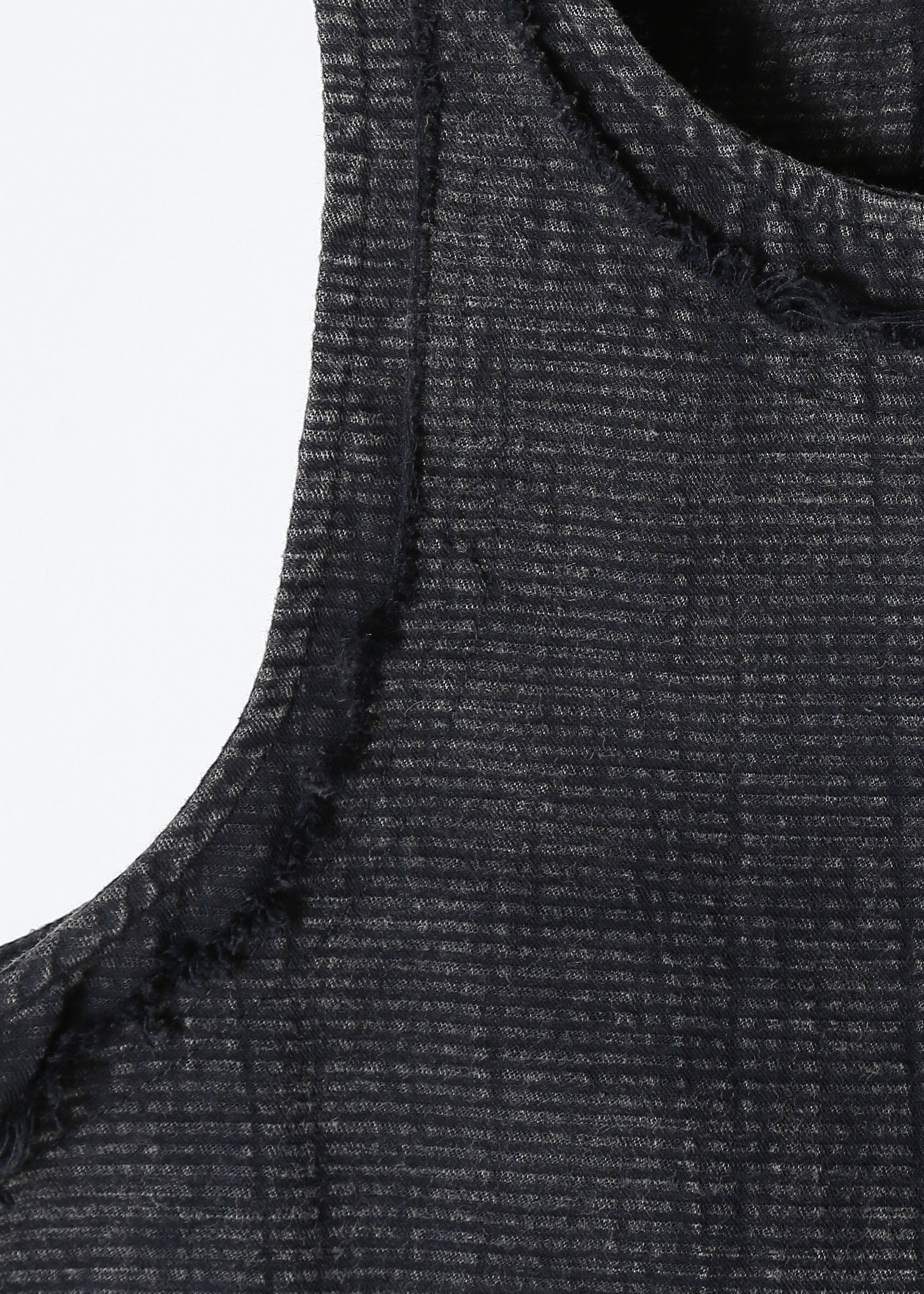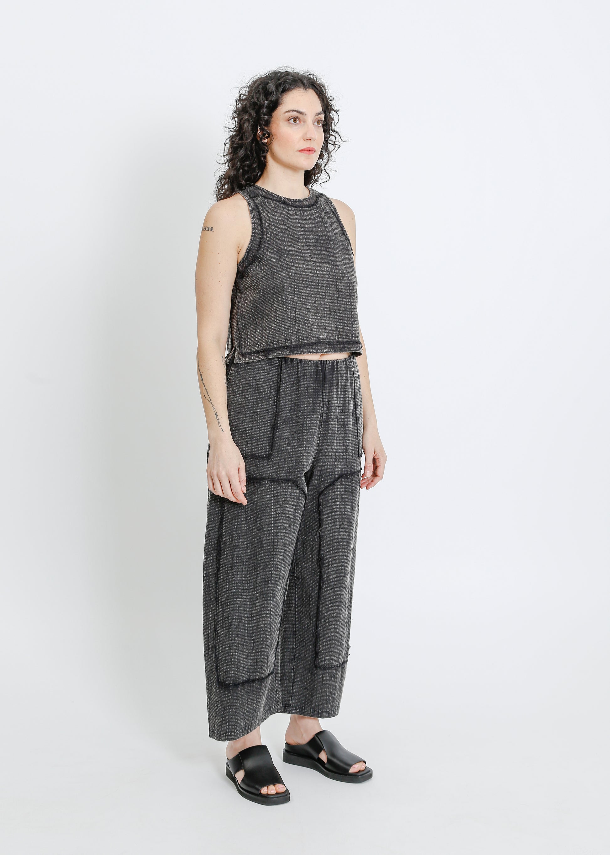 The ALPHA60 Leslie Top is a modern sleeveless crew neck style, crafted in a washed black cotton-ramie blend. Featuring a cropped silhouette, this top is defined by its front and back outline patch detail and intentionally frayed seams, designed to develop more character with every wash and wear. A versatile piece that brings a unique edge to your wardrobe.