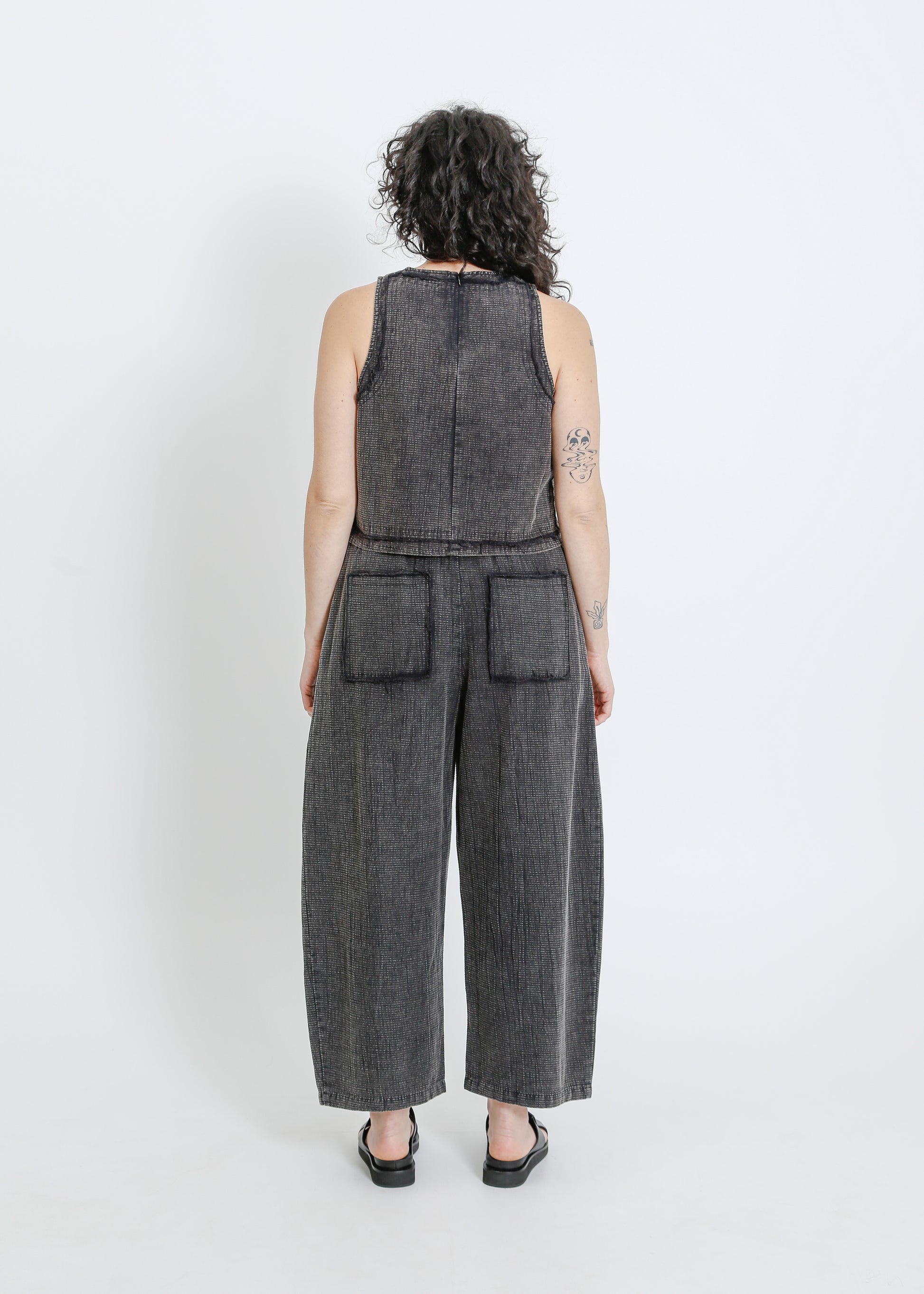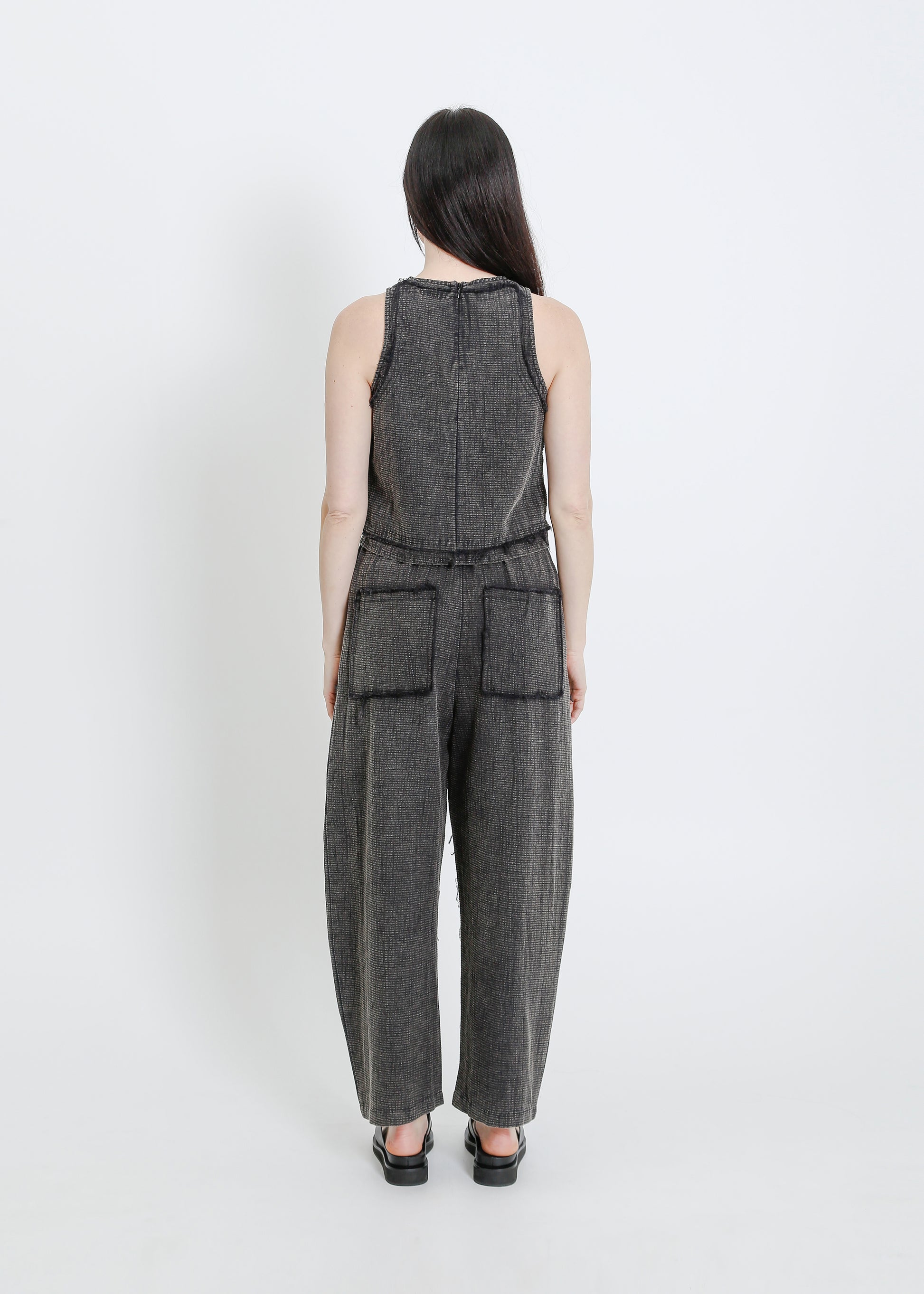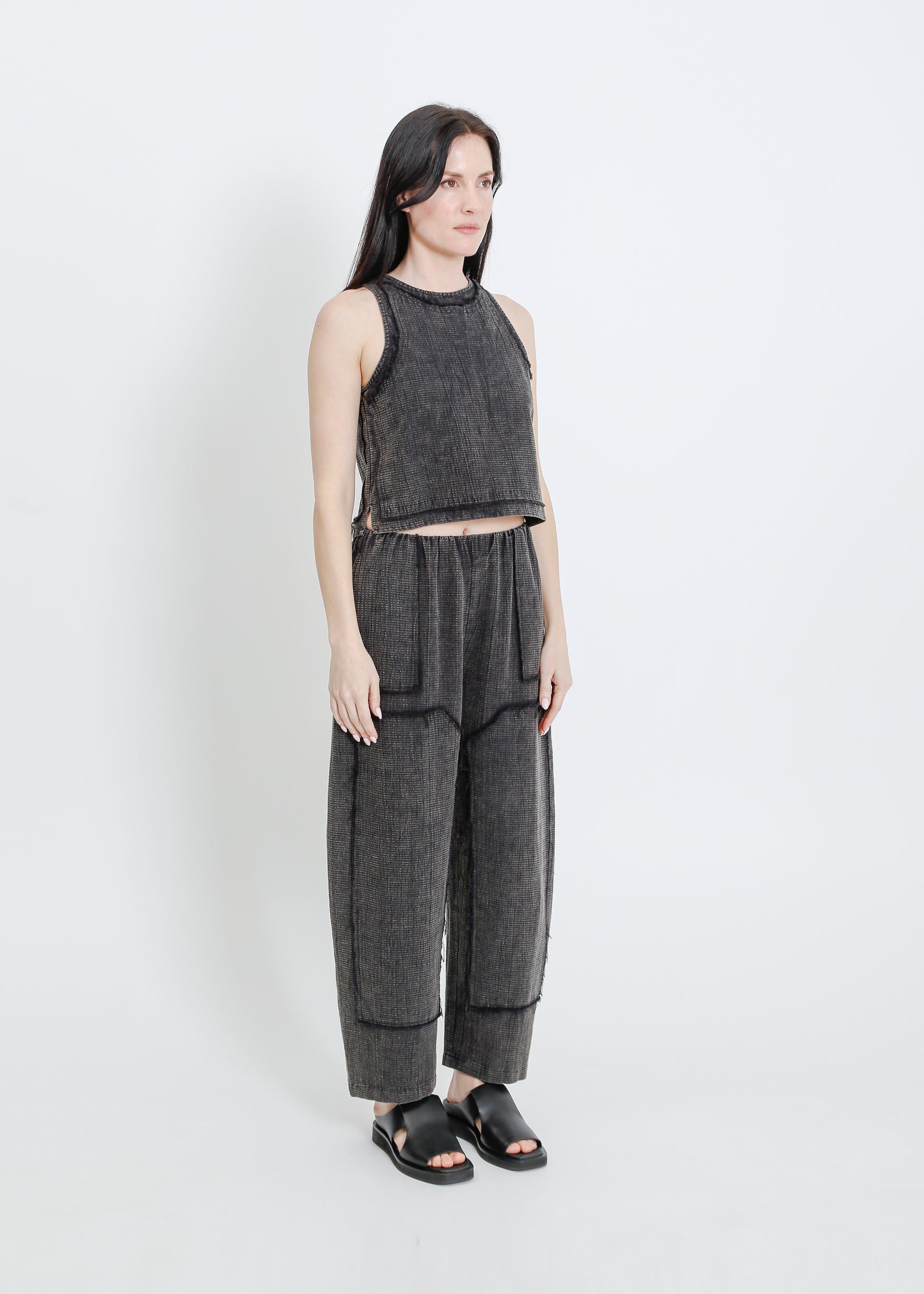 The ALPHA60 Leslie Top is a modern sleeveless crew neck style, crafted in a washed black cotton-ramie blend. Featuring a cropped silhouette, this top is defined by its front and back outline patch detail and intentionally frayed seams, designed to develop more character with every wash and wear. A versatile piece that brings a unique edge to your wardrobe.
