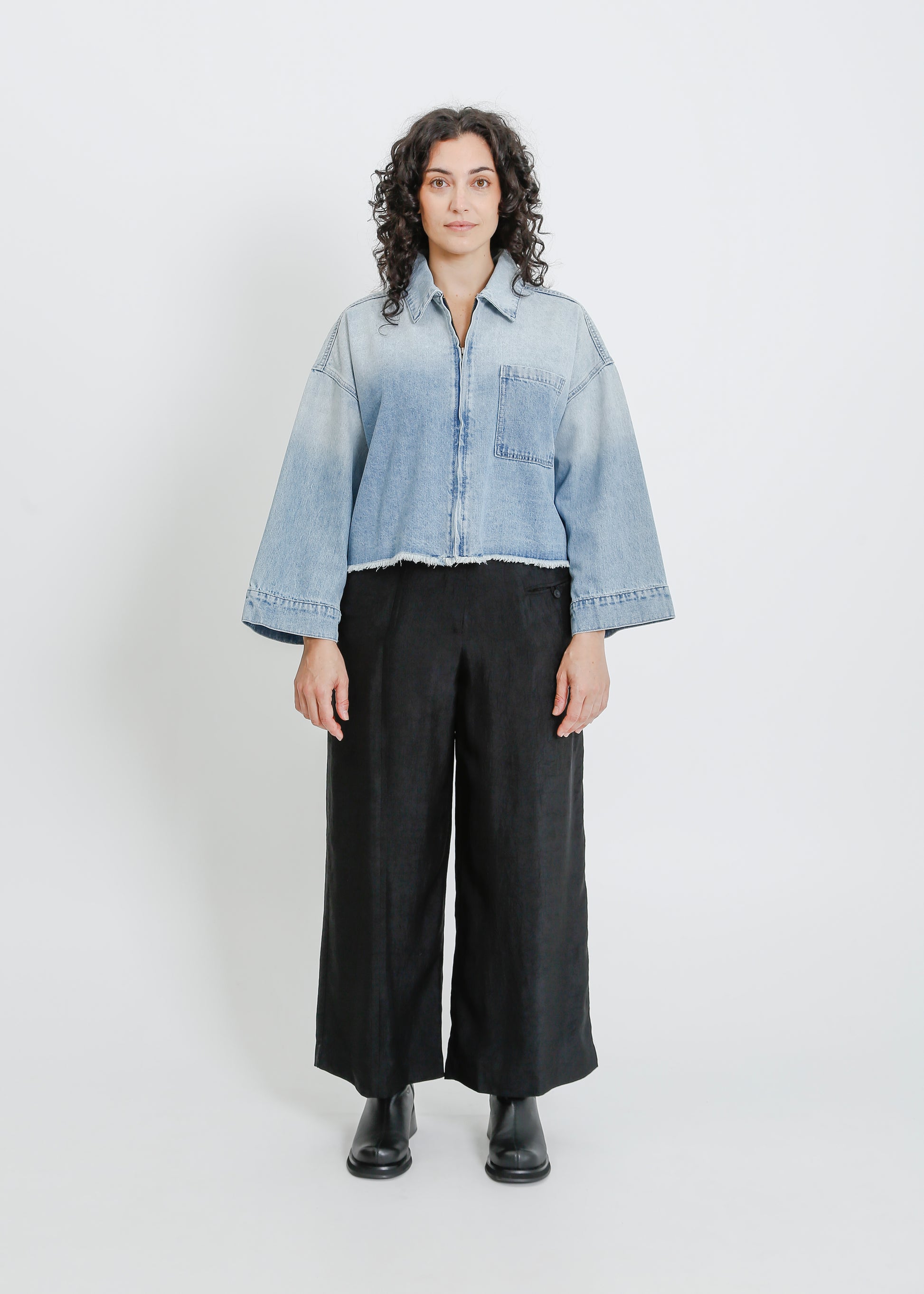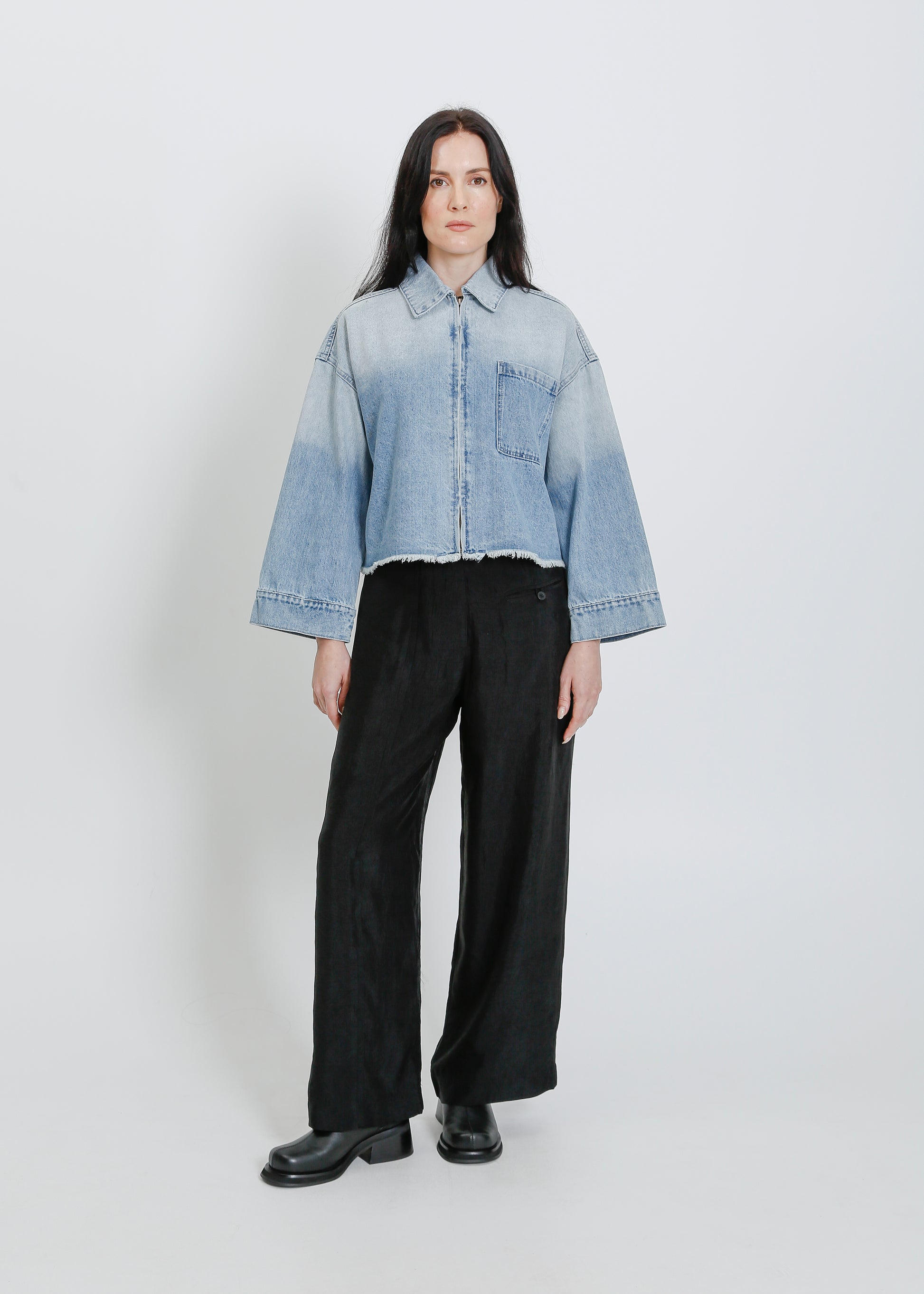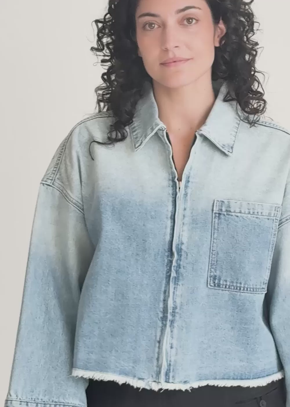 The ALPHA60 Chicago Jacket is a relaxed fitting cropped jacket that features a centre front zip opening and drop shoulder silhouette. The Chicago Jacket is distinguished by its wide sleeves, finished with wide cuffs for a bold, contemporary look. A practical patch chest pocket adds a touch of utility, while the raw hem, intended to fray with wear, lends the jacket to a unique charm. The jacket has been cut from a rigid cotton blend denim in a cool ombre wash in light indigo.