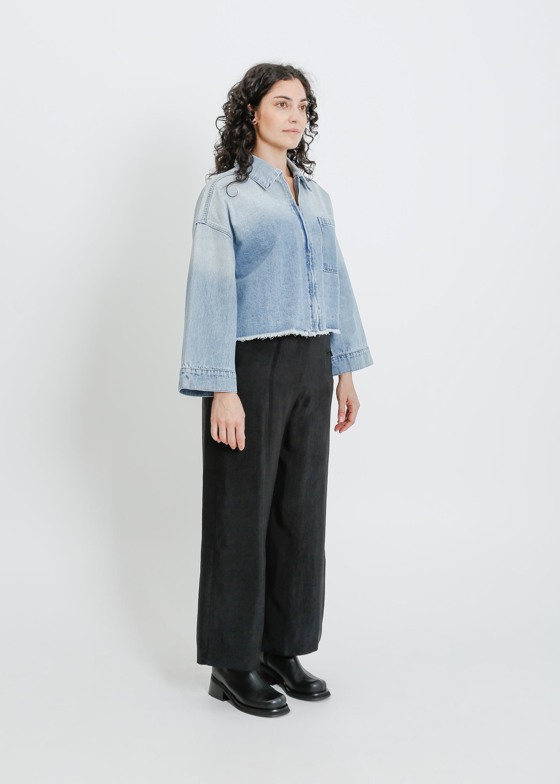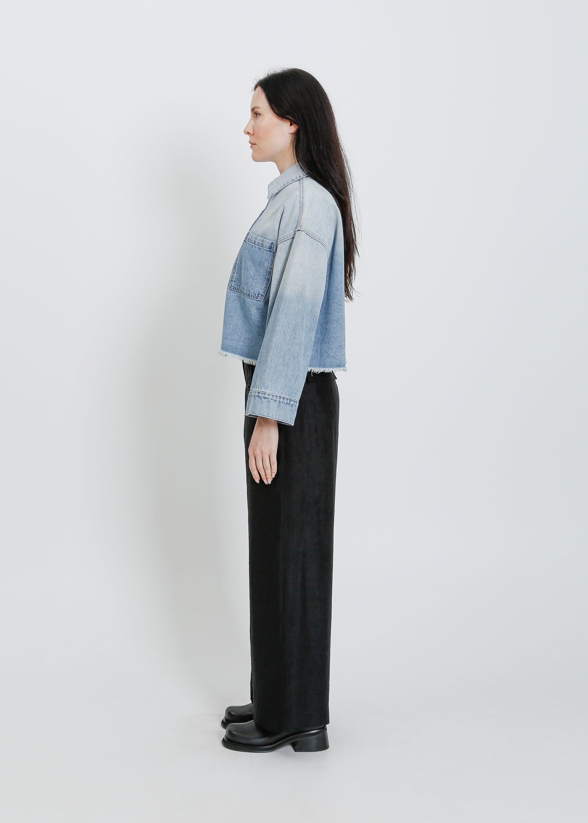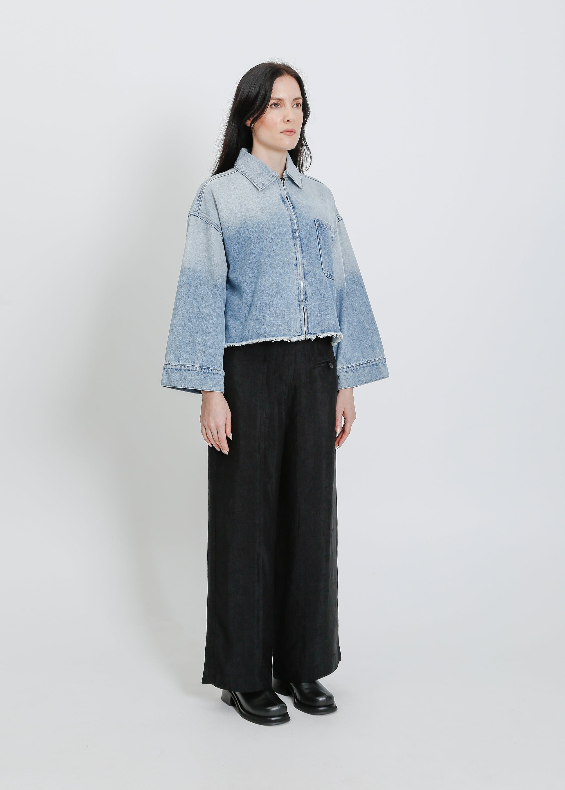 The ALPHA60 Chicago Jacket is a relaxed fitting cropped jacket that features a centre front zip opening and drop shoulder silhouette. The Chicago Jacket is distinguished by its wide sleeves, finished with wide cuffs for a bold, contemporary look. A practical patch chest pocket adds a touch of utility, while the raw hem, intended to fray with wear, lends the jacket to a unique charm. The jacket has been cut from a rigid cotton blend denim in a cool ombre wash in light indigo.