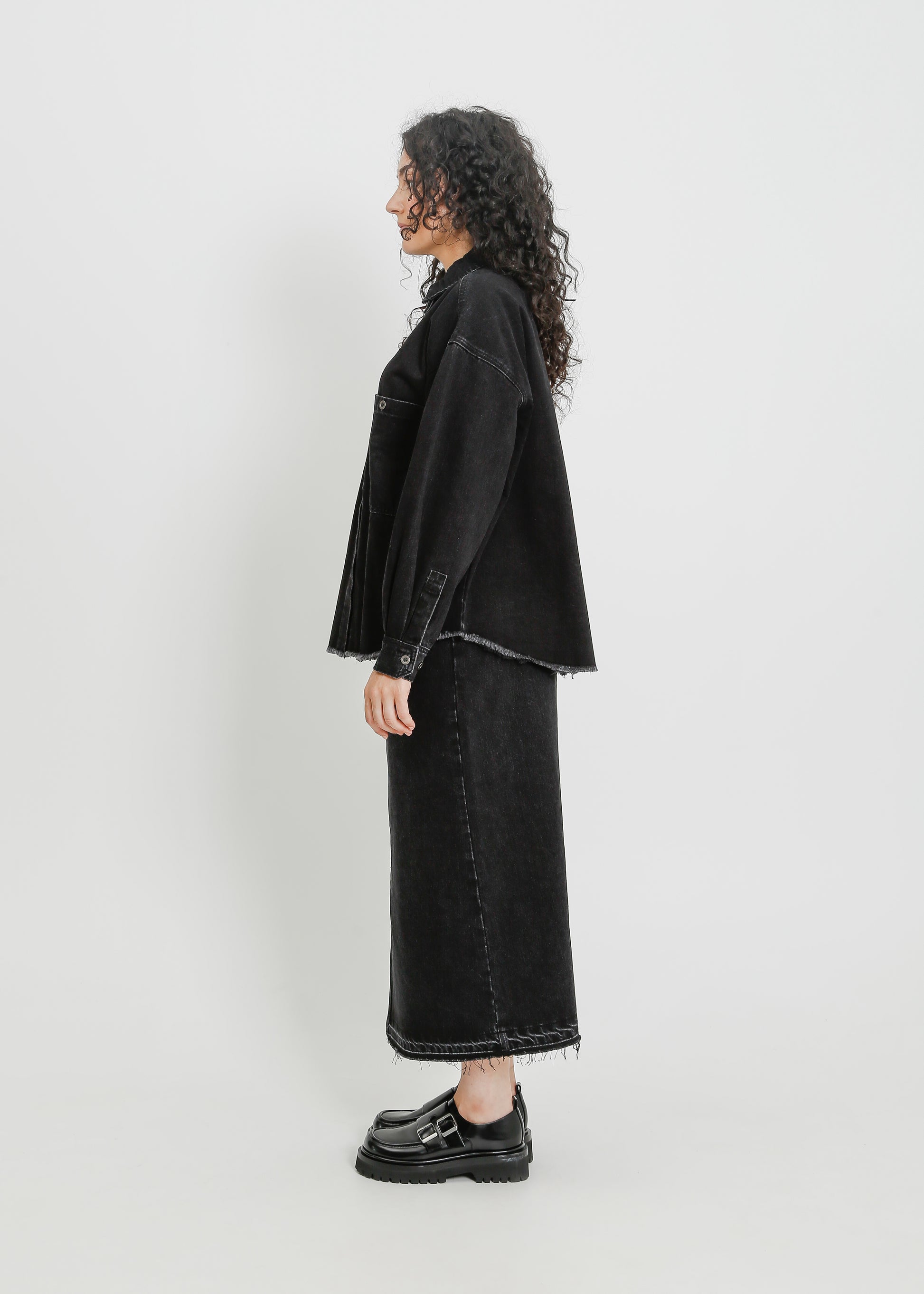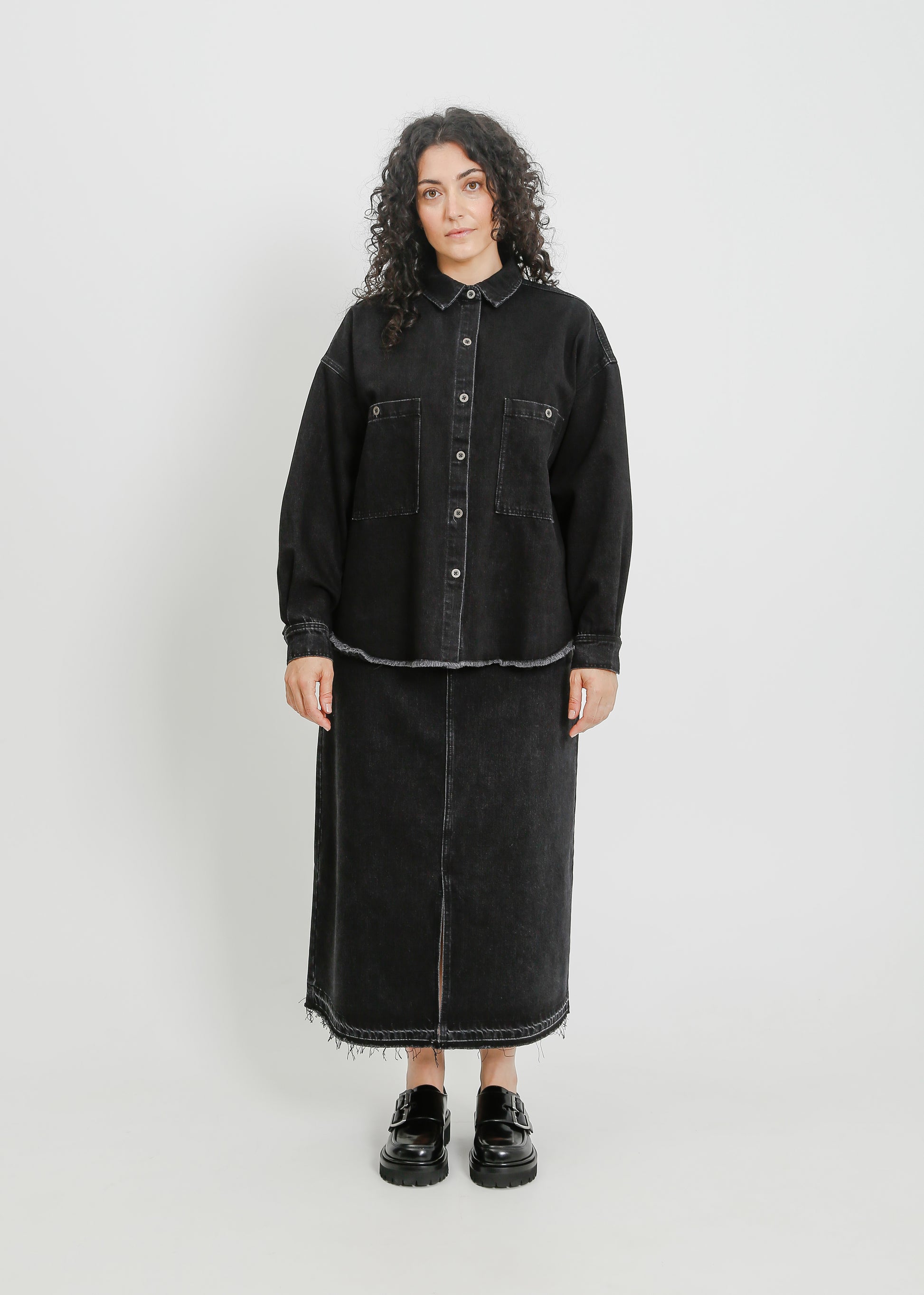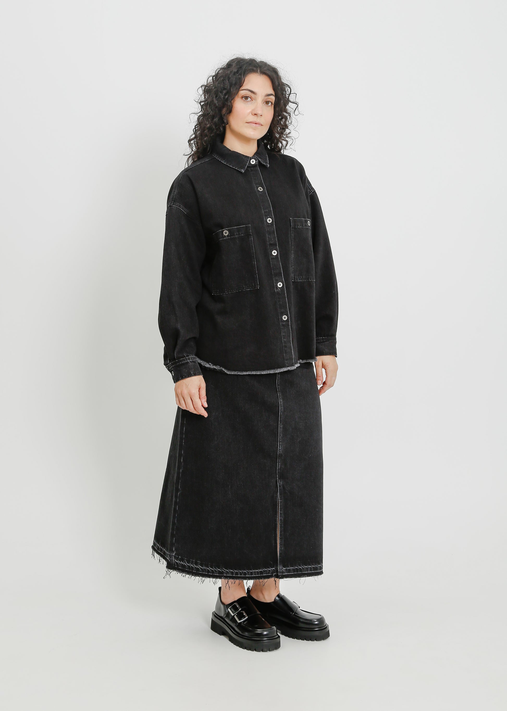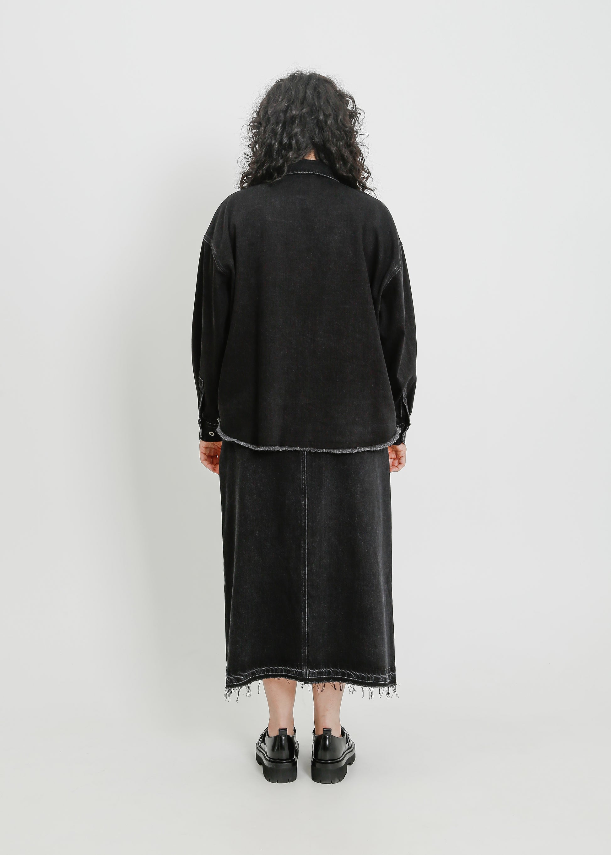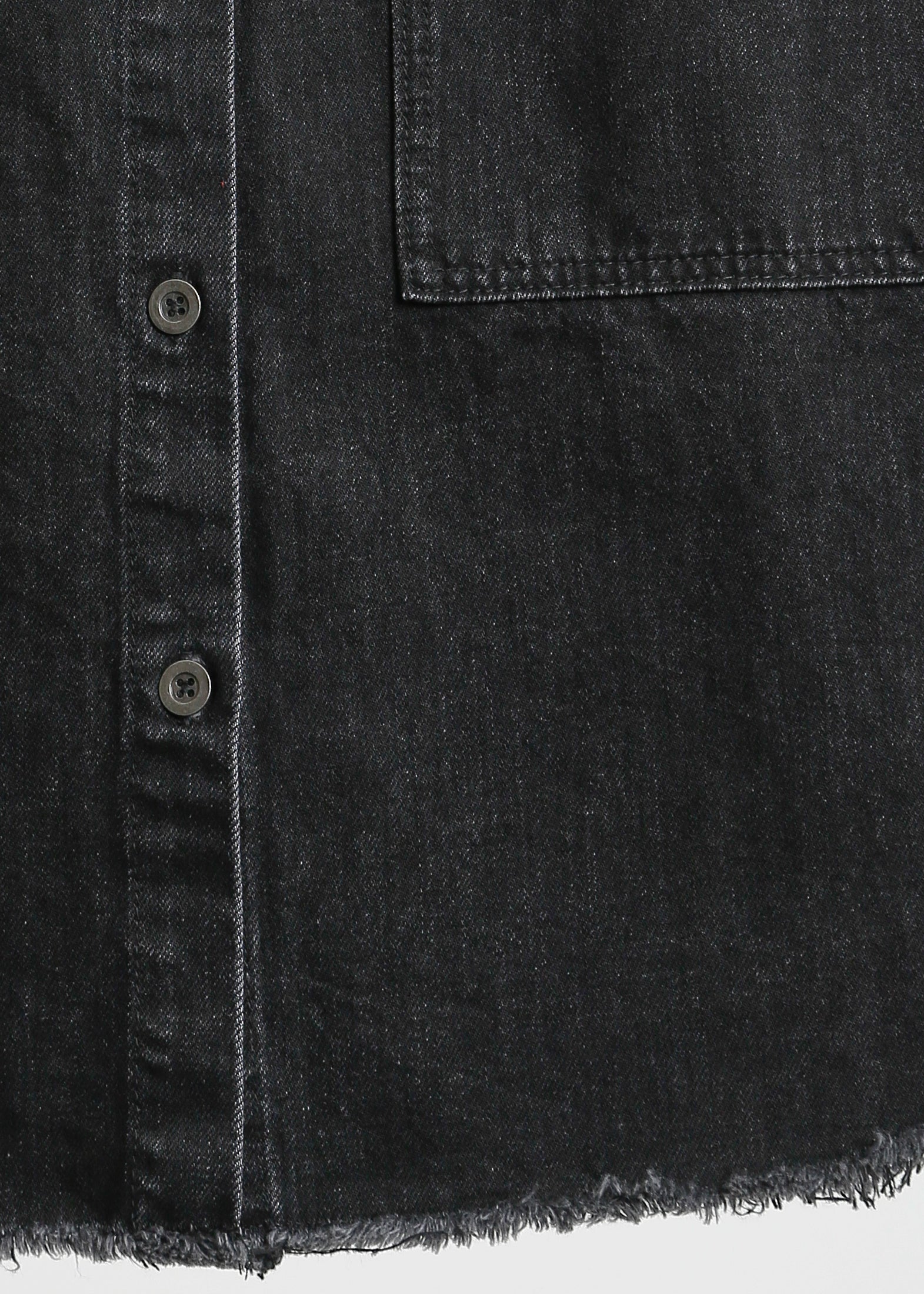 The Ennis Overshirt boasts a distinctive curved raw hemline that is designed to fray over time. The shirt has been crafted from soft, rigid denim in a washed black and has been accented with antique silver hardware and contrast tan topstitching. Whether worn unbuttoned as a casual layering option or buttoned up for a polished look, the ALPHA60 Ennis Overshirt is a versatile addition to any wardrobe.