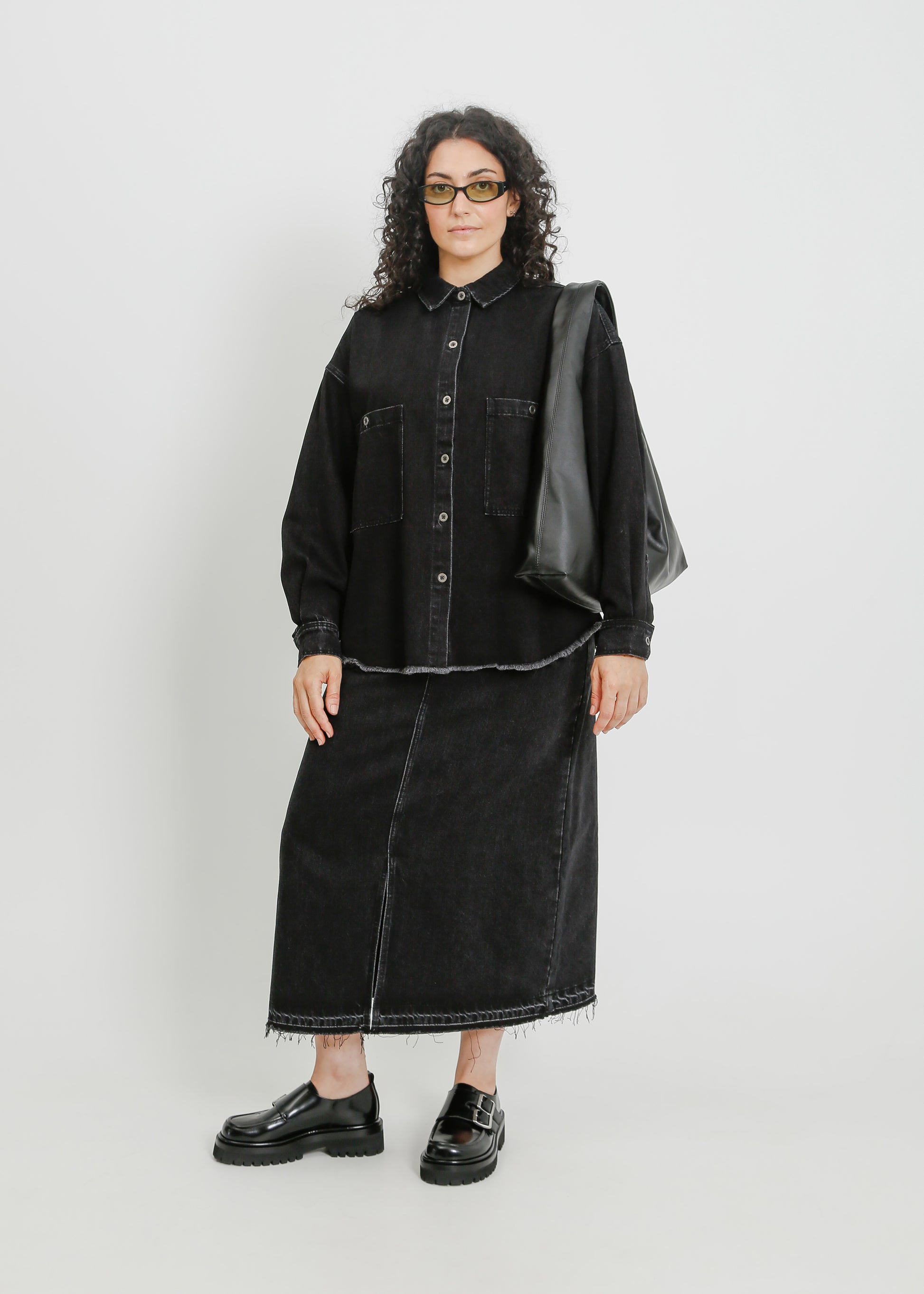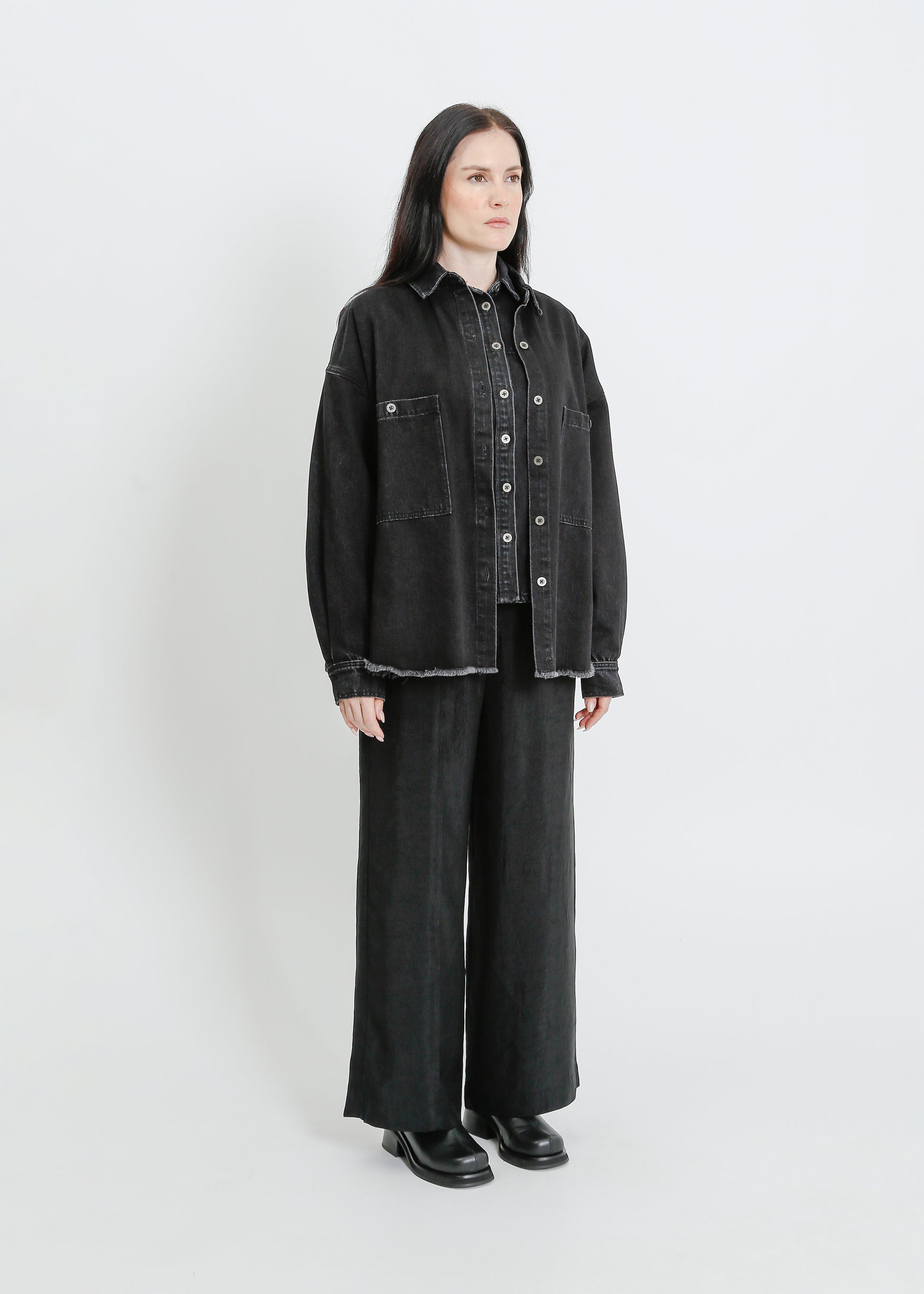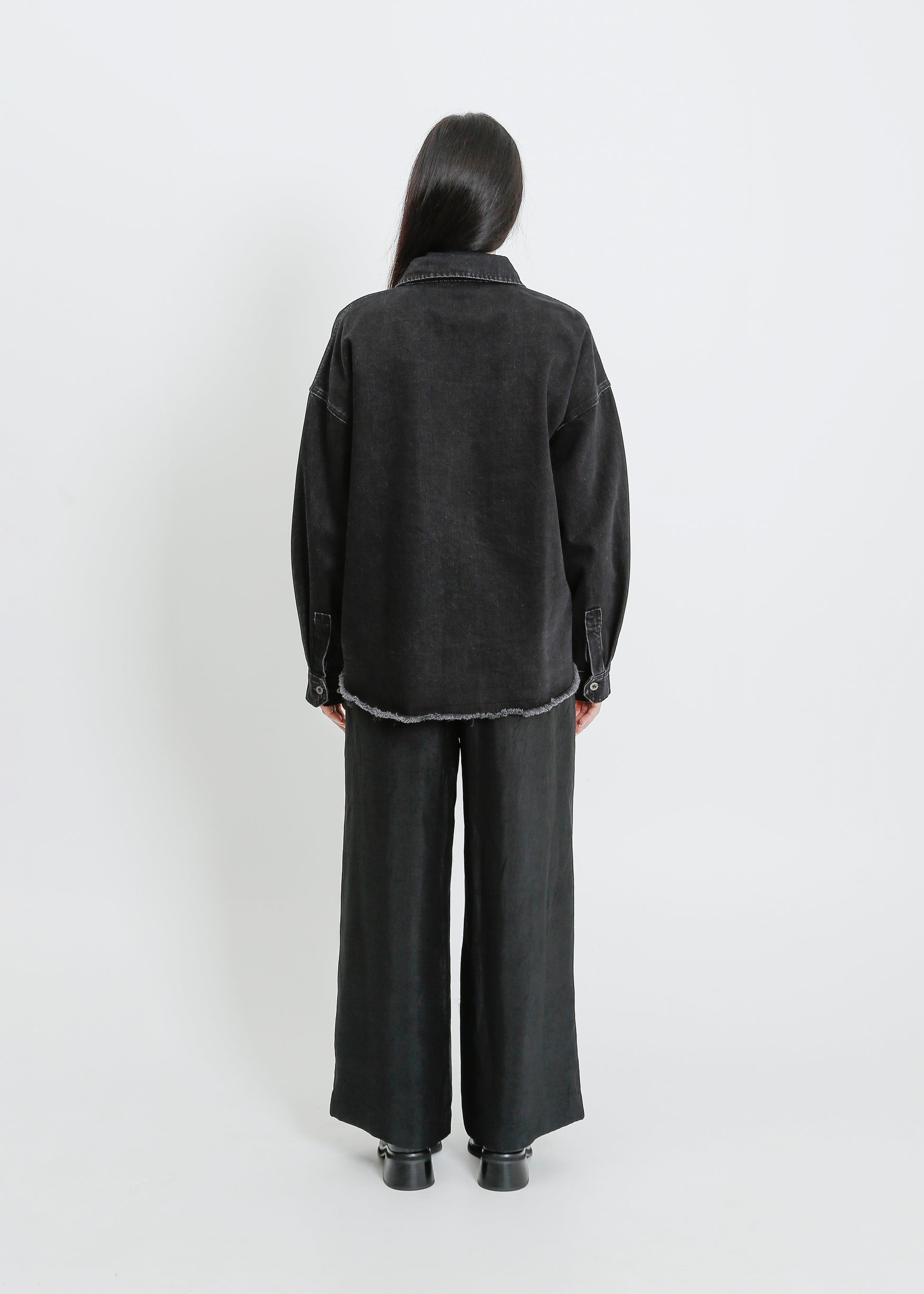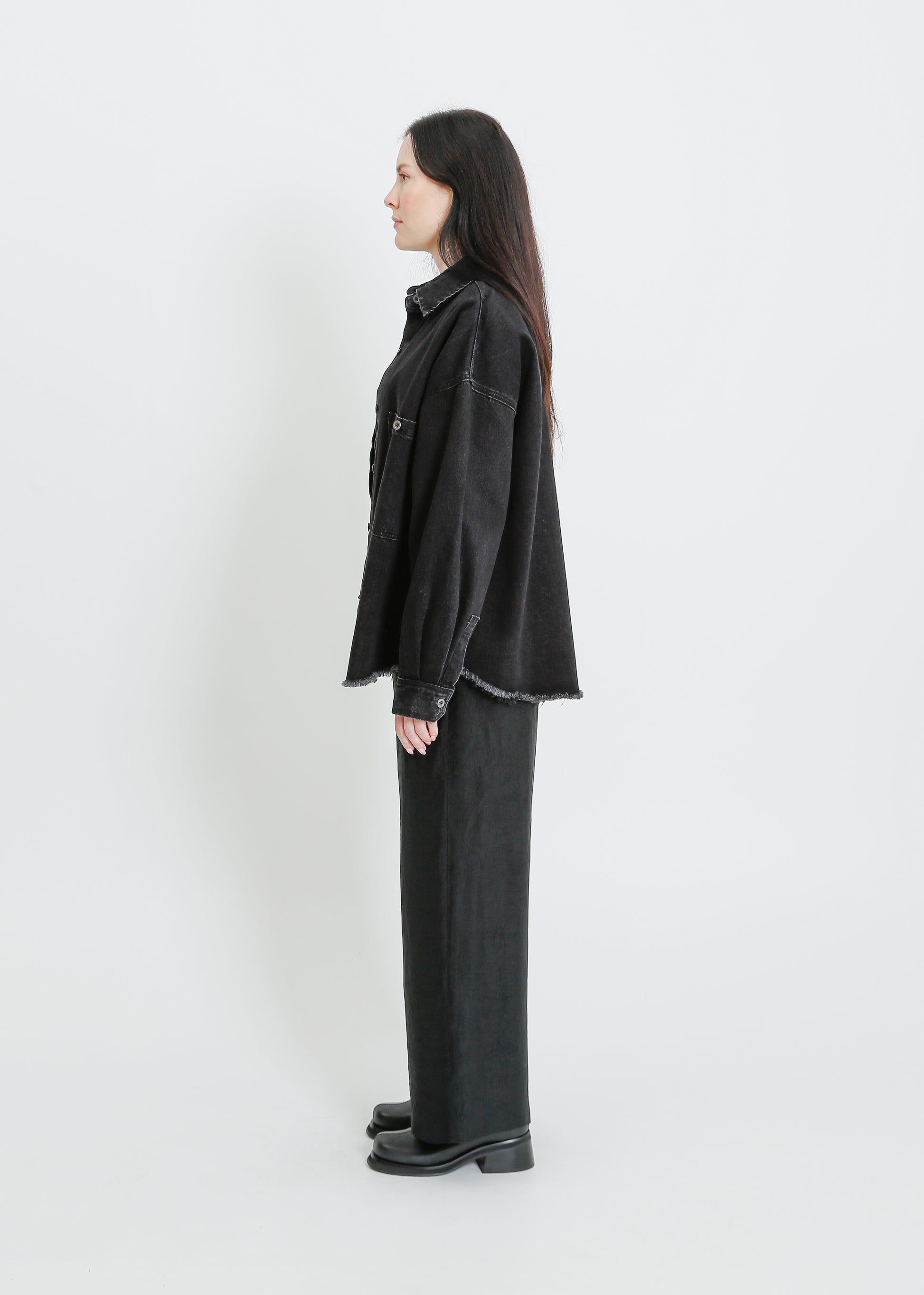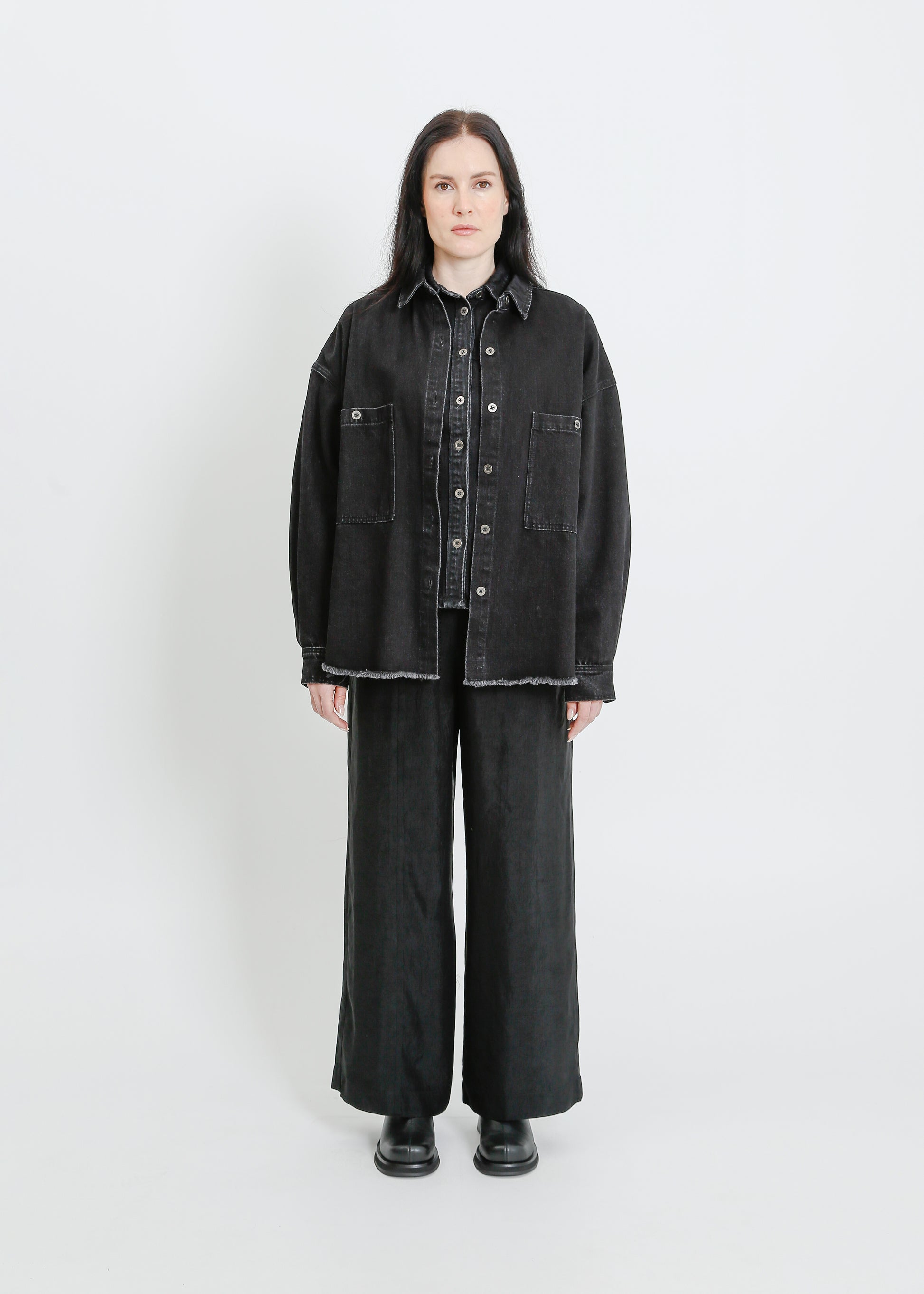 The Ennis Overshirt boasts a distinctive curved raw hemline that is designed to fray over time. The shirt has been crafted from soft, rigid denim in a washed black and has been accented with antique silver hardware and contrast tan topstitching. Whether worn unbuttoned as a casual layering option or buttoned up for a polished look, the ALPHA60 Ennis Overshirt is a versatile addition to any wardrobe.