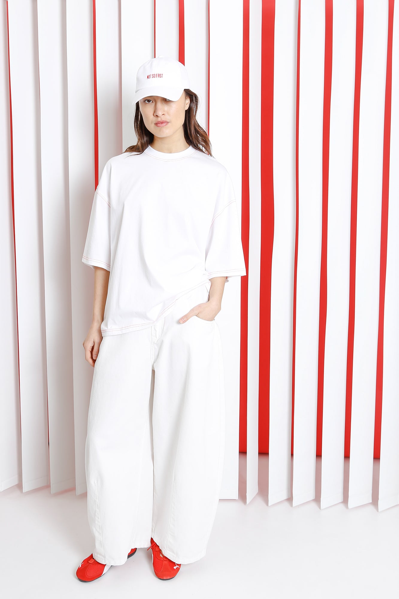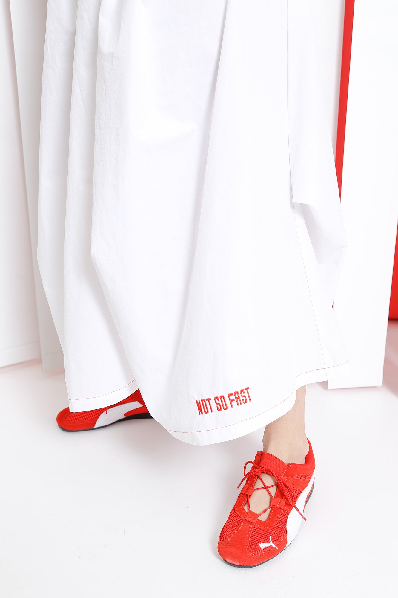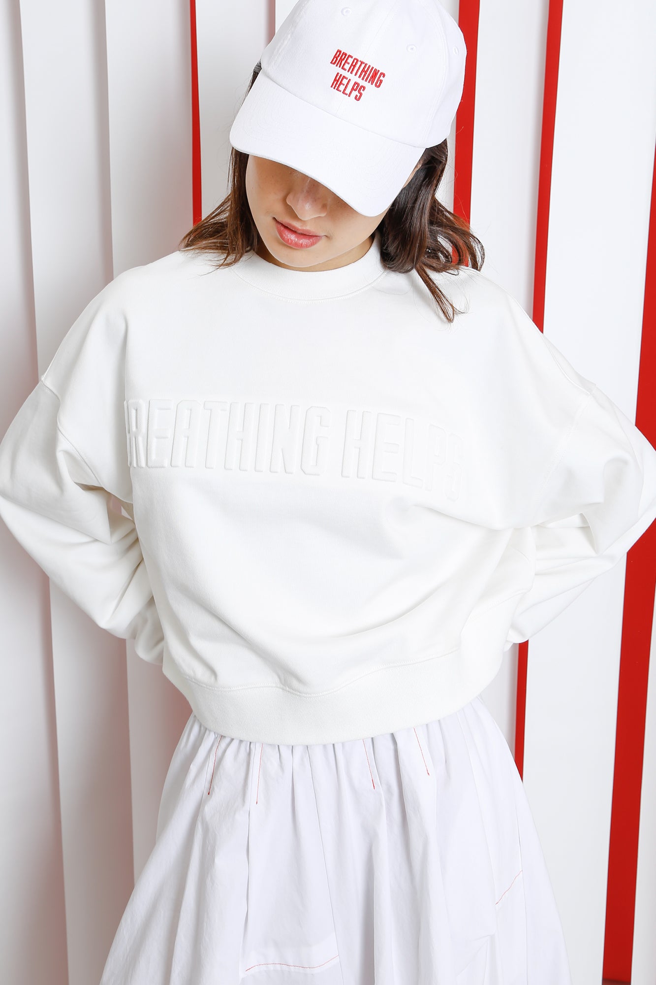 Key phrases from her work—“BREATHING HELPS” and “NOT SO FAST”—are embossed or embroidered across each piece, reflecting the interplay of text and material that defines her practice.