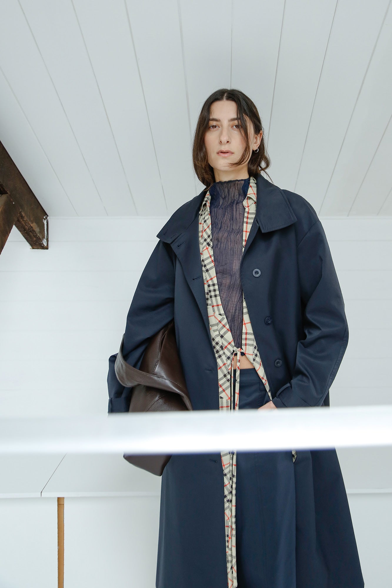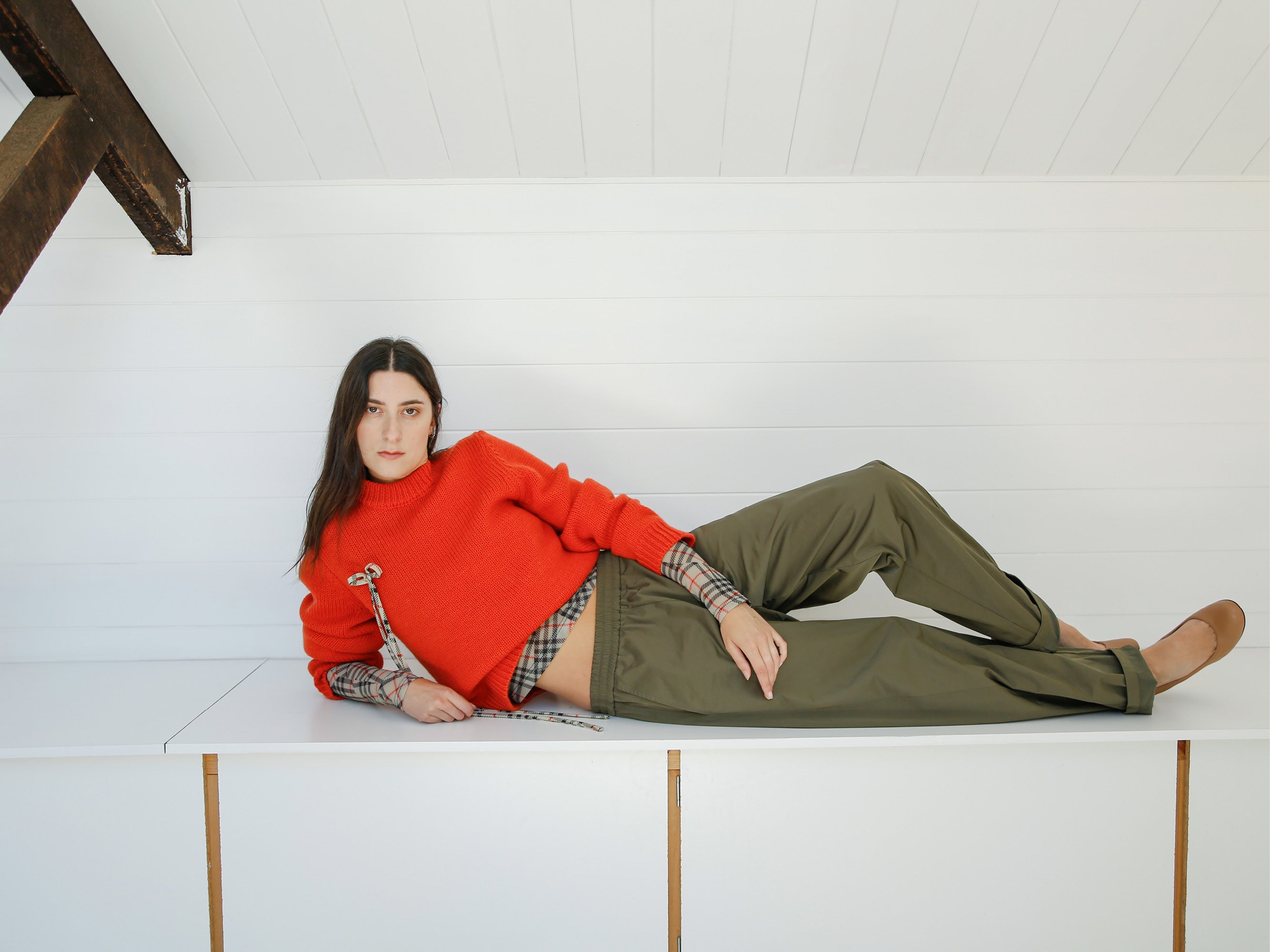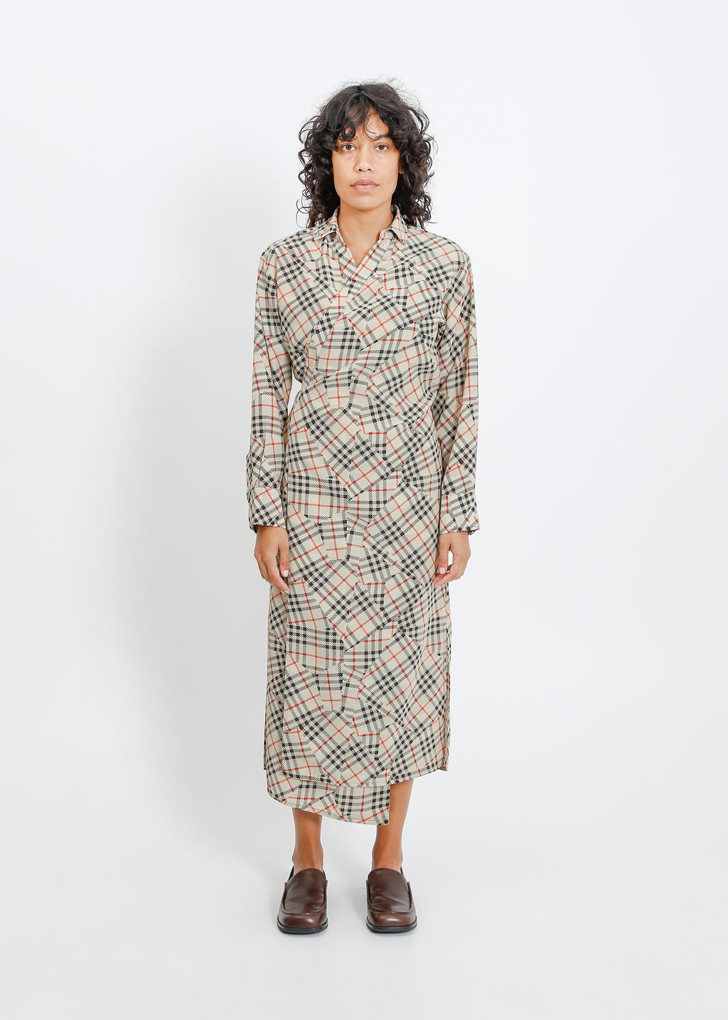 A grounded palette of moss, khaki and deep navy is warmed by fiery accents, creating a collection that feels both utilitarian and quietly striking. Deconstructed checks appear throughout, broken apart and reassembled across silhouettes so the pattern feels familiar yet subtly undone. The result is a wardrobe that balances structure with ease, where earthy tones and vivid touches of red sit together in pieces that feel considered, modern and slightly off-beat.