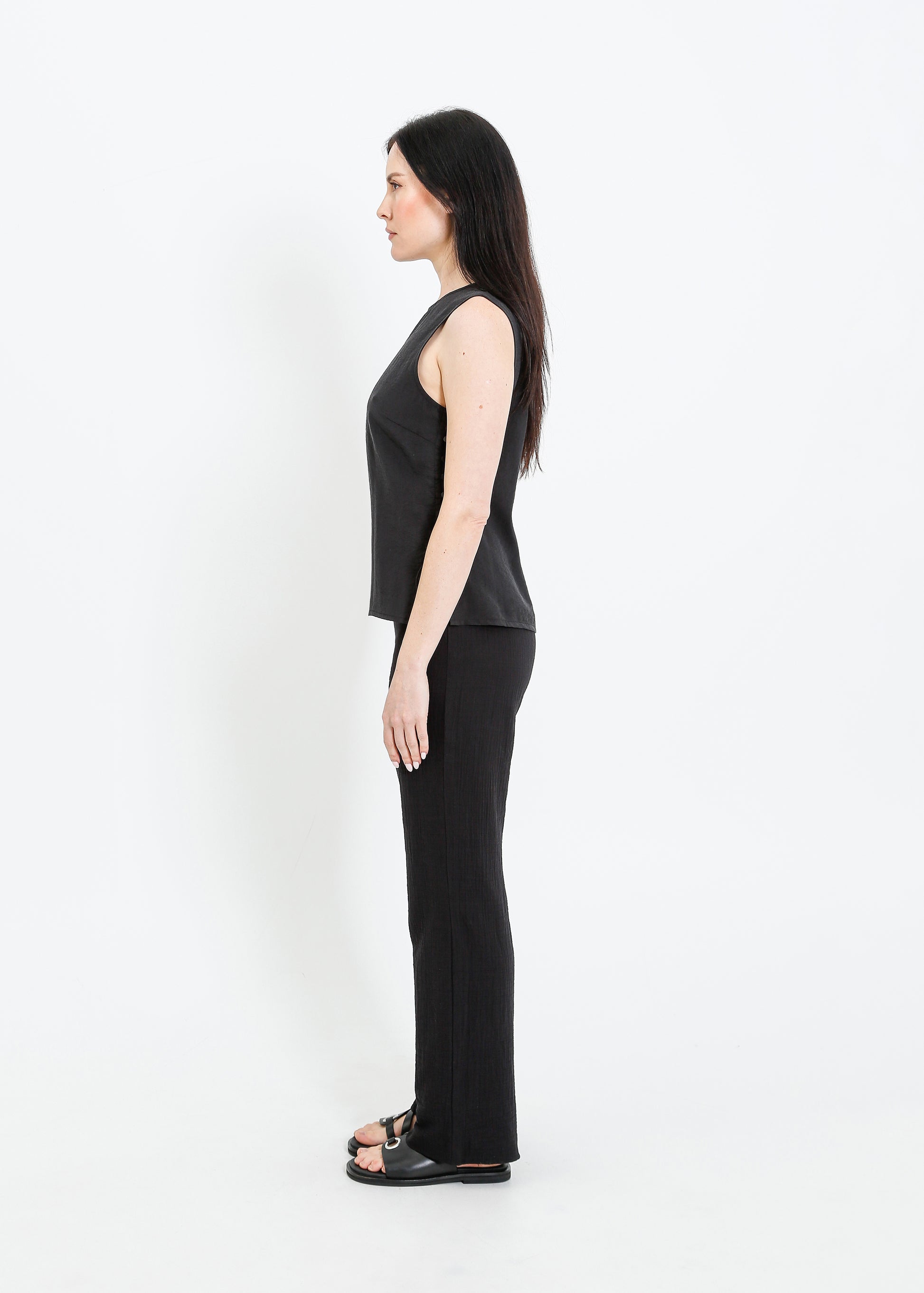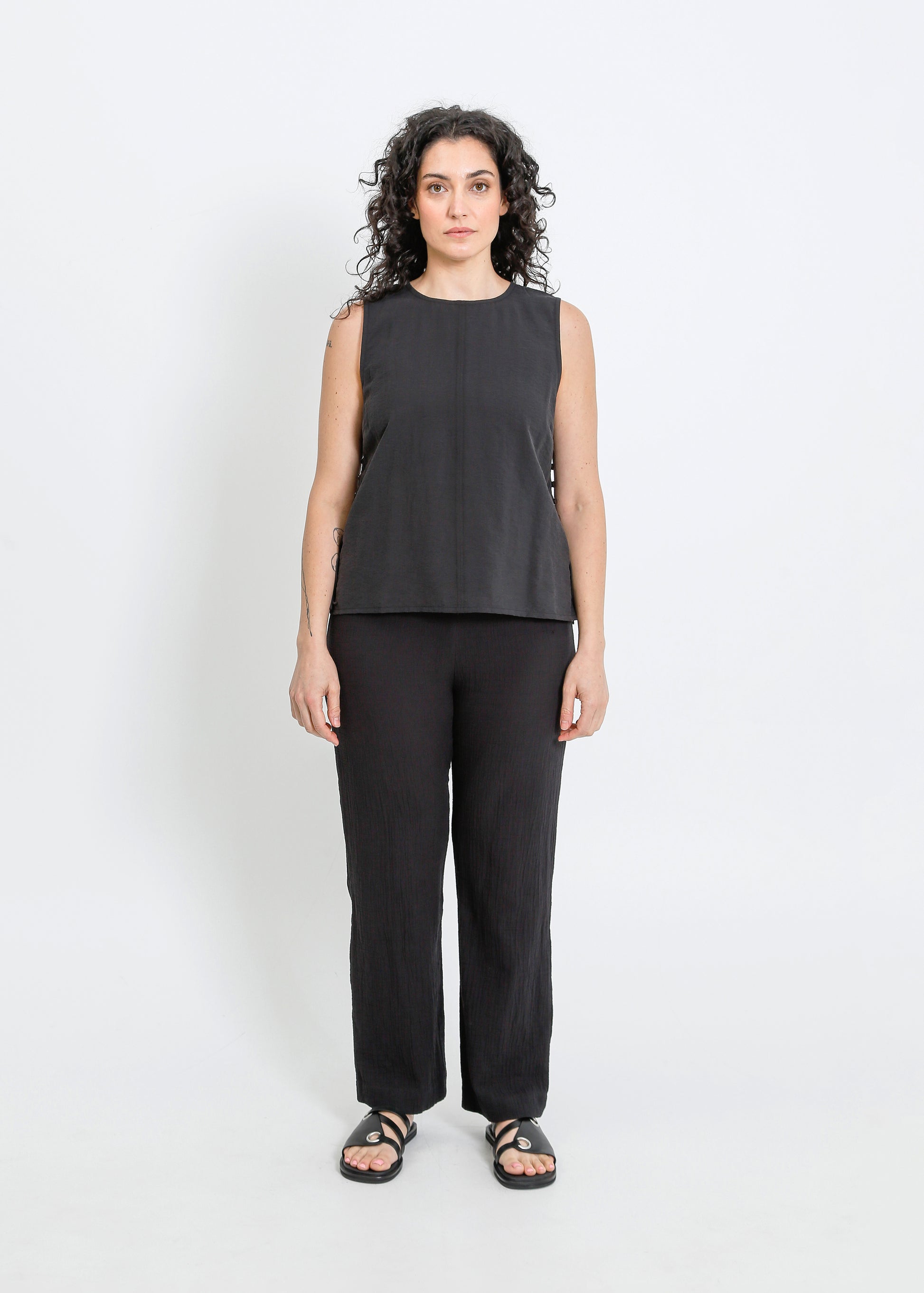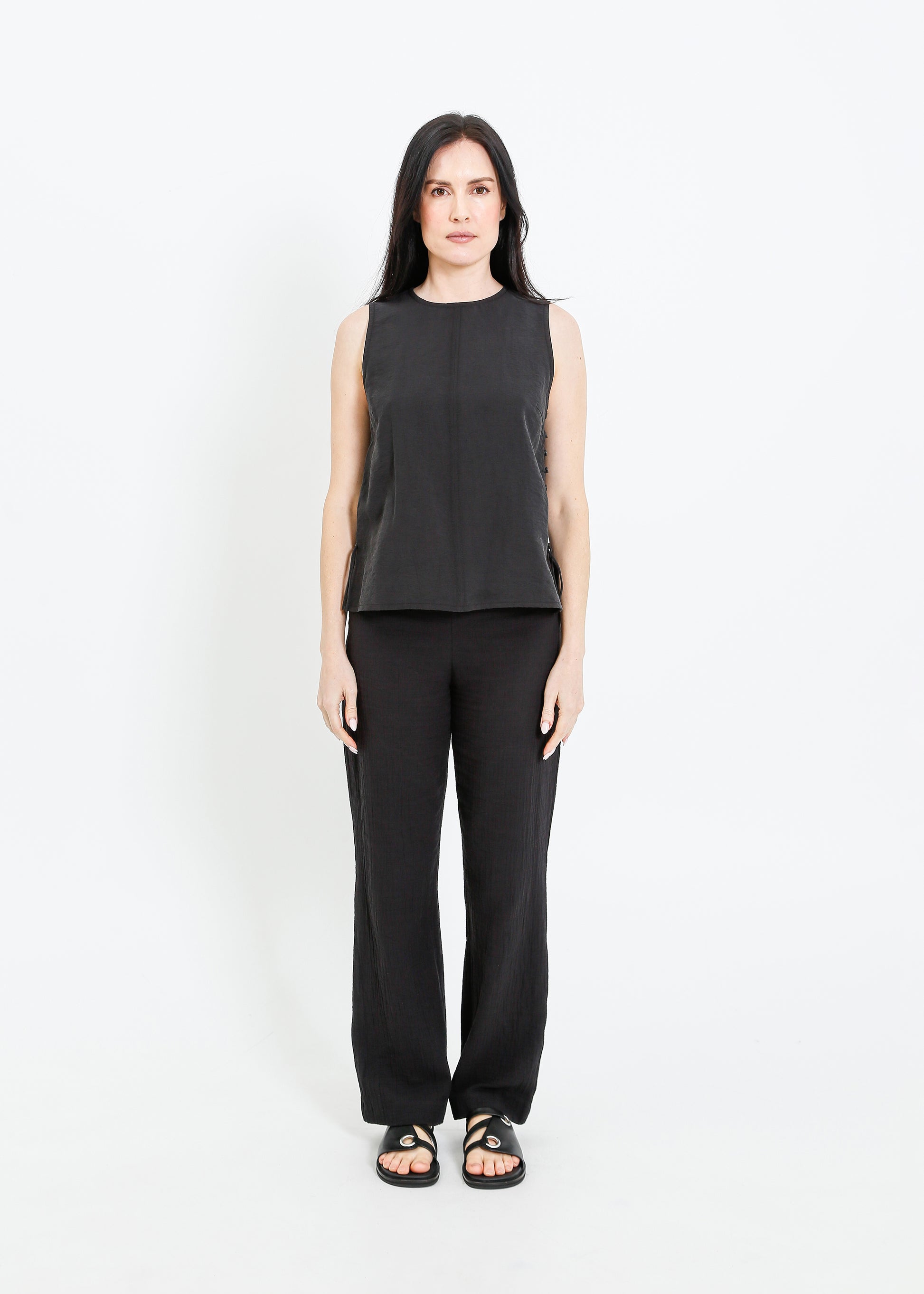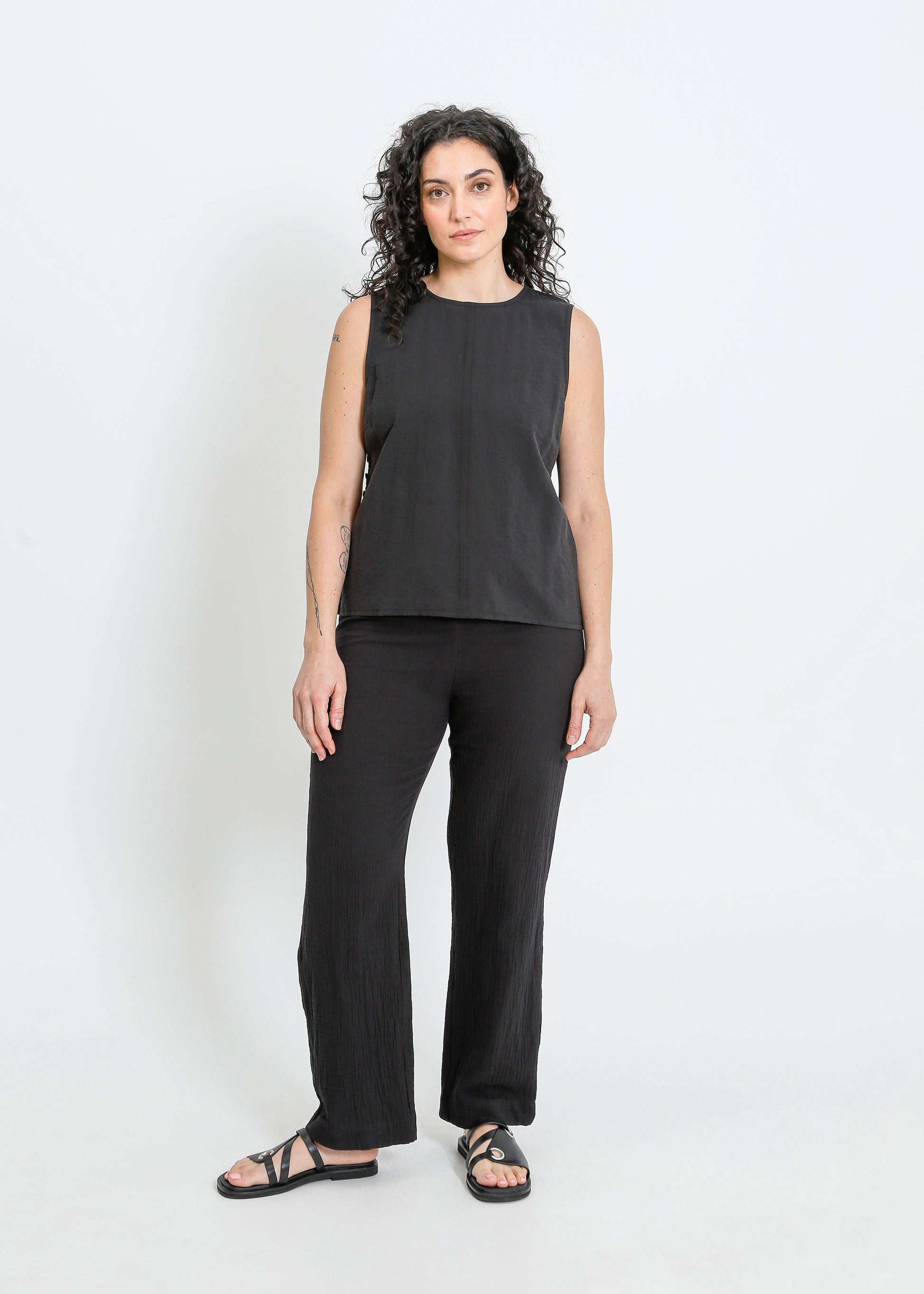 The ALPHA60 Alessi Top is a modern sleeveless crew neck style crafted for effortless sophistication. Designed with subtle detailing and a sleek silhouette, this top is perfect for elevating your everyday wardrobe or layering for a refined look.