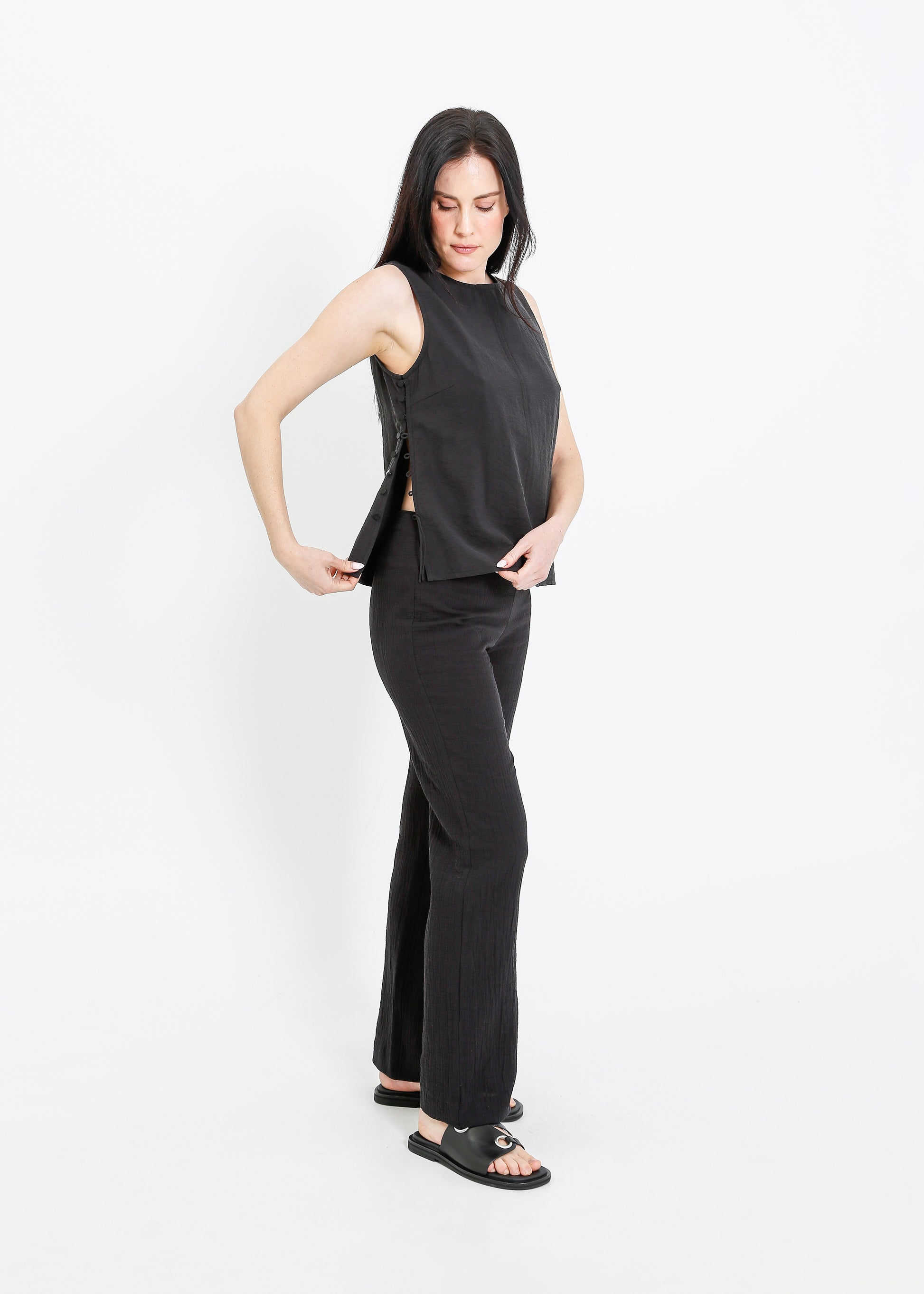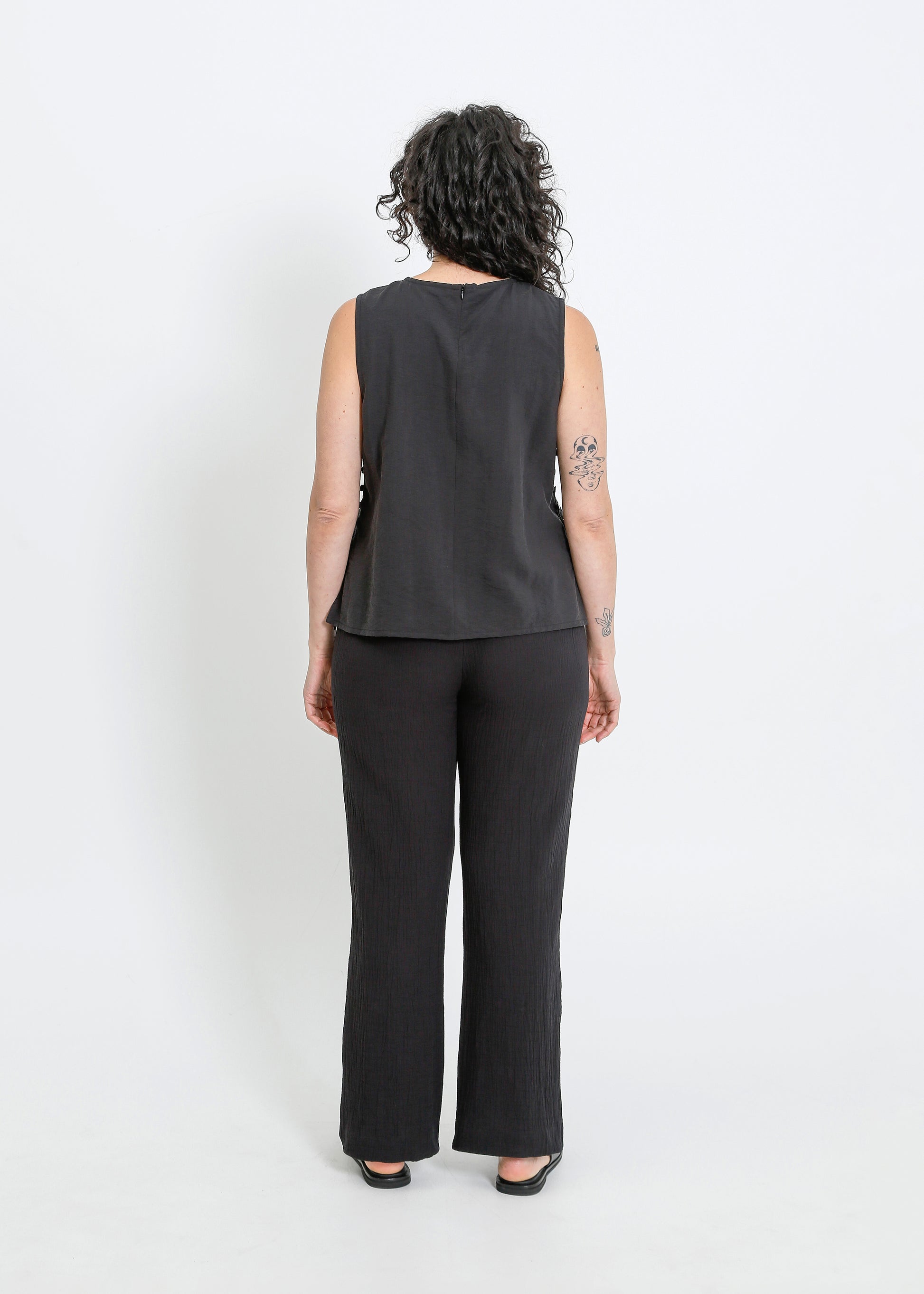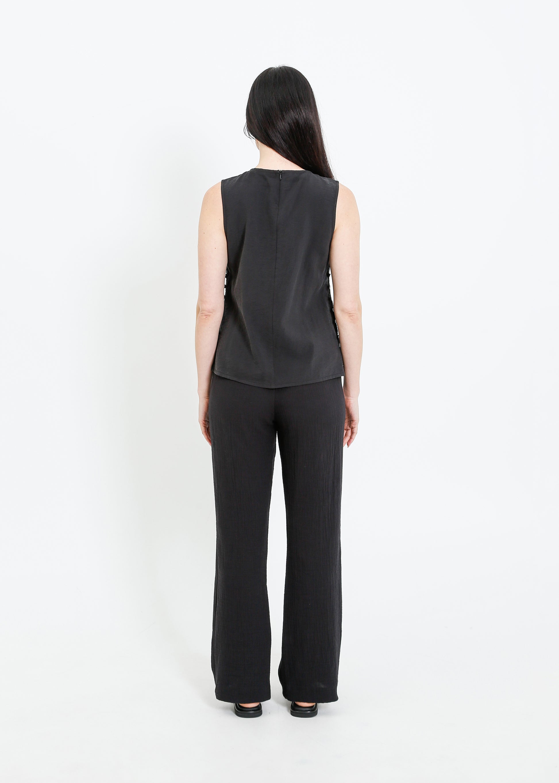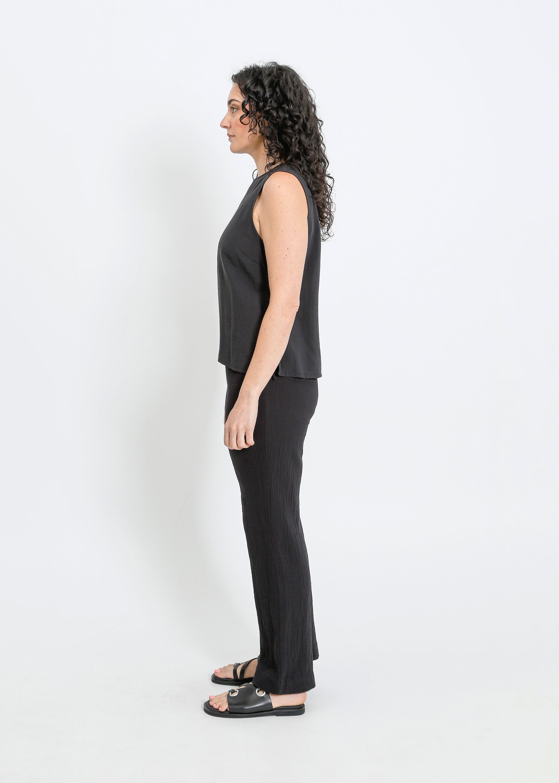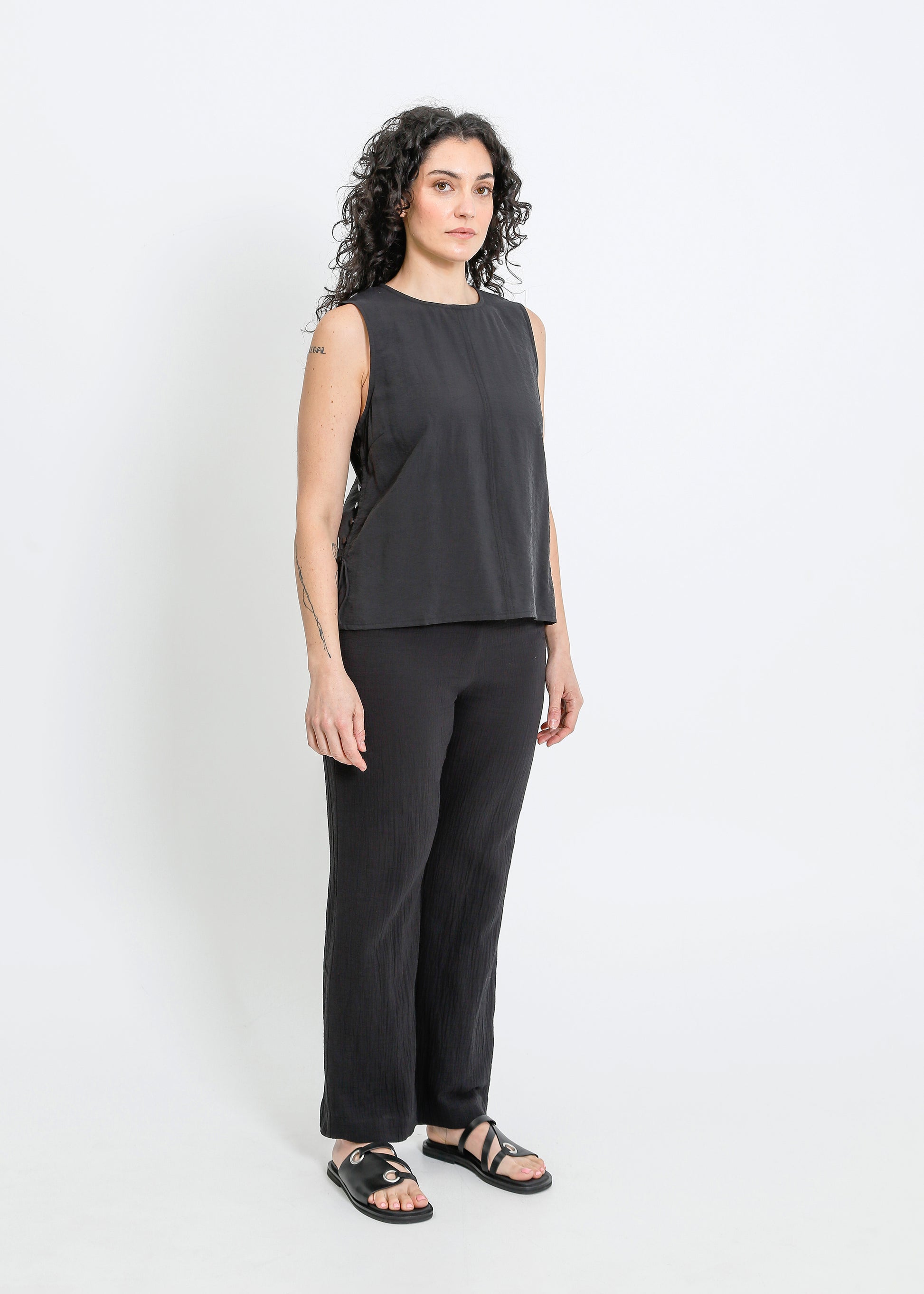 The ALPHA60 Alessi Top is a modern sleeveless crew neck style crafted for effortless sophistication. Designed with subtle detailing and a sleek silhouette, this top is perfect for elevating your everyday wardrobe or layering for a refined look.