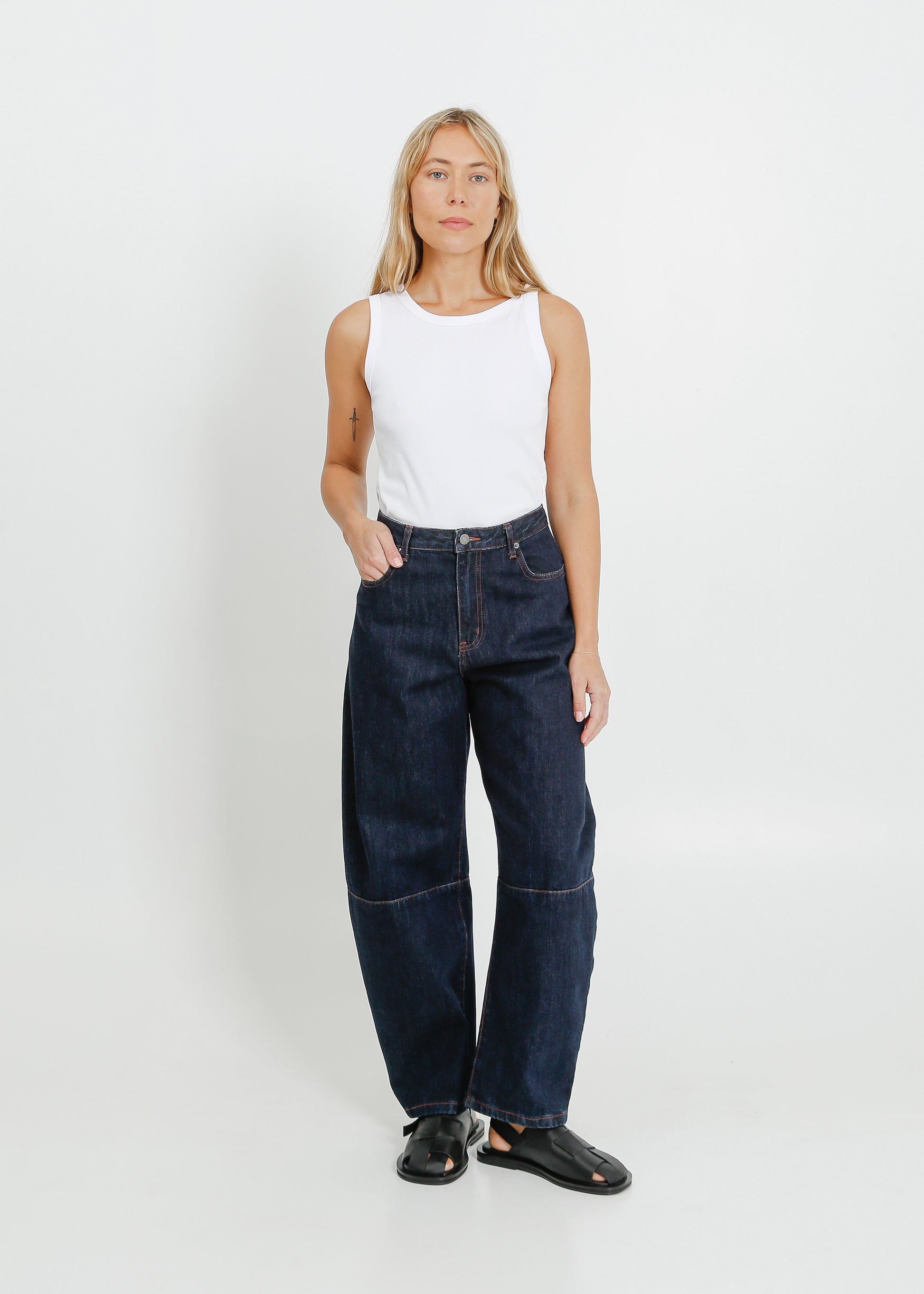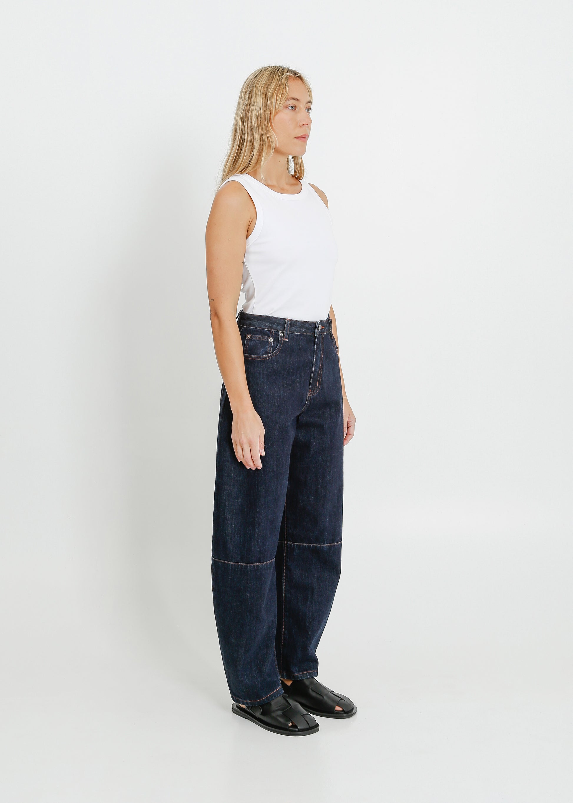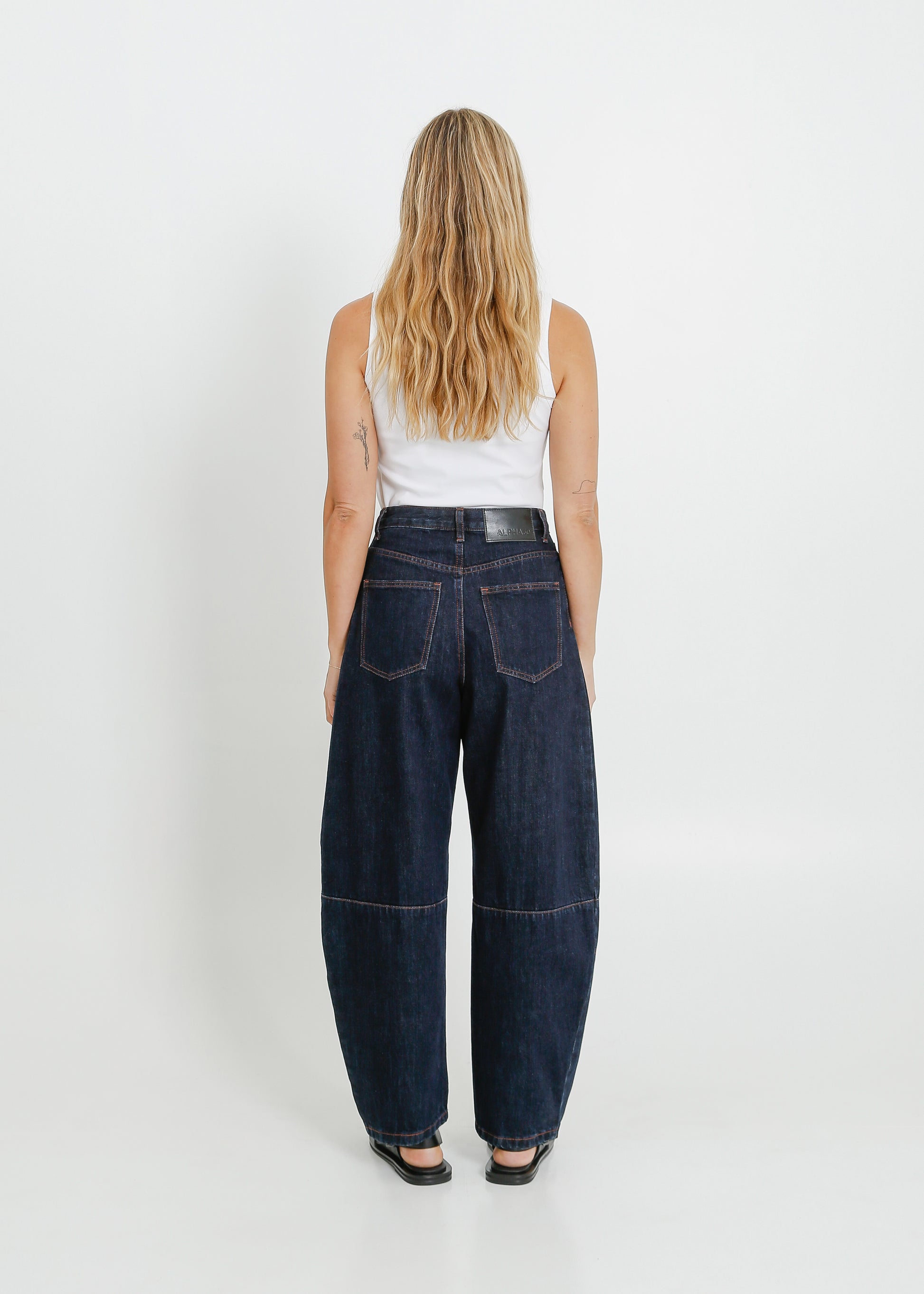The ALPHA60 Dalton Jeans are a cool high-waisted style that have a cocoon leg profile which is accentuated by long hem panels. Featuring traditional 5 pocket denim styling, fly-front, 5 belt loops and back yoke. Finished with dark silver Alpha60 hardware, contrast rust stitching and black Alpha60 leather patch at the back waist. Cut from a lightweight rigid denim and also comes in black. Seen here with or Forna Knit in Black.