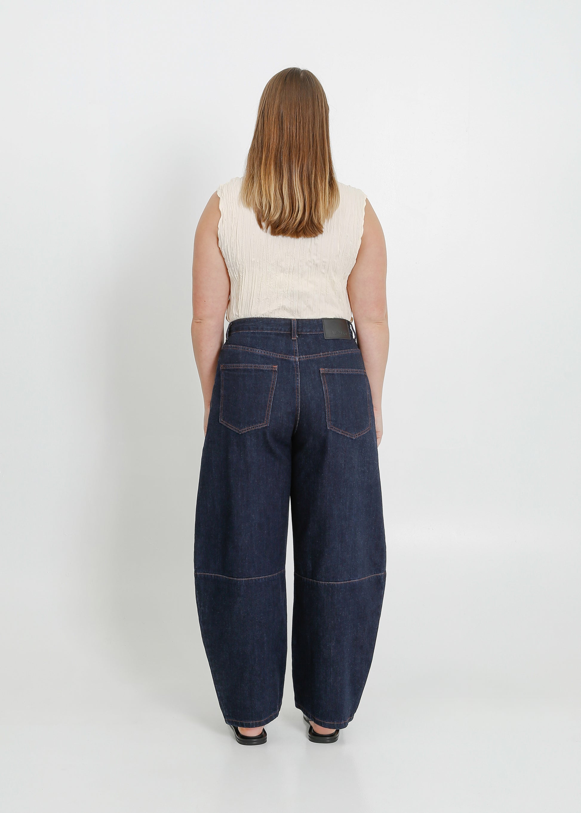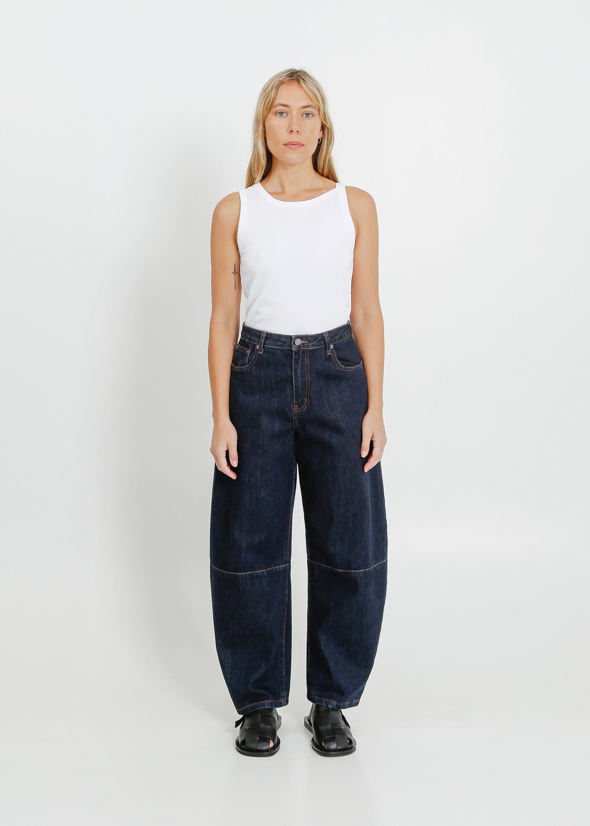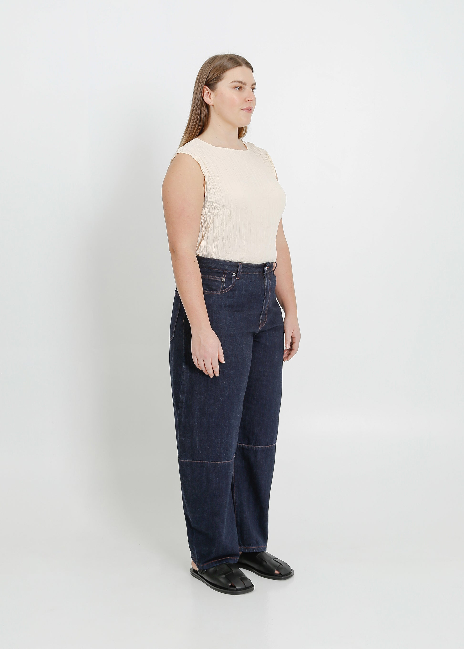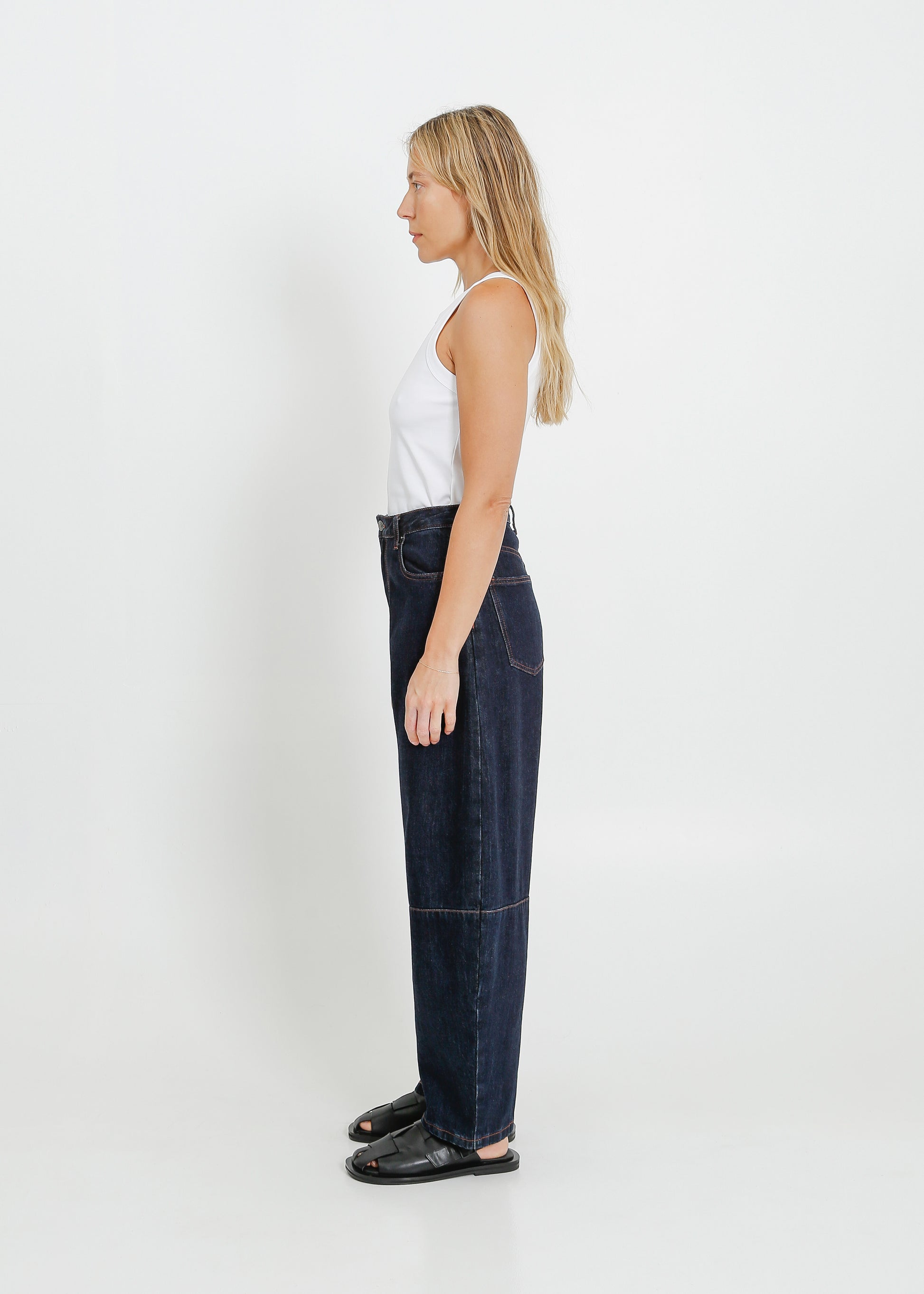 The ALPHA60 Dalton Jeans are a cool high-waisted style that have a cocoon leg profile which is accentuated by long hem panels. Featuring traditional 5 pocket denim styling, fly-front, 5 belt loops and back yoke. Finished with dark silver Alpha60 hardware, contrast rust stitching and black Alpha60 leather patch at the back waist. Cut from a lightweight rigid denim and also comes in black. Seen here with or Forna Knit in Black.