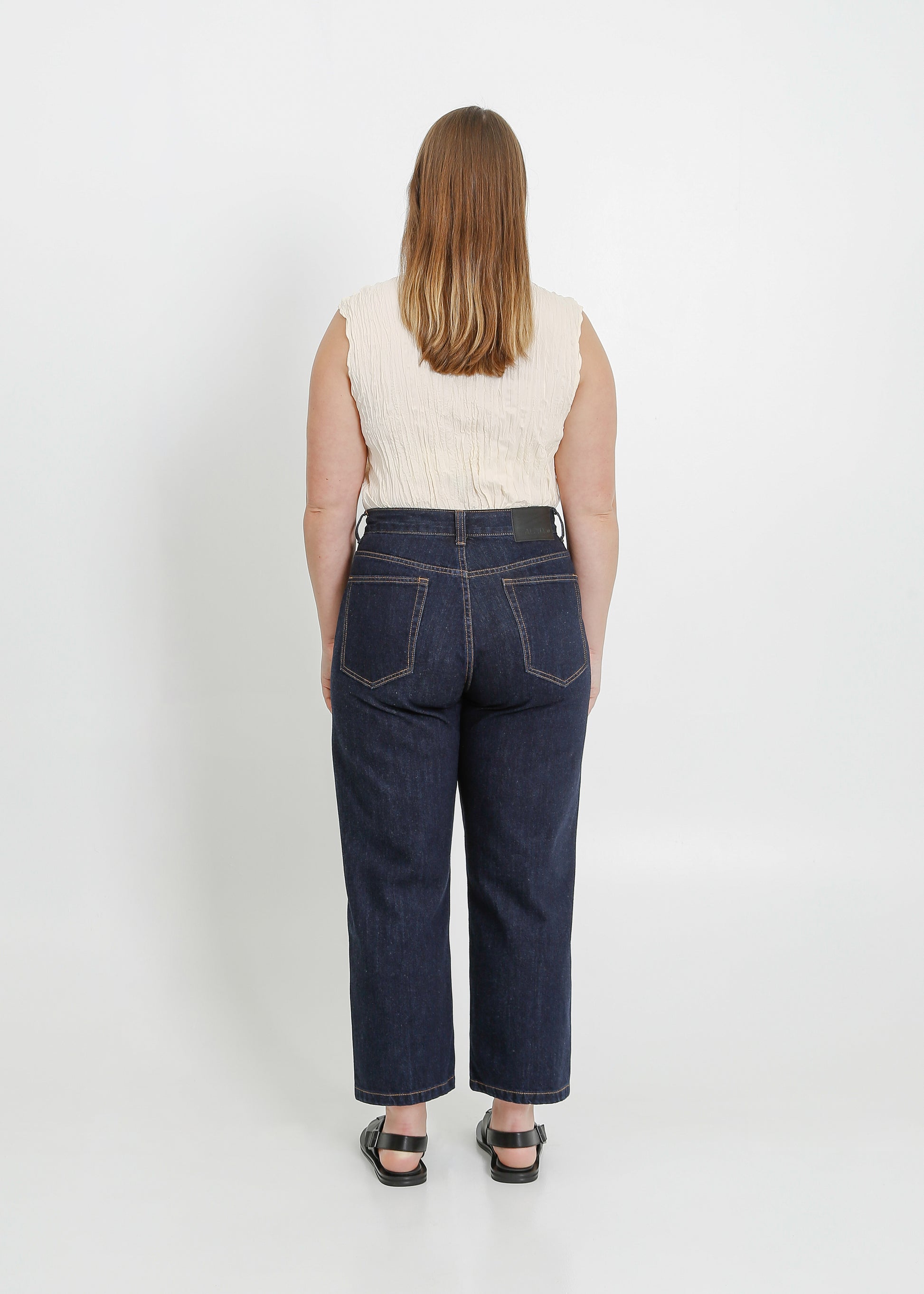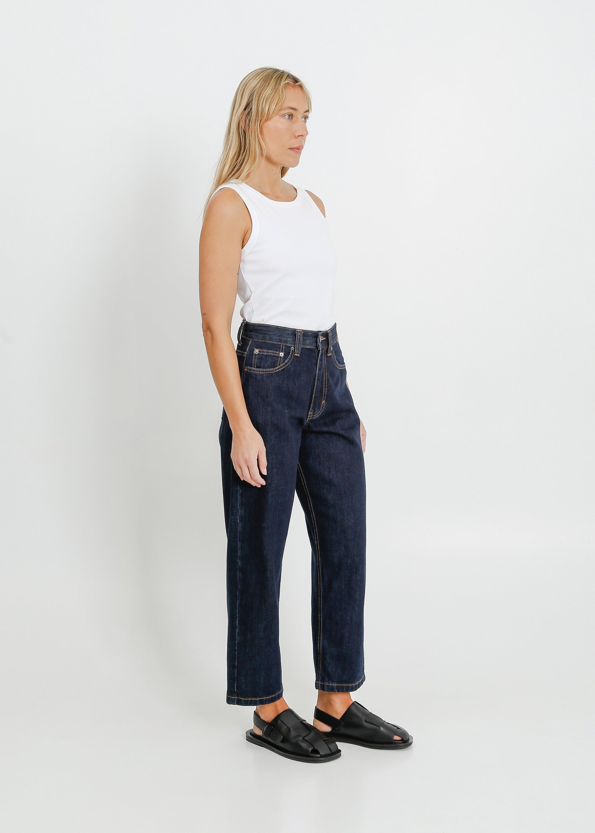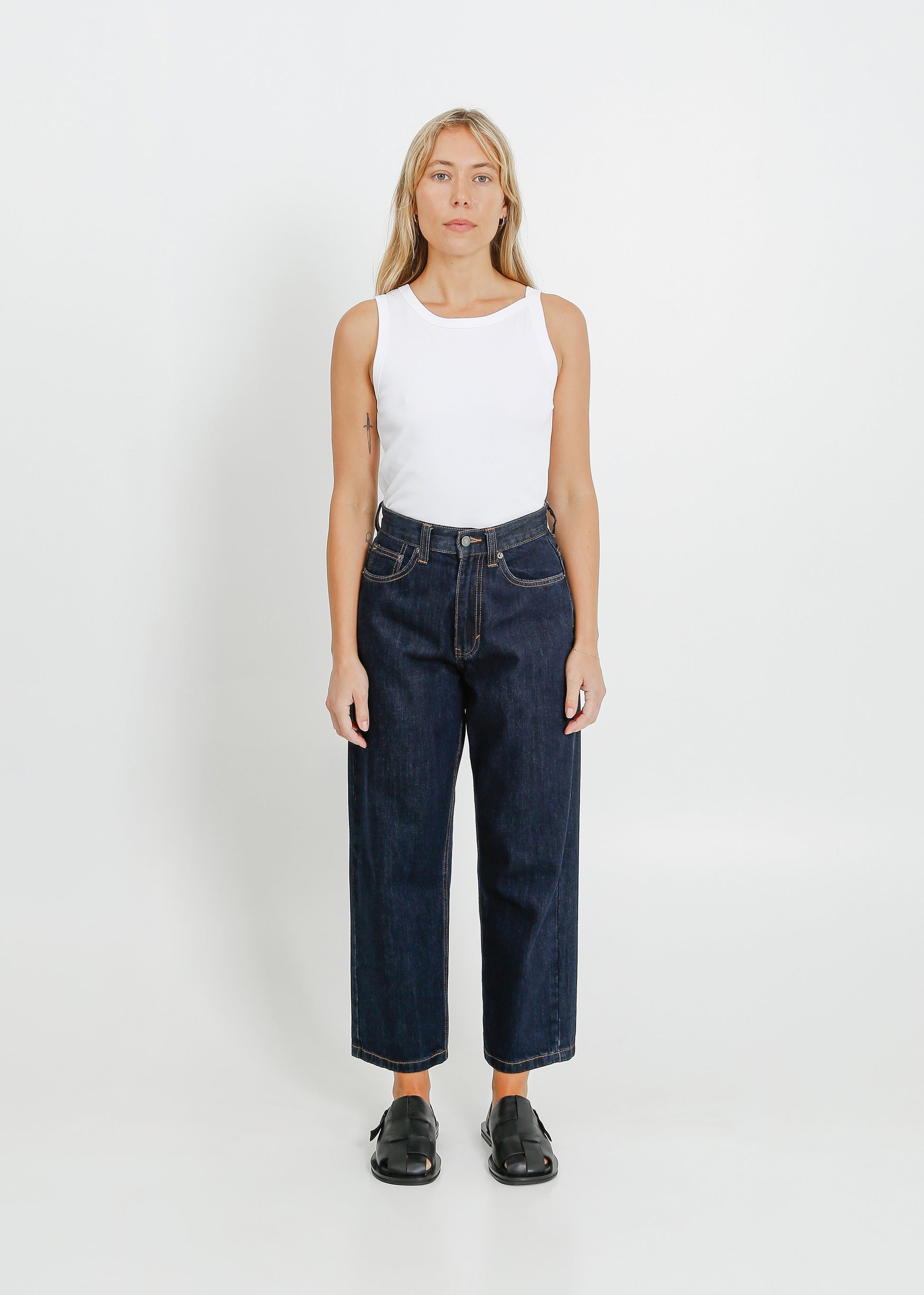 The ALPHA60 Goldie Jeans are cut from a classic washed rigid denim. The high waisted cut has a relaxed, straight leg and a cropped length. With the classic five pocket feature, they are finished with dark silver hardware.