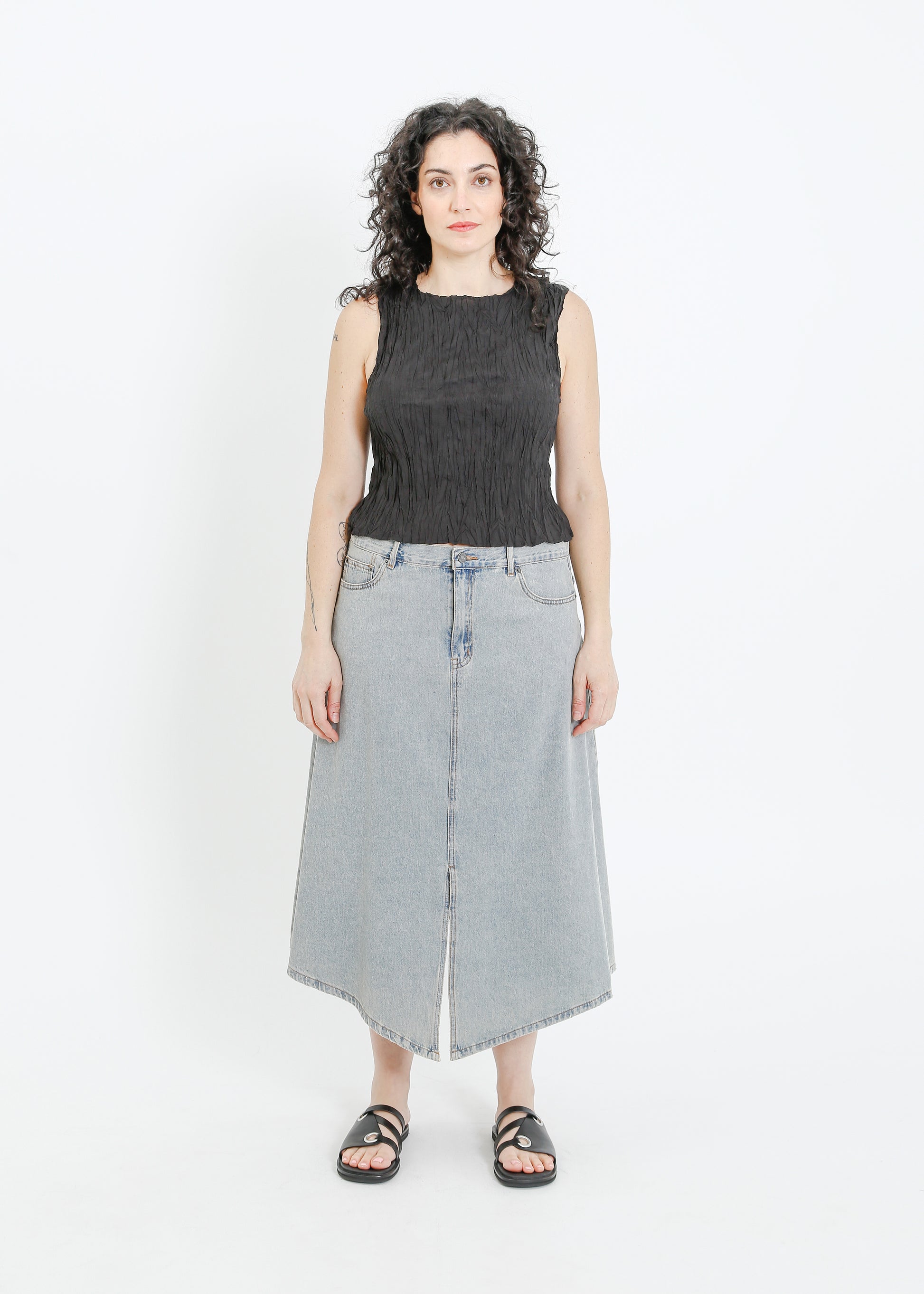 The ALPHA60 Hugh Denim Skirt is a modern take on the classic denim staple, featuring a flattering flared silhouette and a fresh indigo beige wash. Designed with a classic 5-pocket construction, this midi-length skirt is crafted from a heavily washed rigid denim. The centre front split and flared skirt add movement and style, making it a versatile piece for any wardrobe.