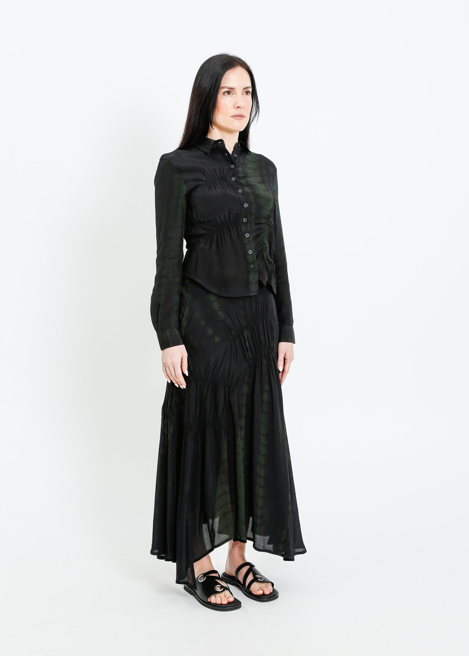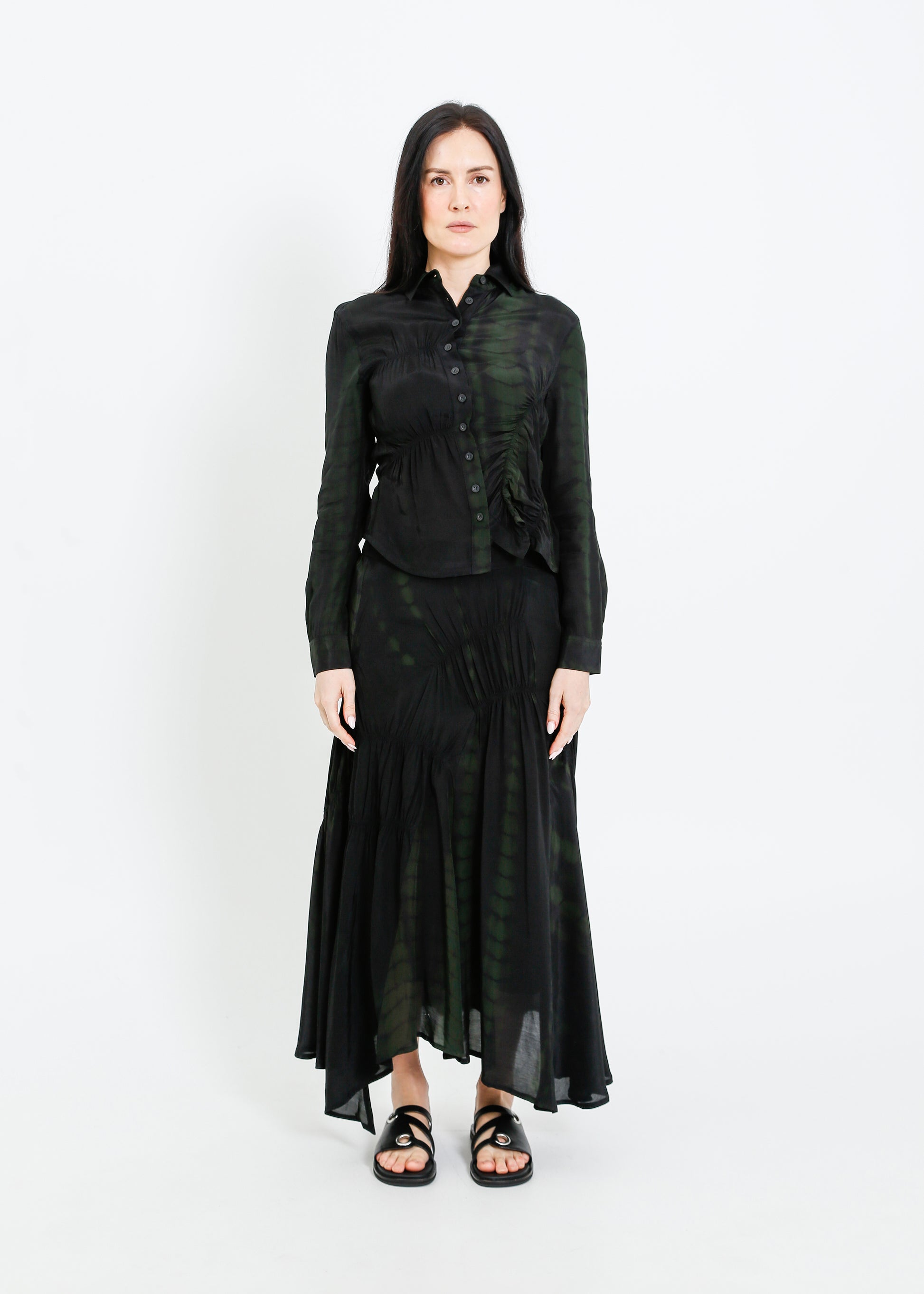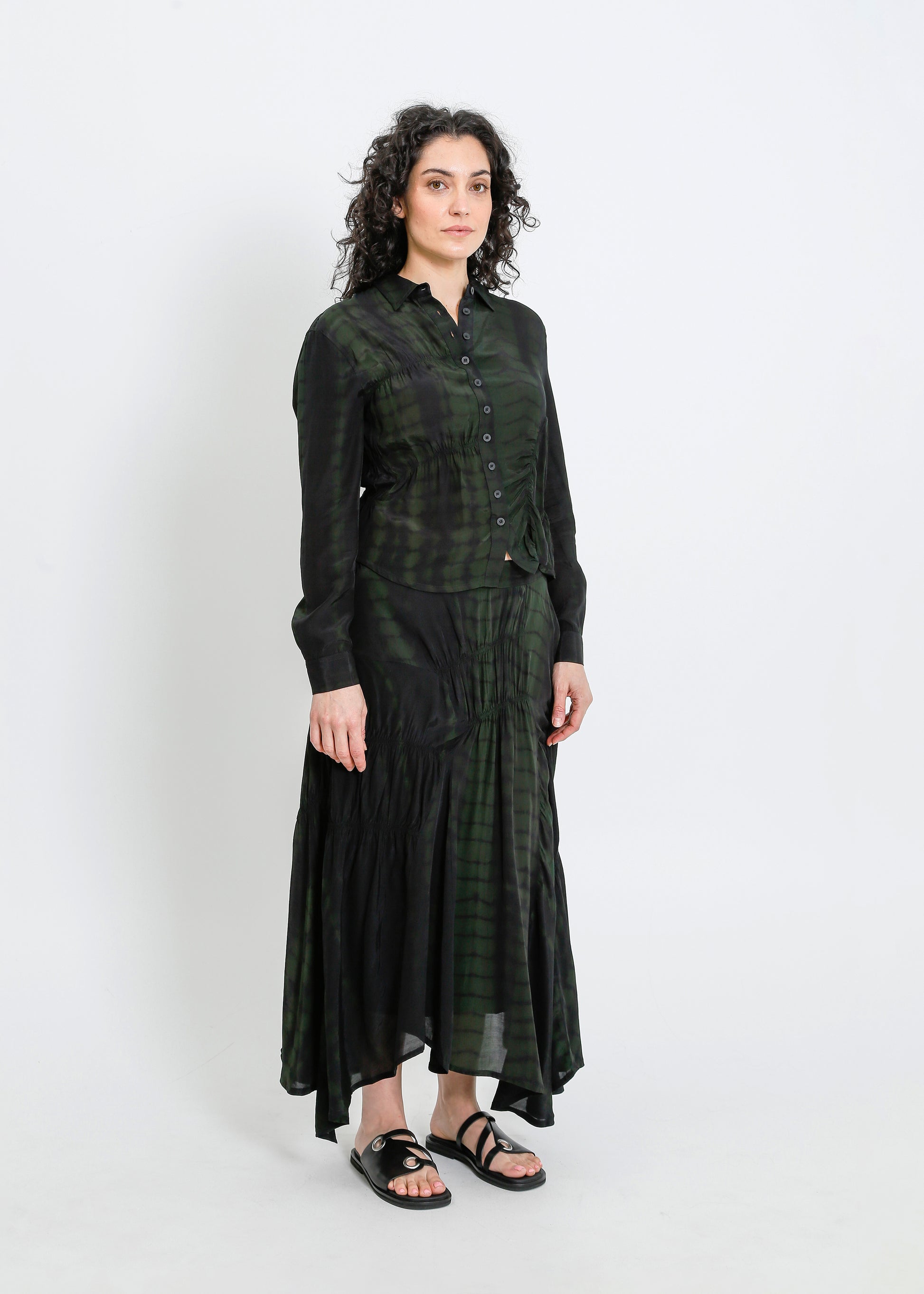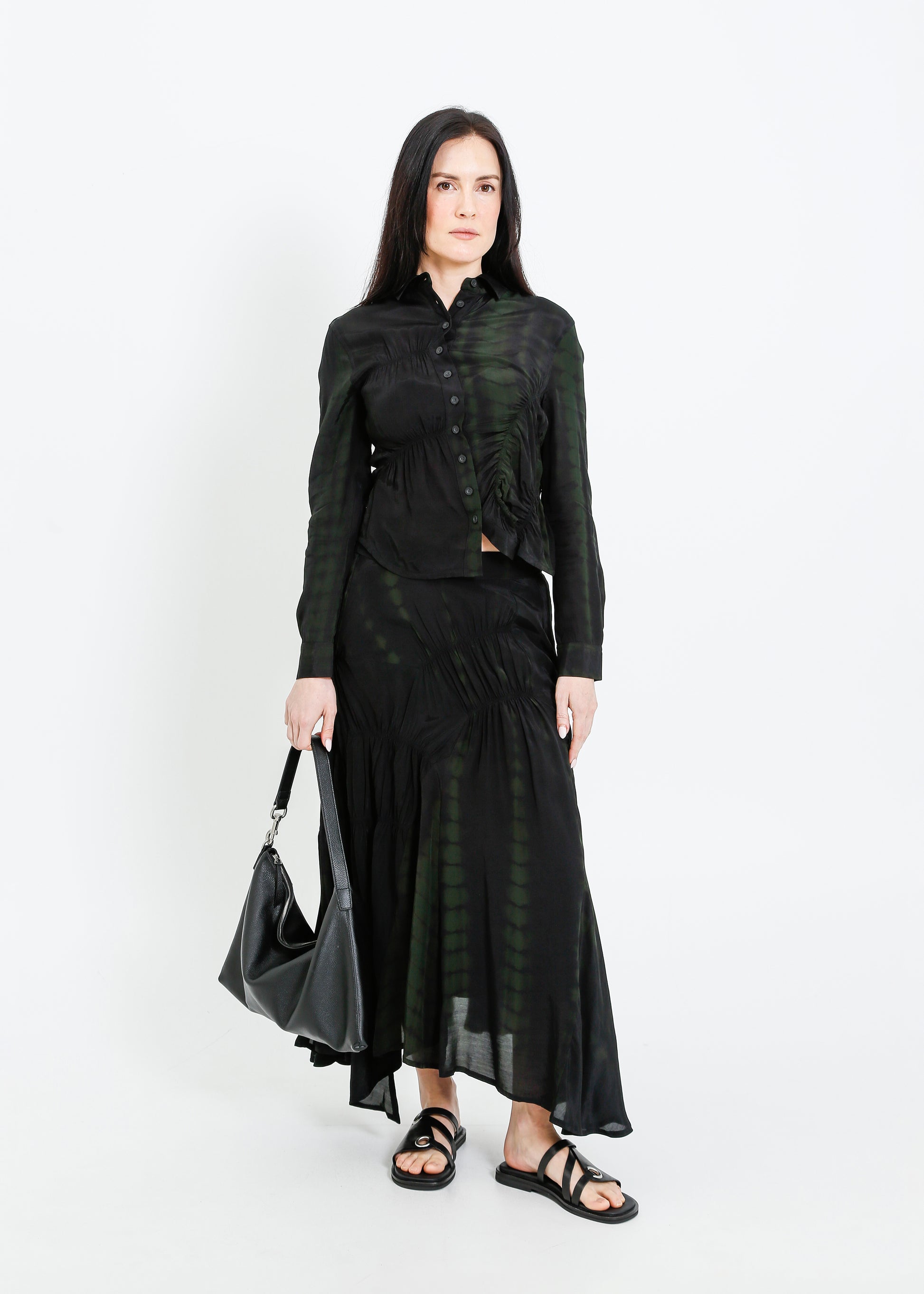 The ALPHA60 Raven Skirt is a modern take on the classic midi, featuring an elasticated waistband and asymmetric shirred panels for a unique silhouette. The skirt’s main fabric is slightly sh...