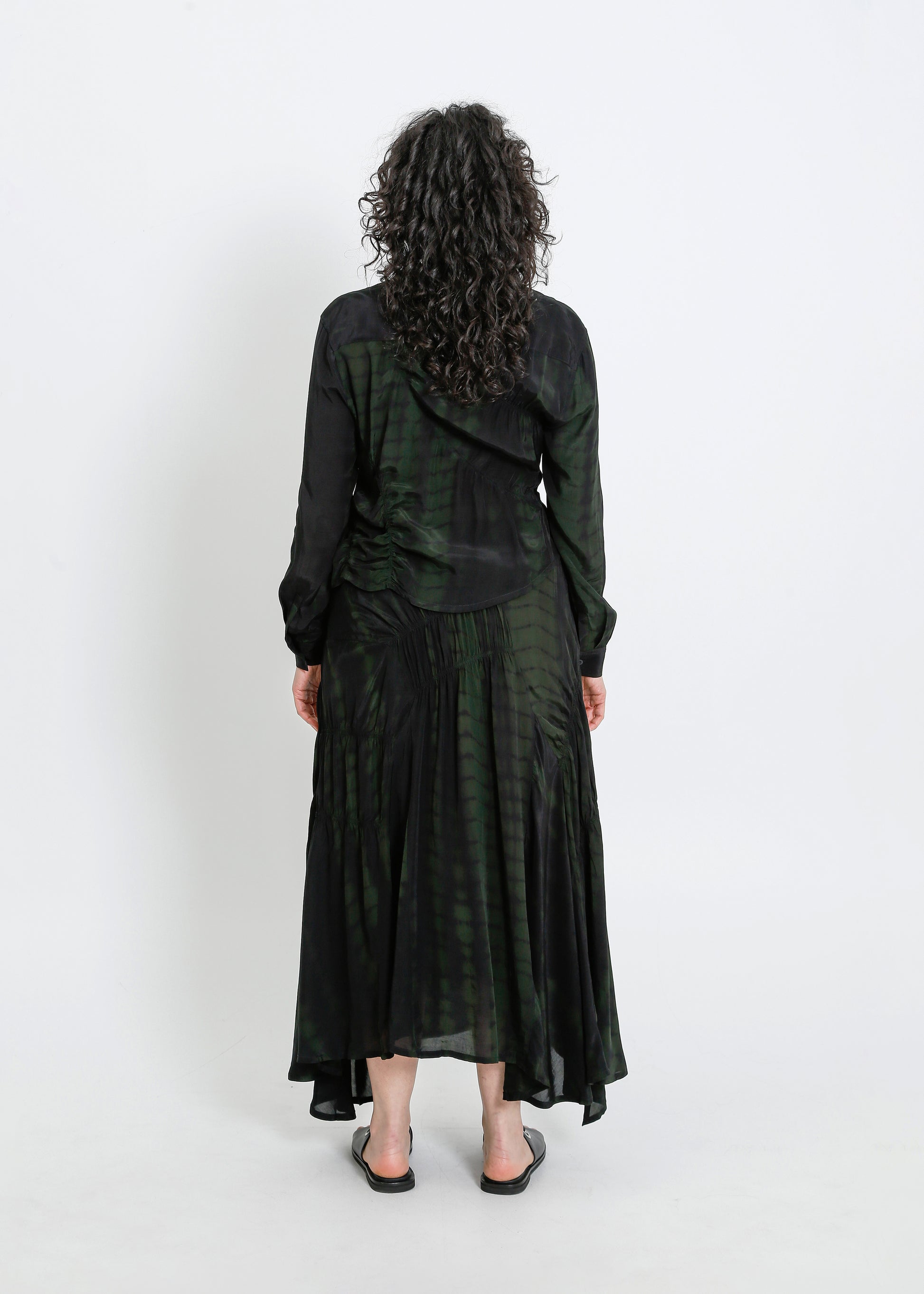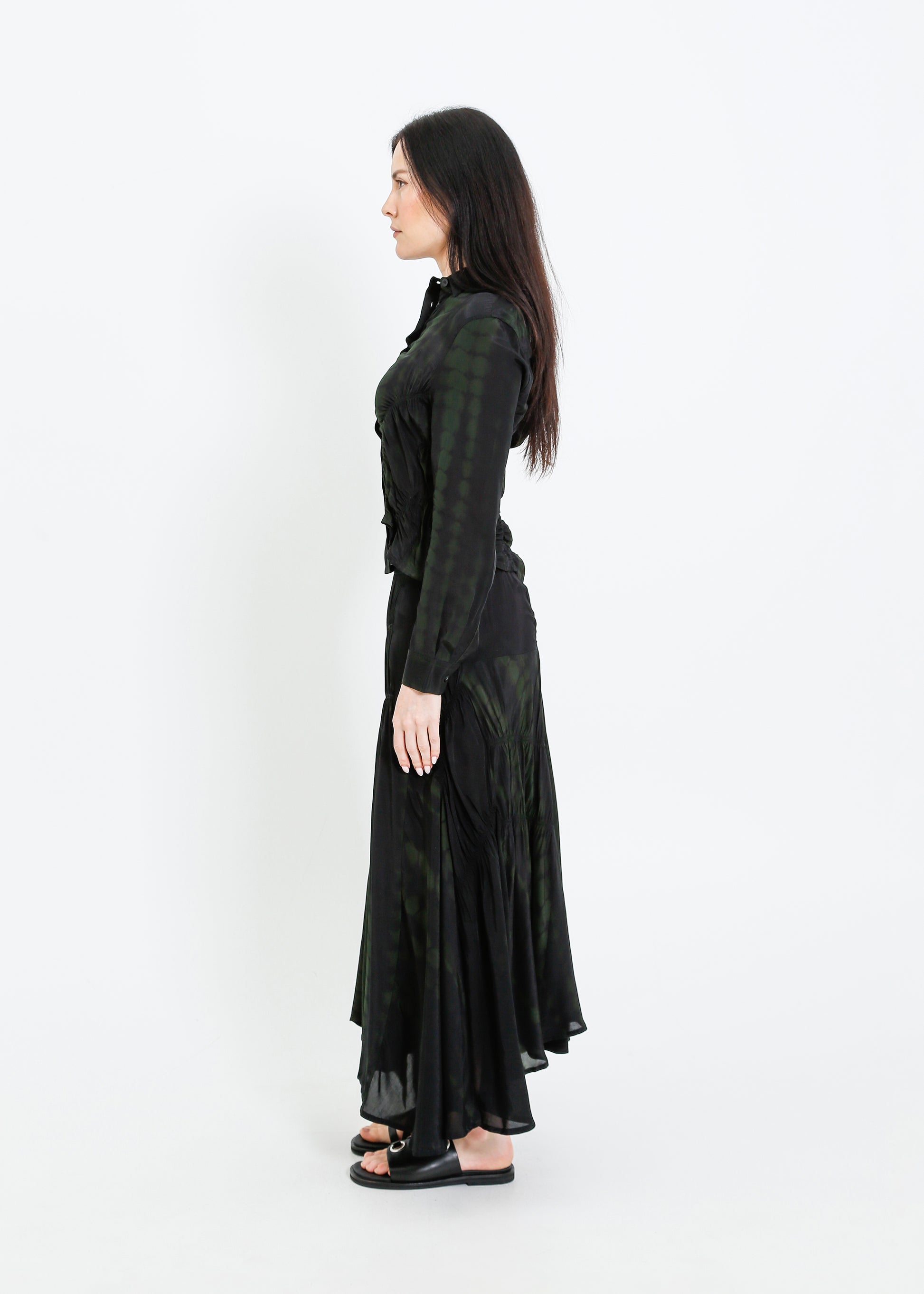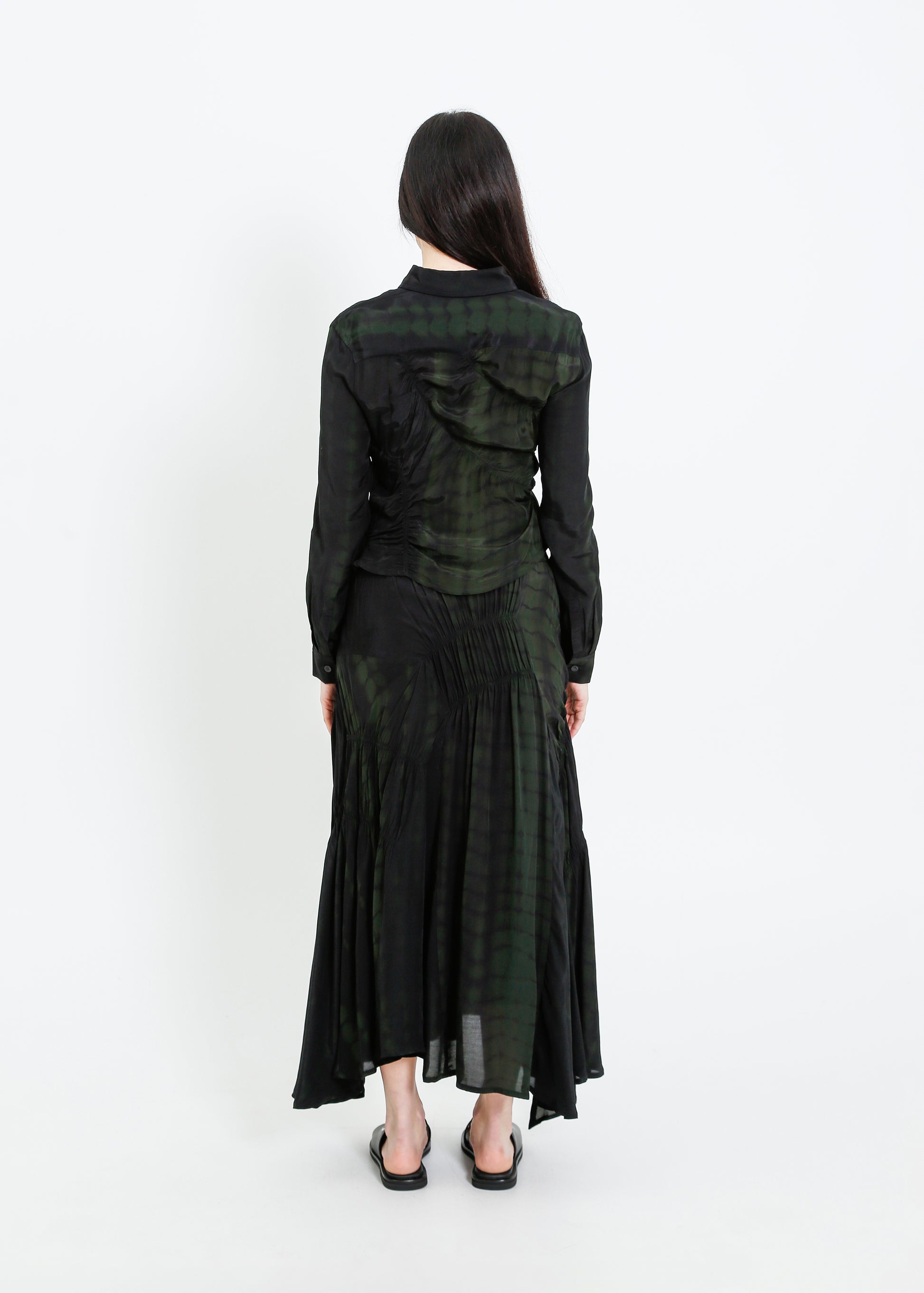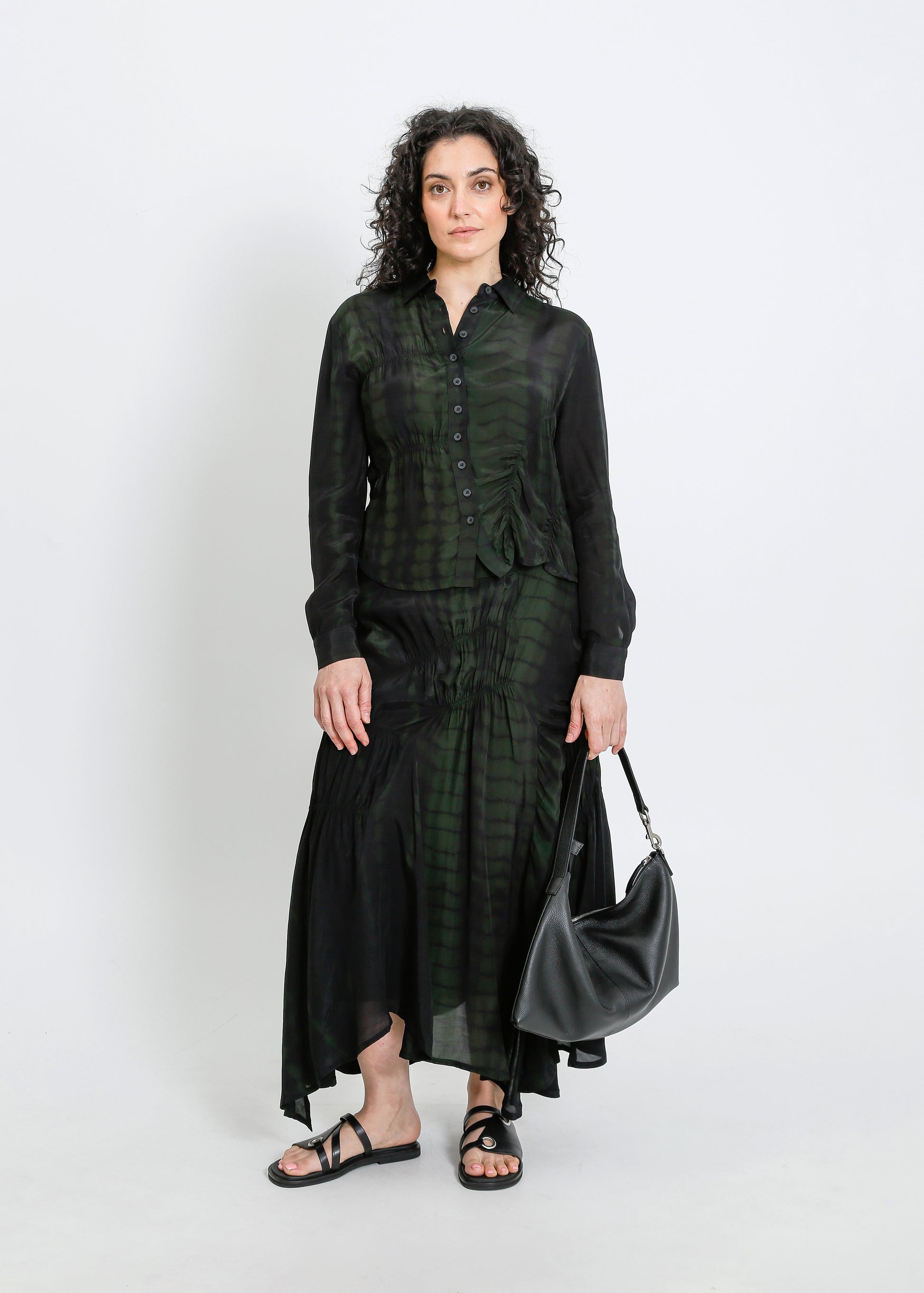The ALPHA60 Raven Skirt is a modern take on the classic midi, featuring an elasticated waistband and asymmetric shirred panels for a unique silhouette. The skirt’s main fabric is slightly sh...
