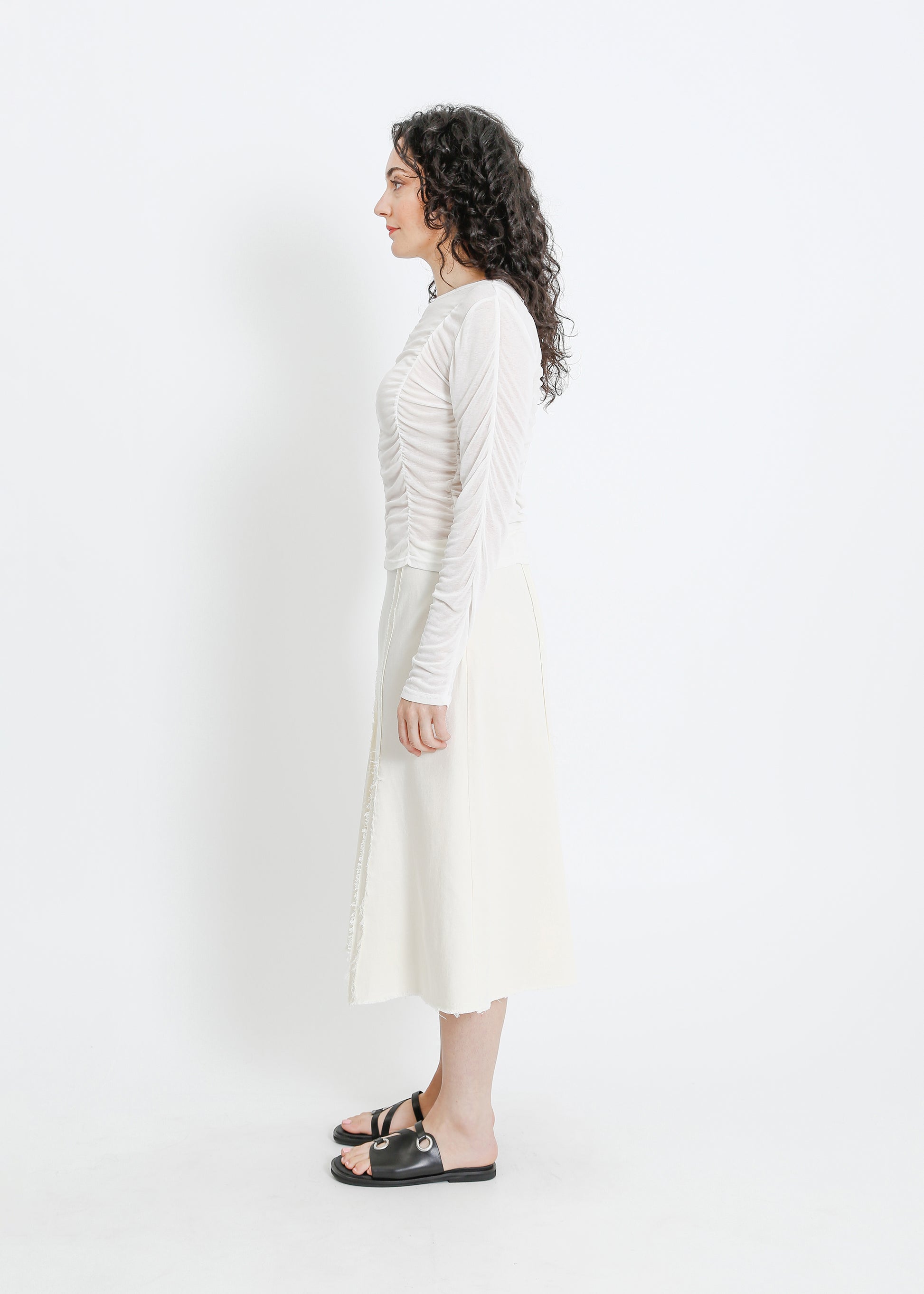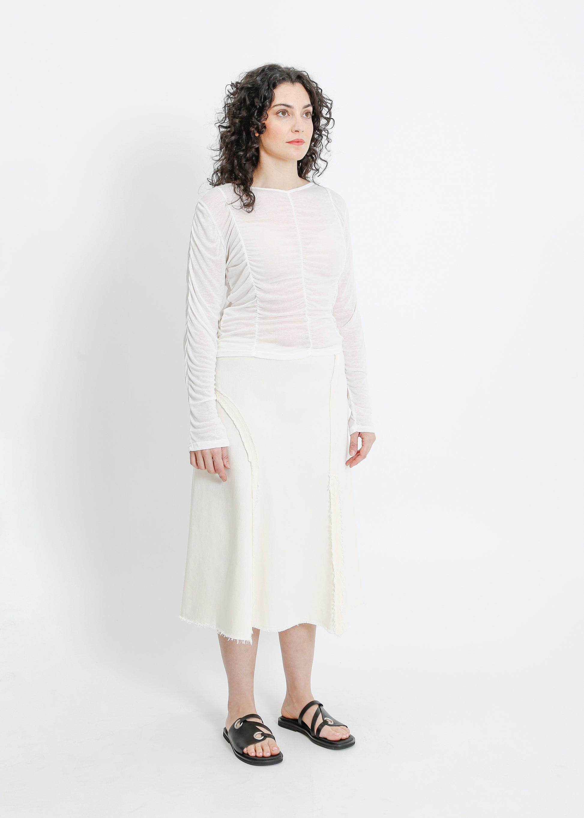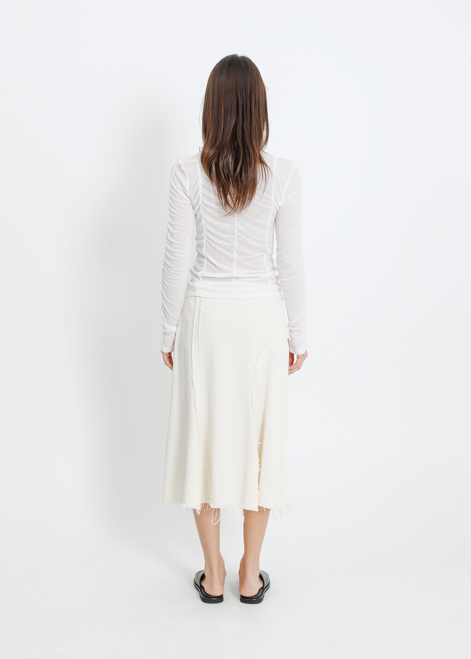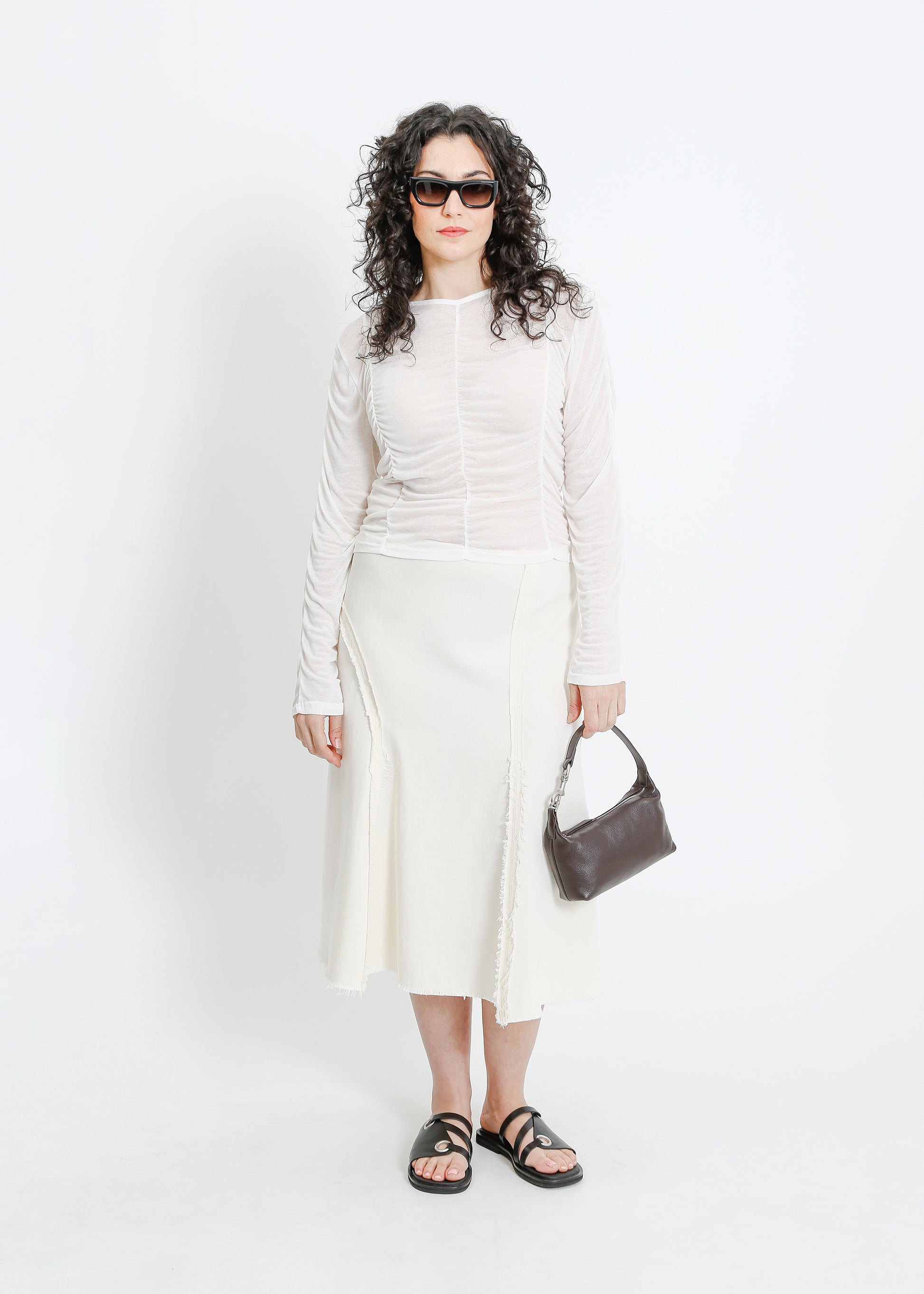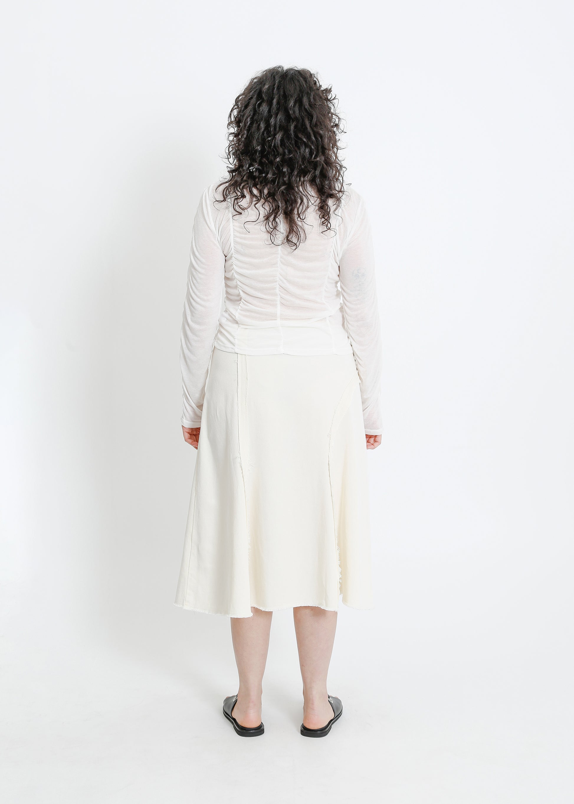 The ALPHA60 Stevie Skirt is a modern take on the classic A-line silhouette, crafted in a soft yet structured blend of Tencel and cotton. Featuring a midi length and mid rise, this skirt is designed with intentionally frayed seams that will continue to develop character with each wear. The invisible side zipper ensures a seamless fit, while the fabric’s gentle drape offers effortless movement and style. Perfect for elevating your everyday wardrobe with a touch of edge.
