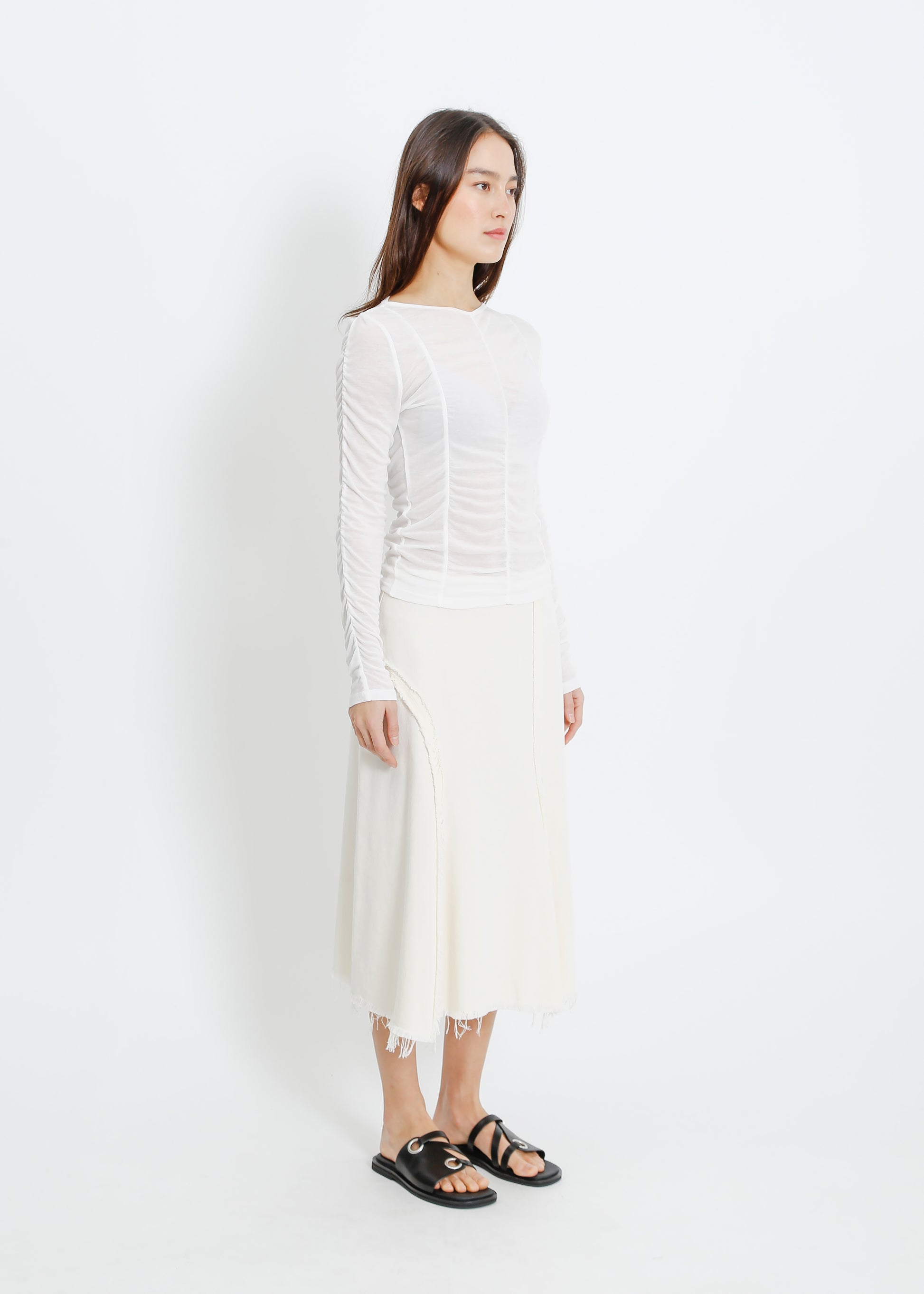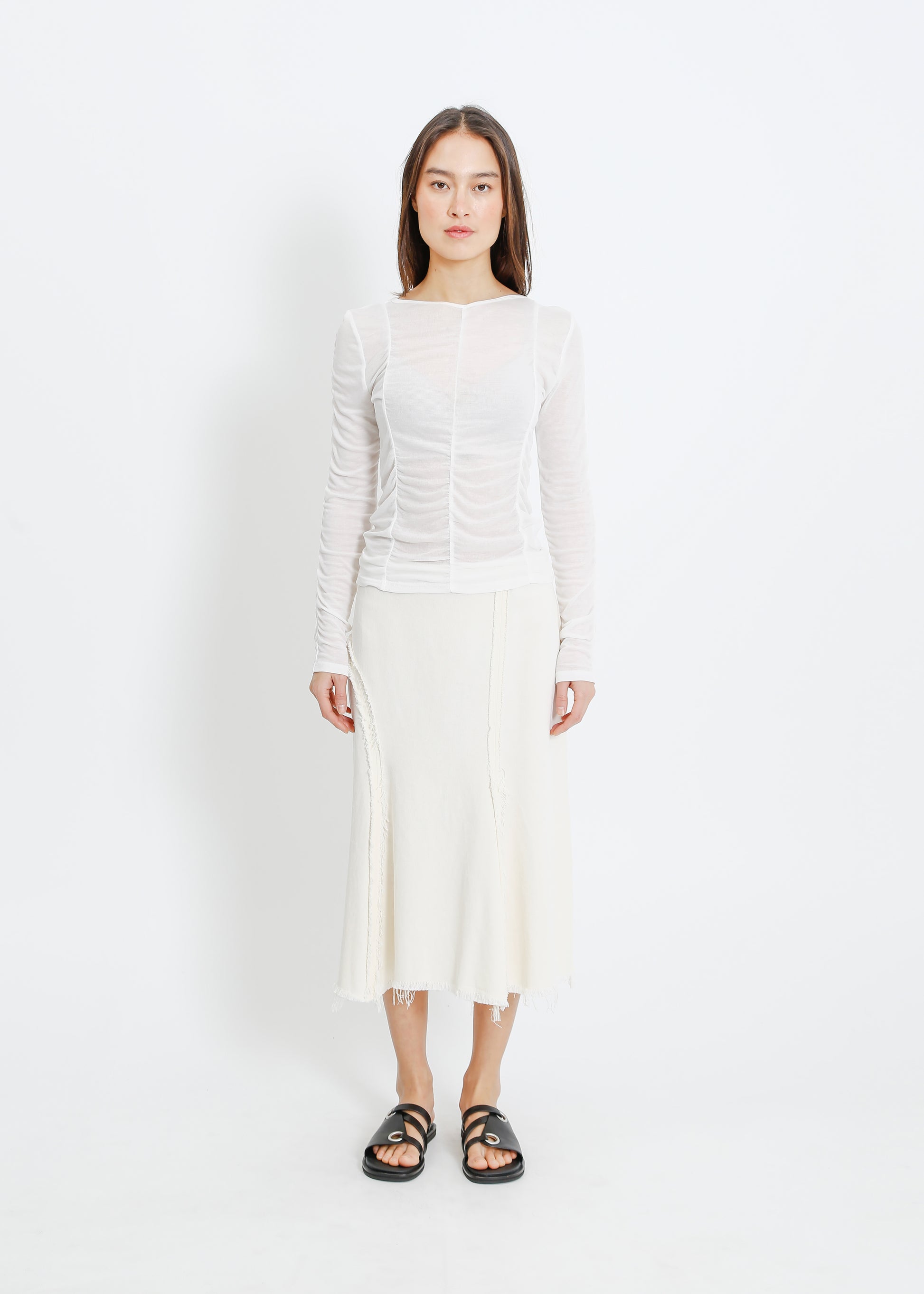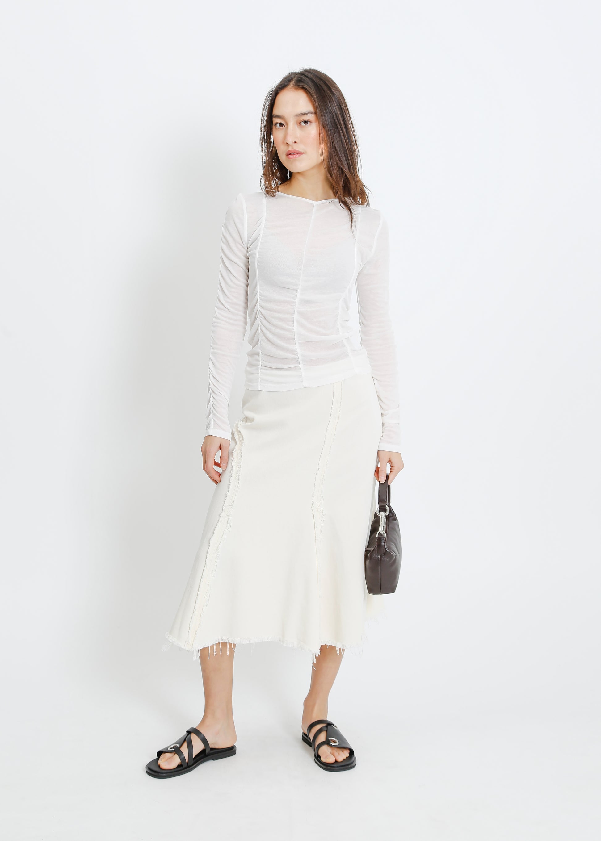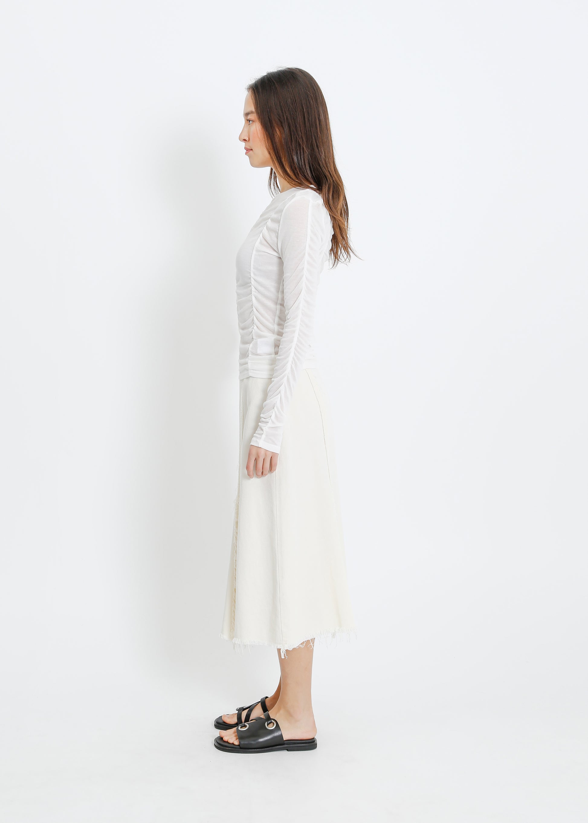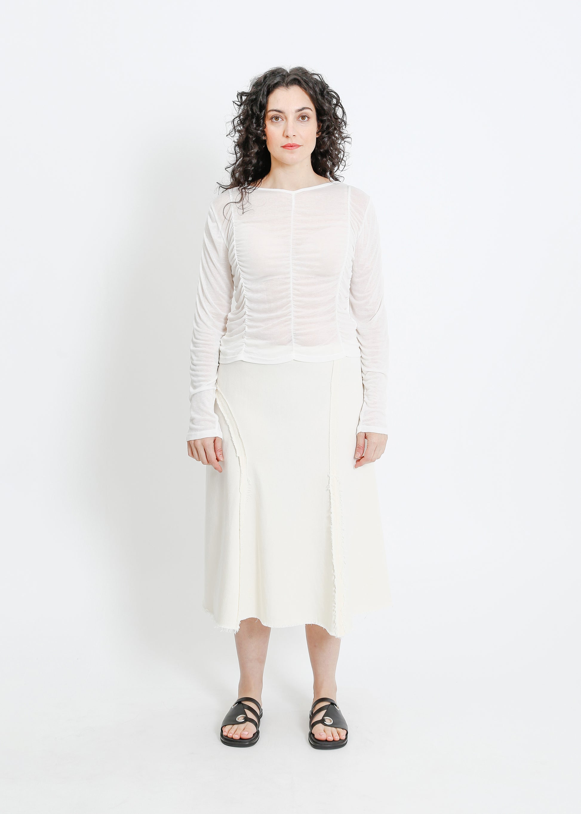 The ALPHA60 Stevie Skirt is a modern take on the classic A-line silhouette, crafted in a soft yet structured blend of Tencel and cotton. Featuring a midi length and mid rise, this skirt is designed with intentionally frayed seams that will continue to develop character with each wear. The invisible side zipper ensures a seamless fit, while the fabric’s gentle drape offers effortless movement and style. Perfect for elevating your everyday wardrobe with a touch of edge.